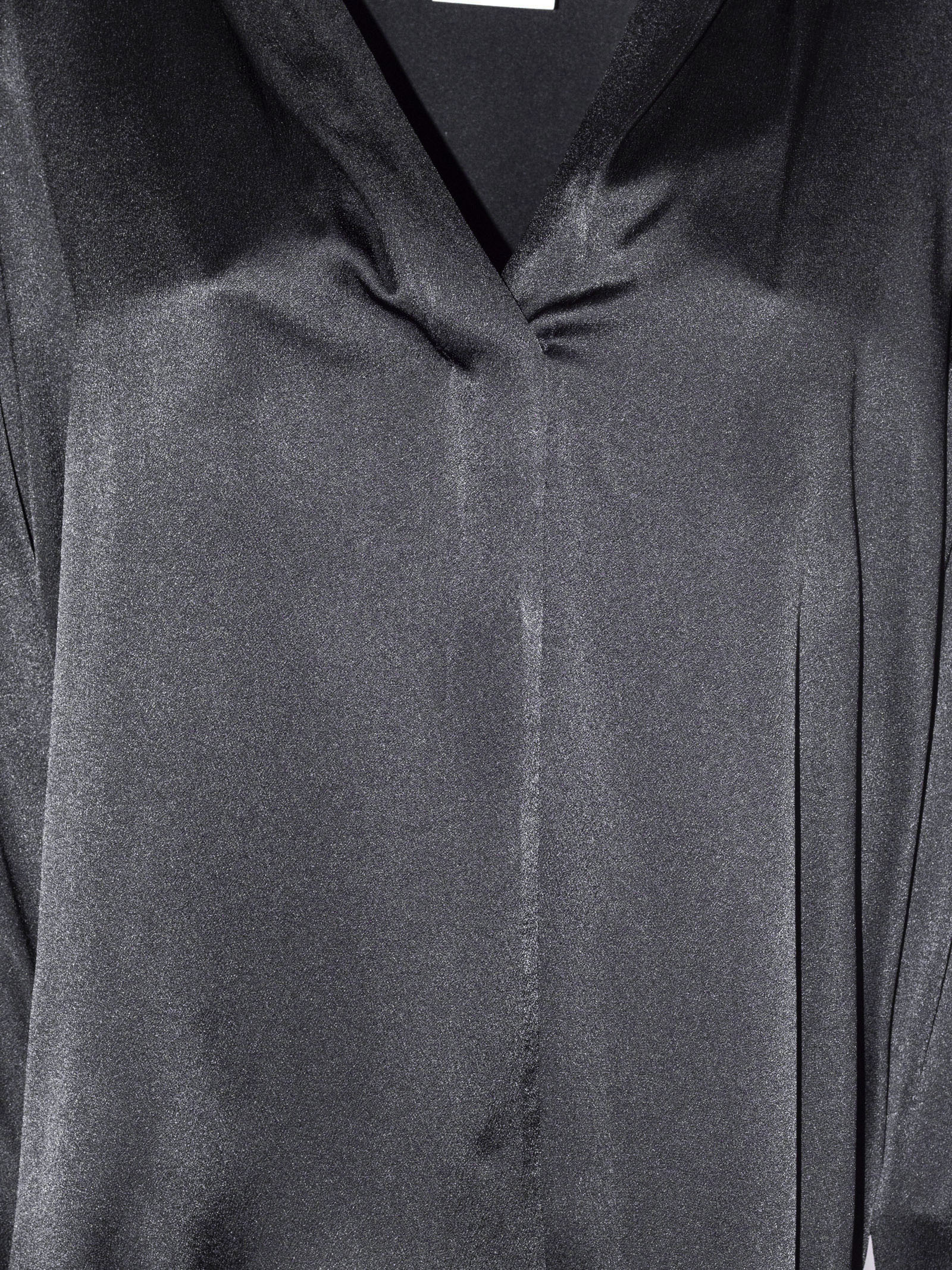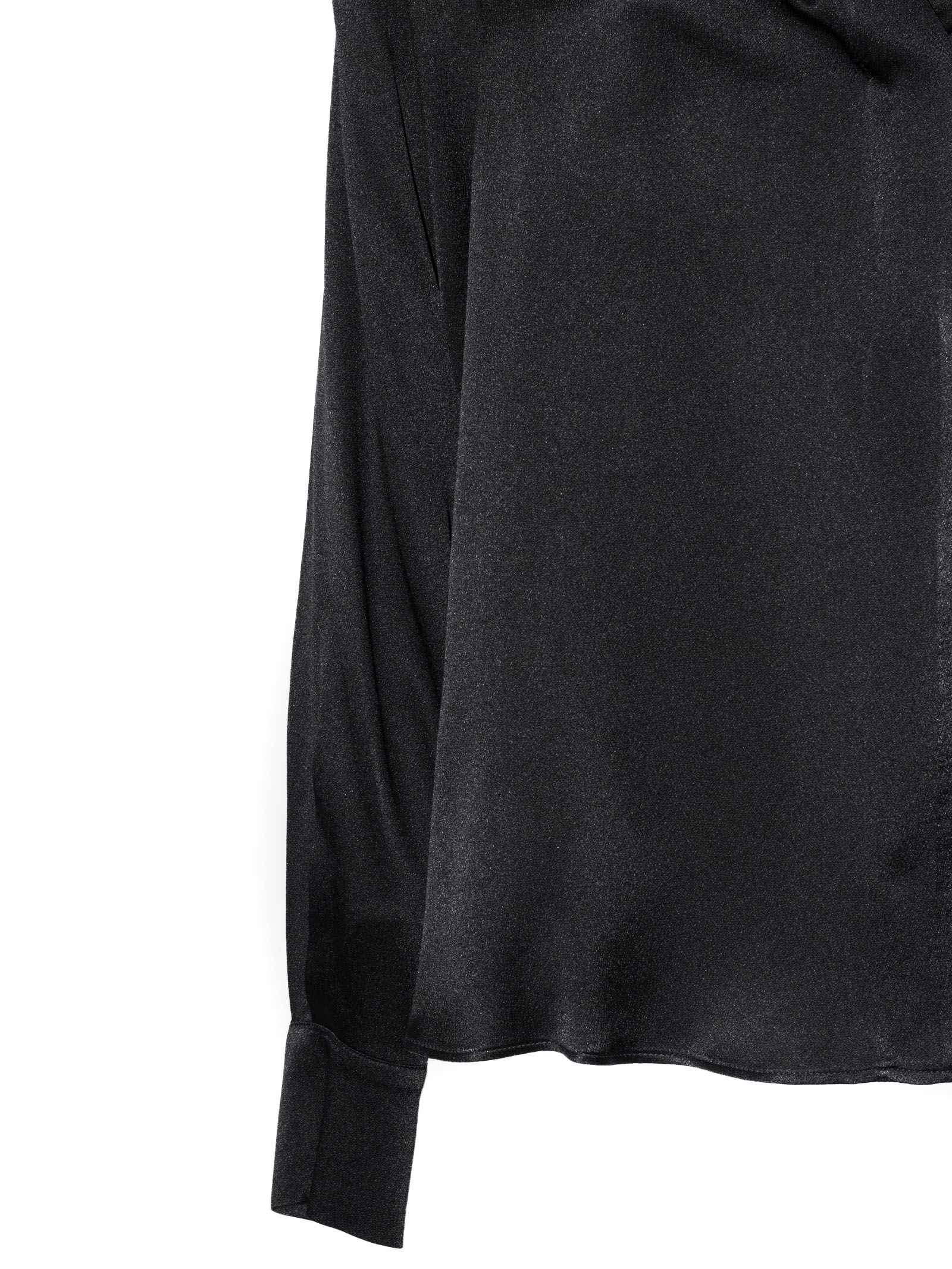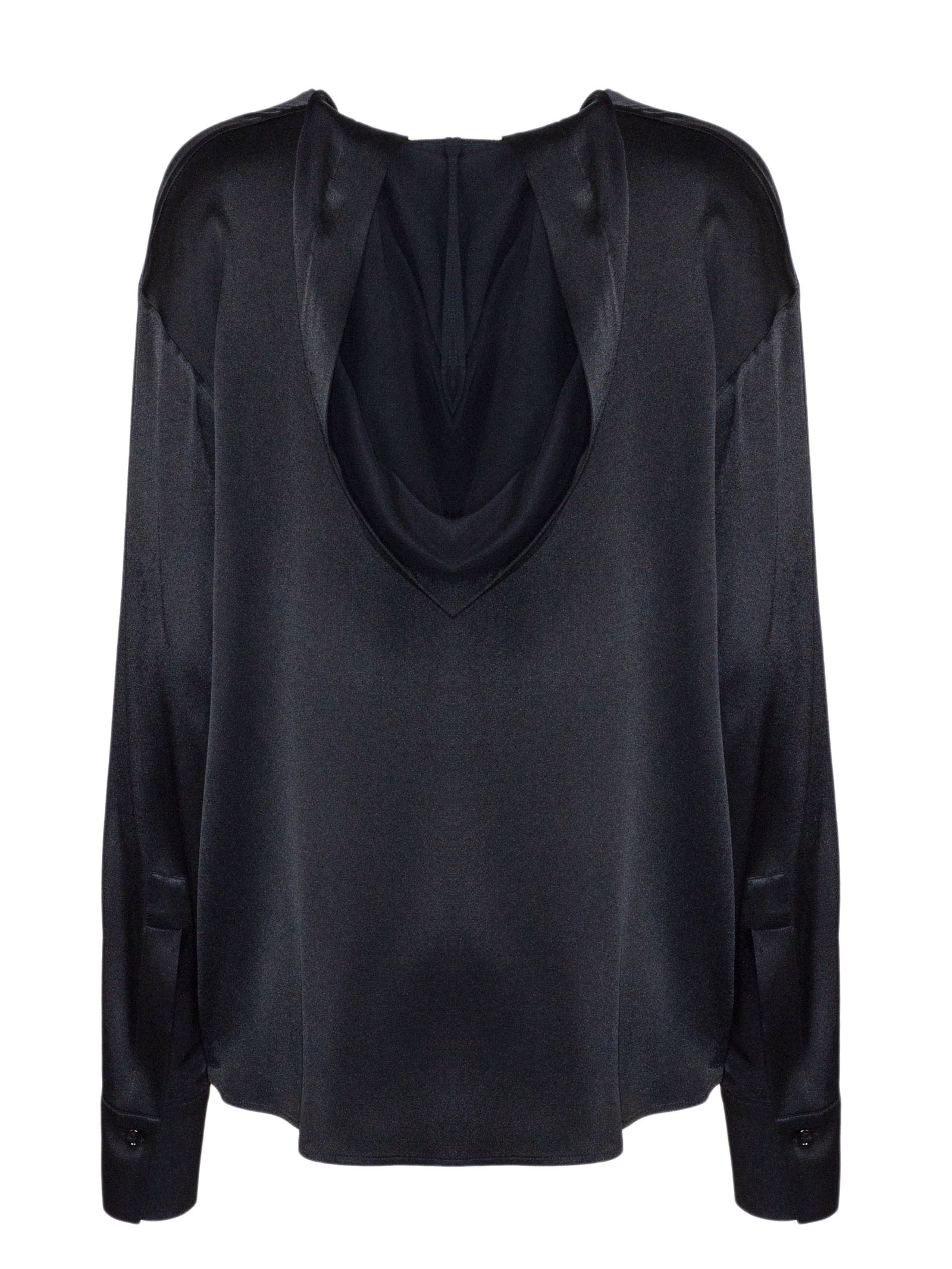 Blusa in seta nera con cappuccio, scollo a V morbido, maniche lunghe con polsini alti, linea fluida e vestibilità morbida