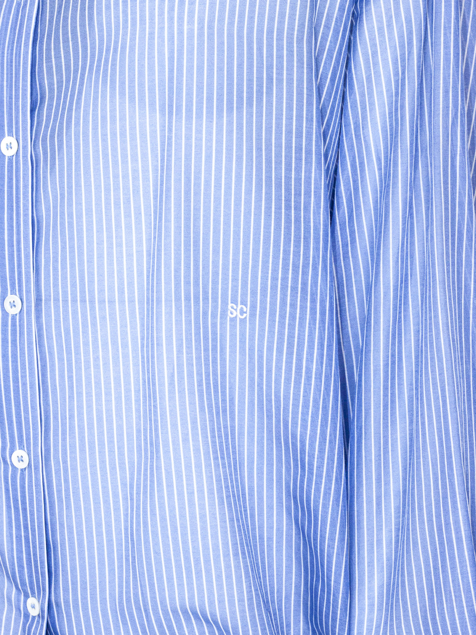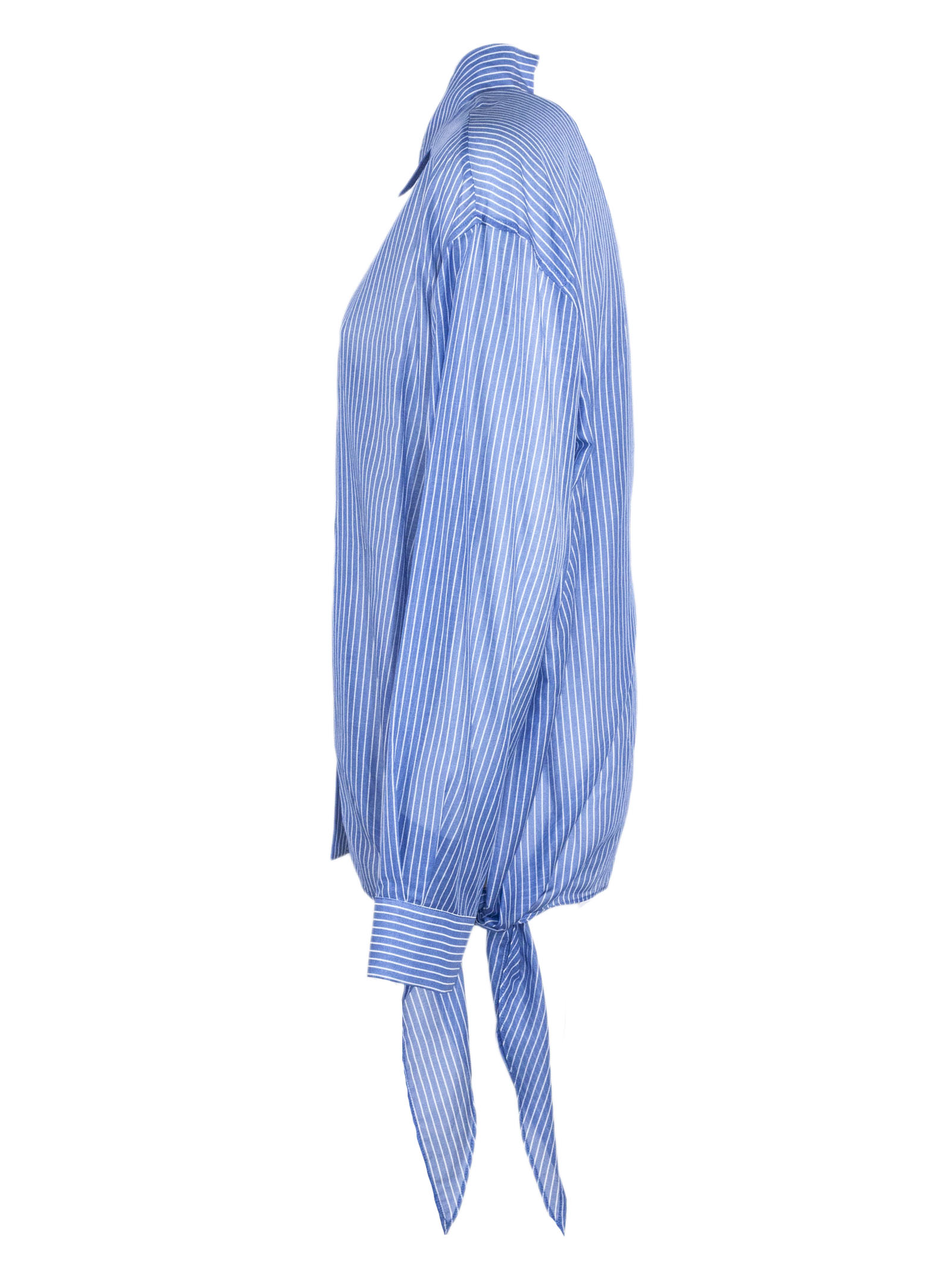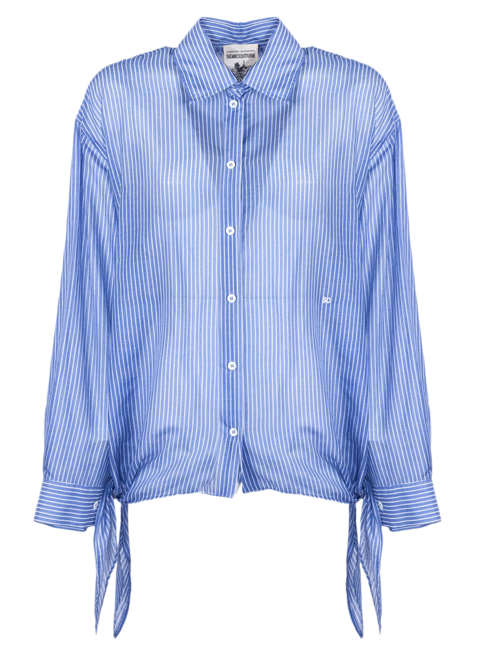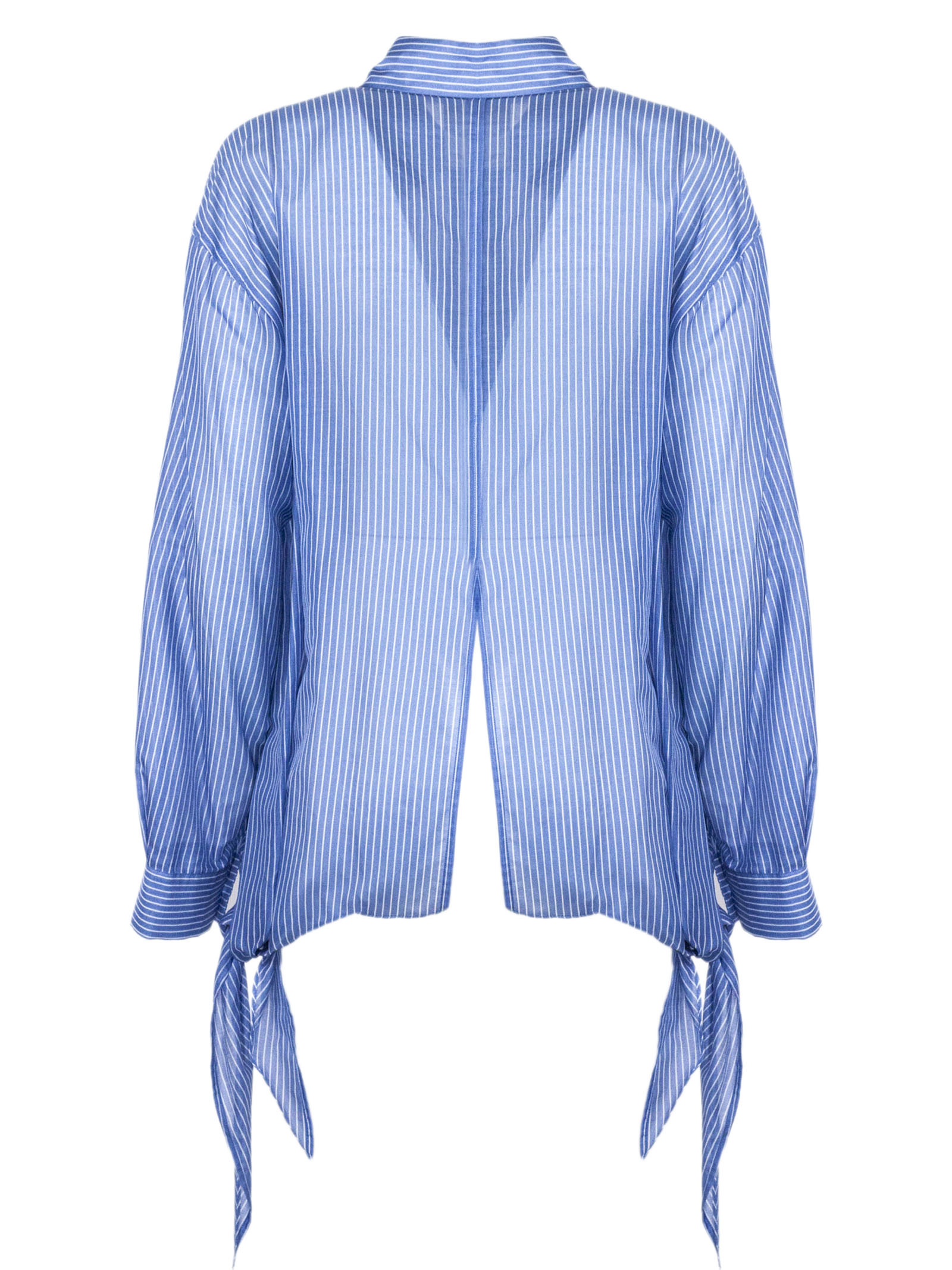 Camicia a righe verticali in misto cotone e seta blu e bianca, collo alla coreana con bottoni frontali, maniche lunghe con polsini, dettagli in pizzo laterali, vestibilità regolare