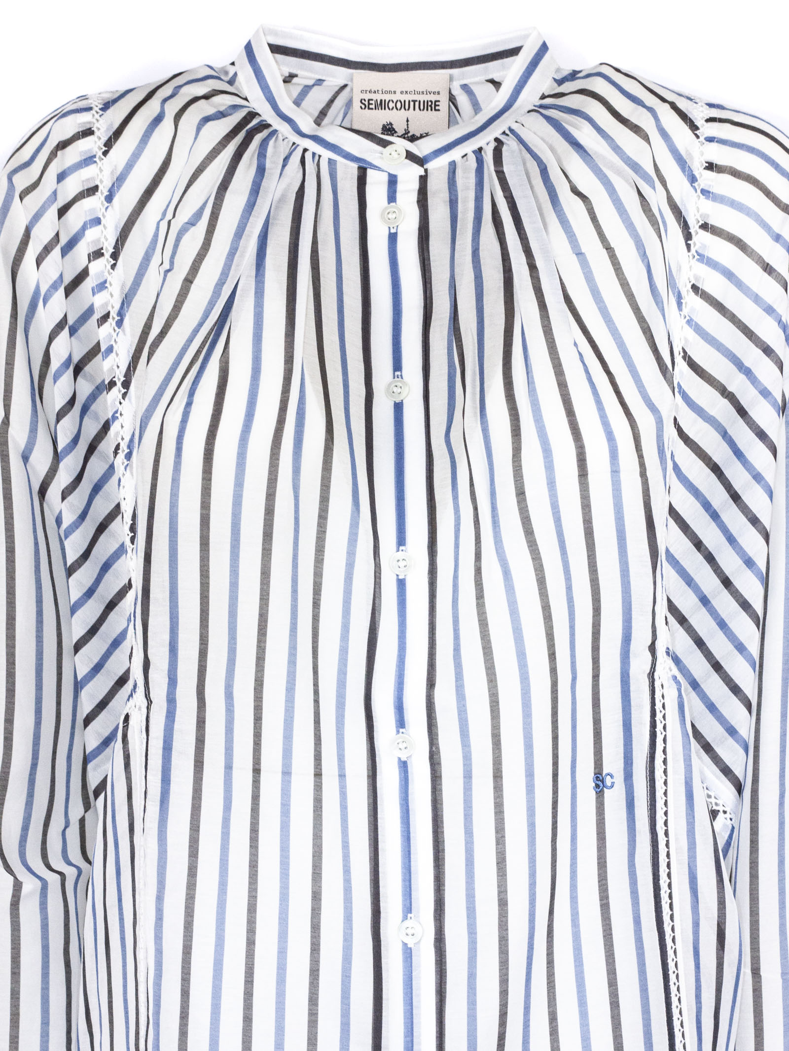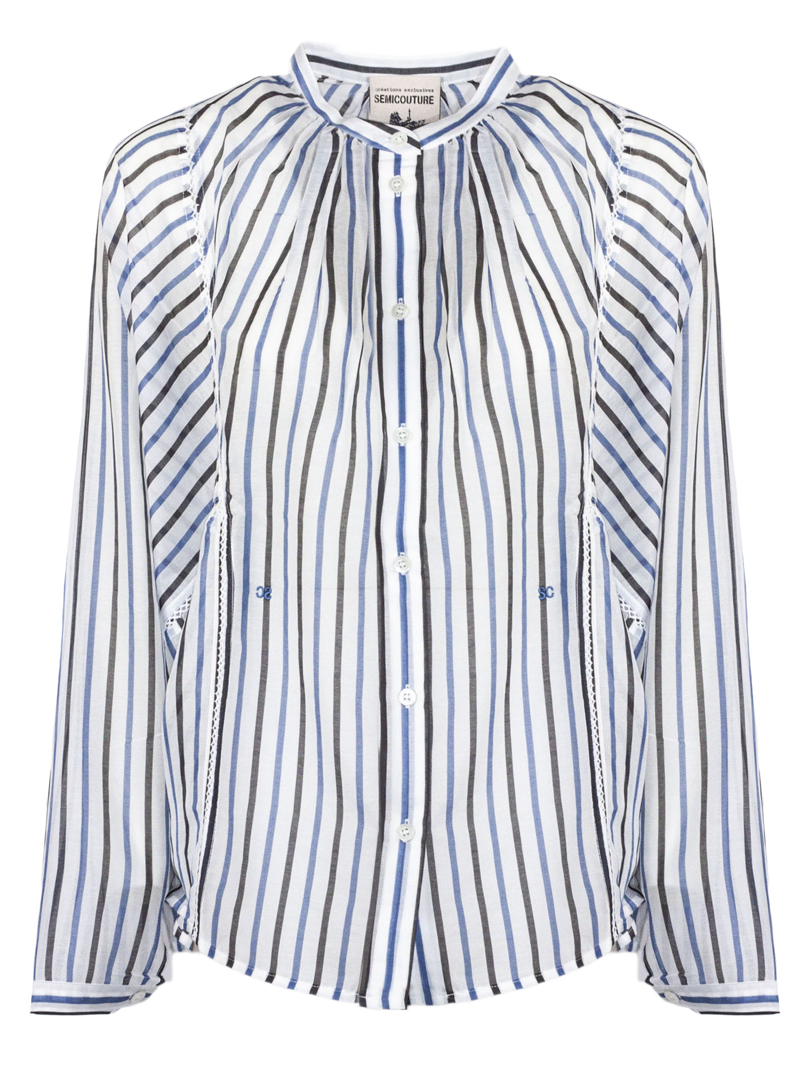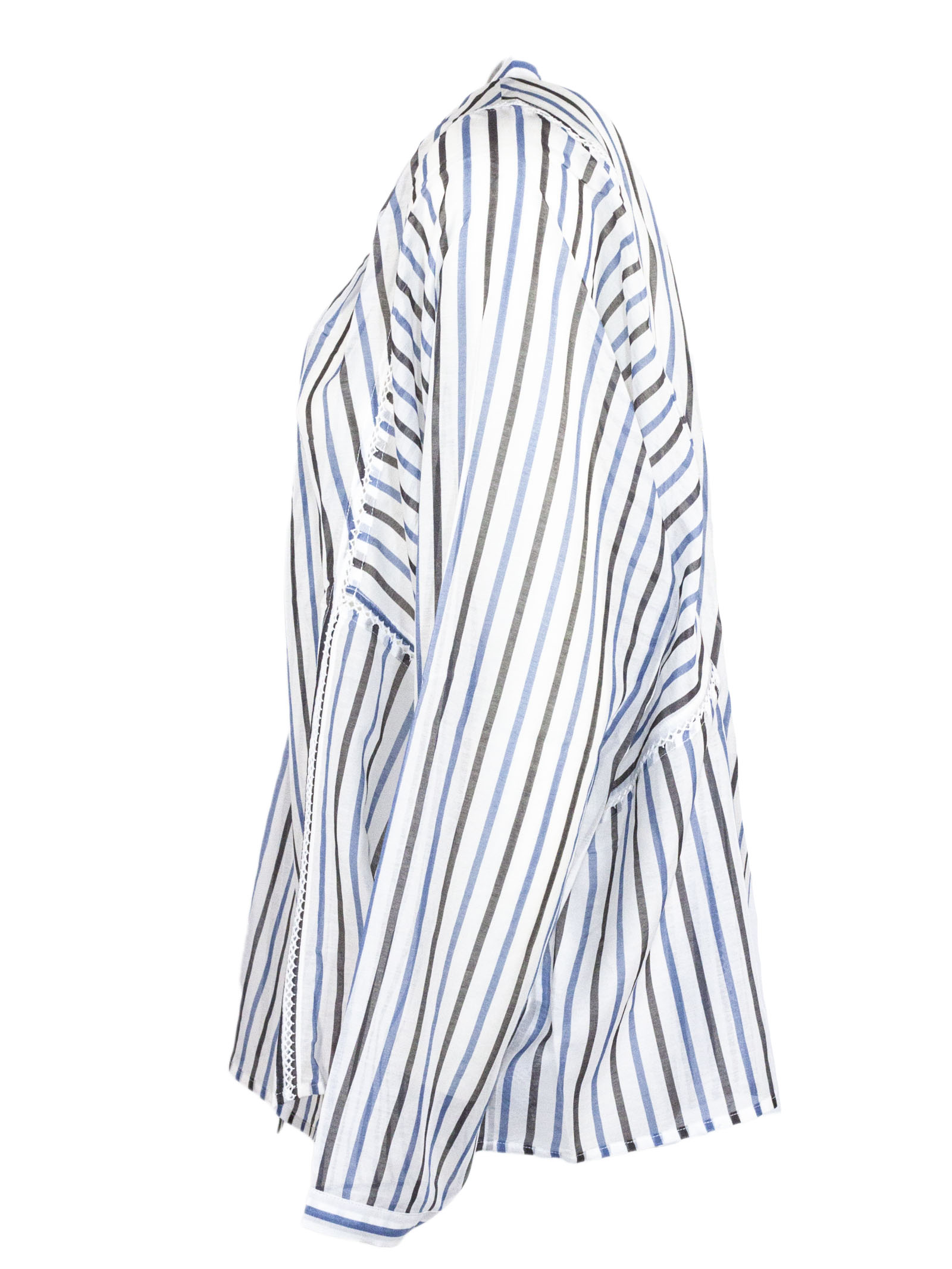 Camicia a righe verticali in misto cotone e seta bianche, blu e nere, collo alla coreana con bottoni frontali, maniche lunghe con polsini, dettagli in pizzo laterali, vestibilità regolare