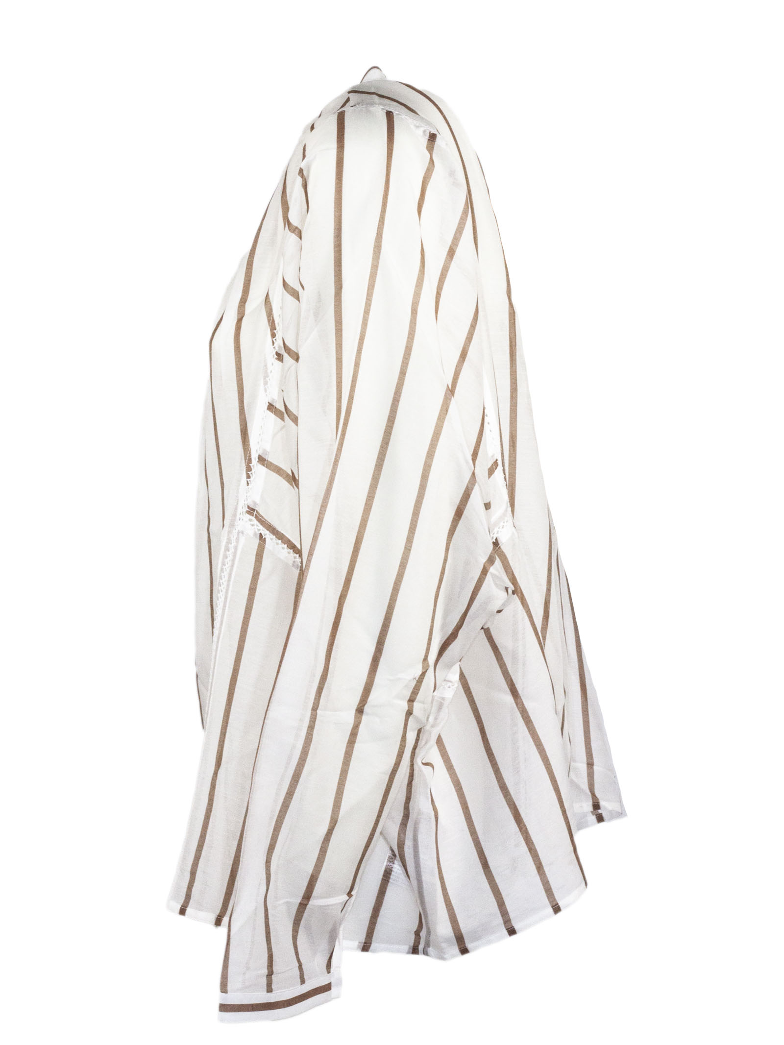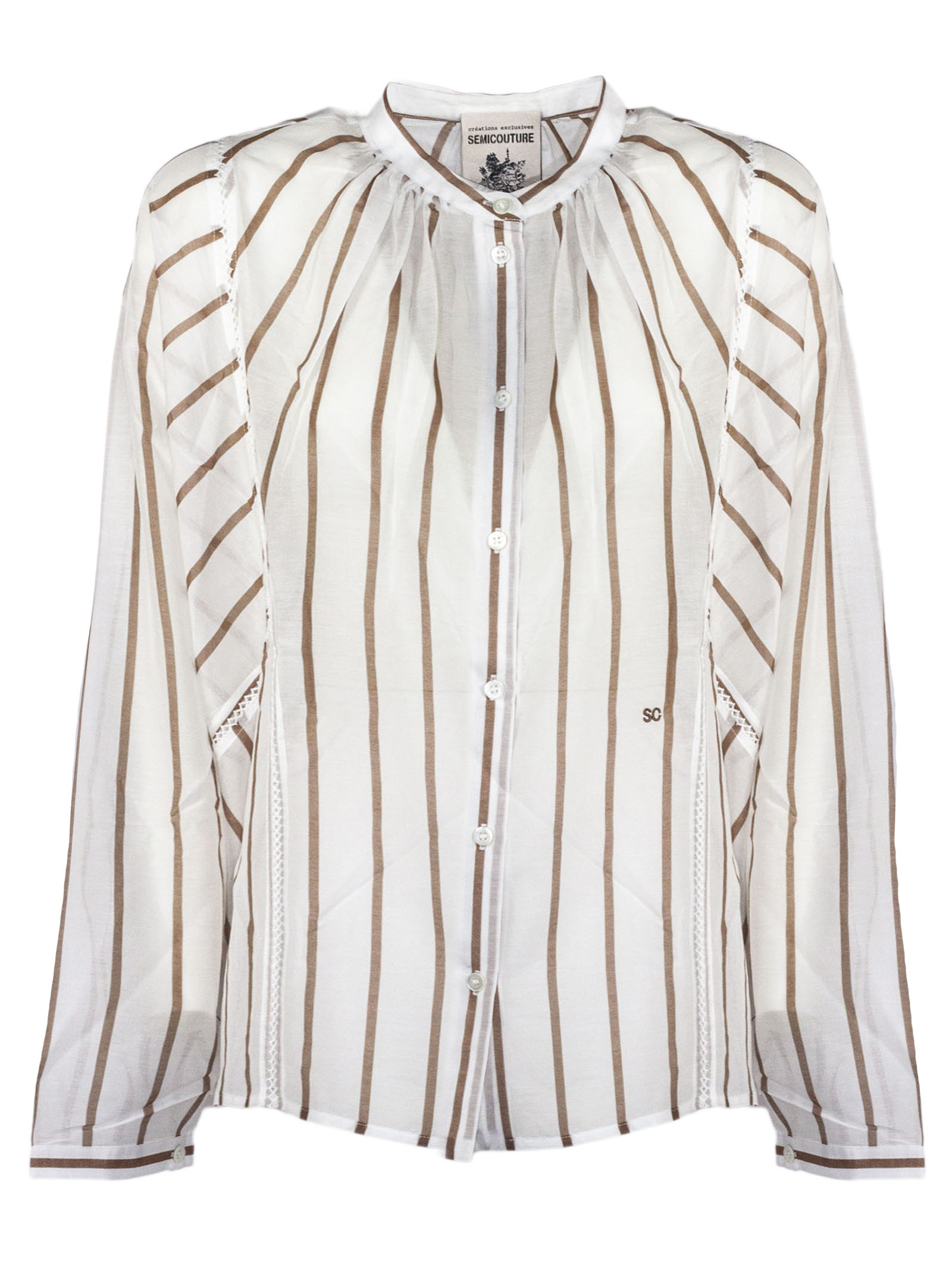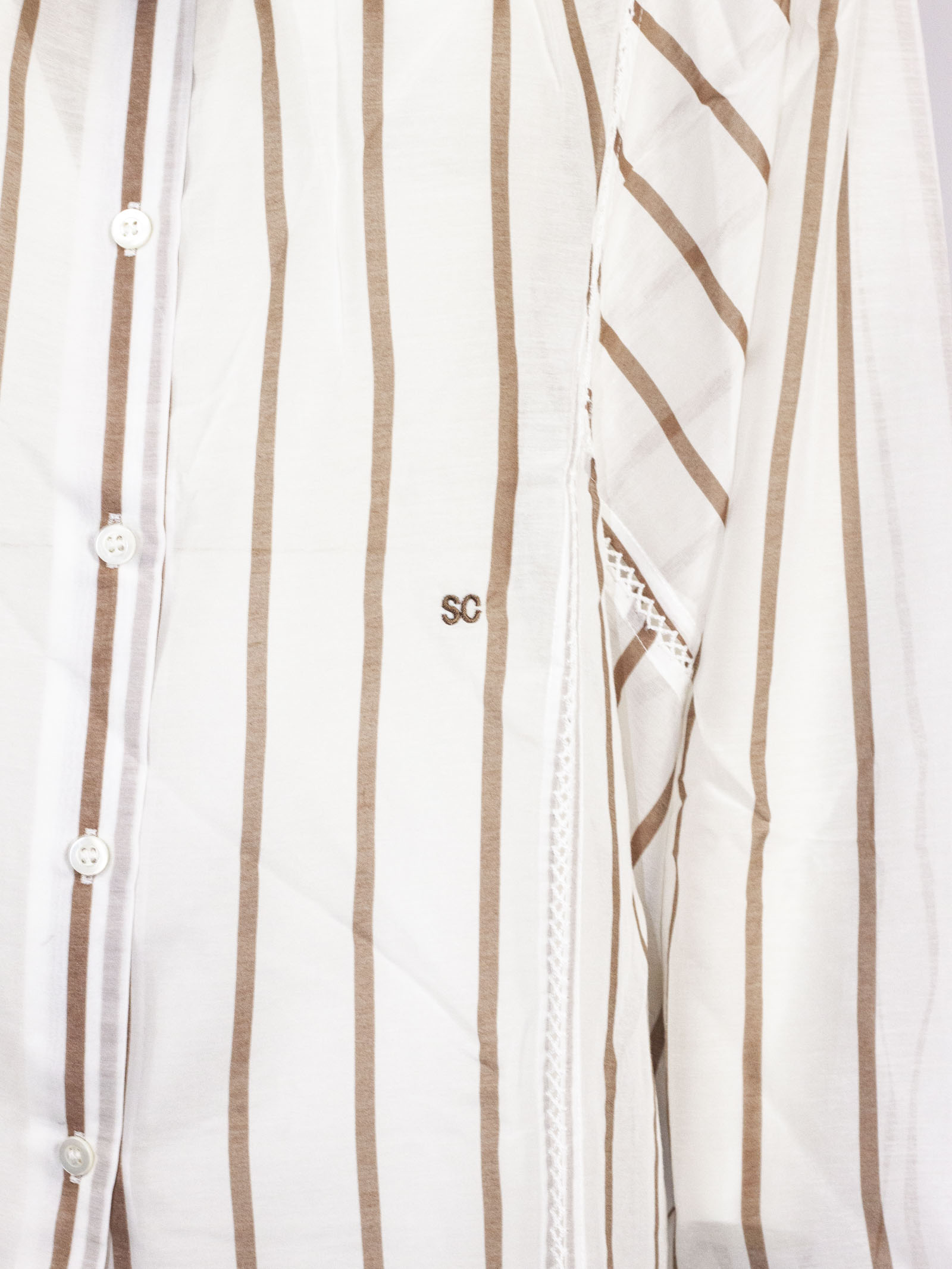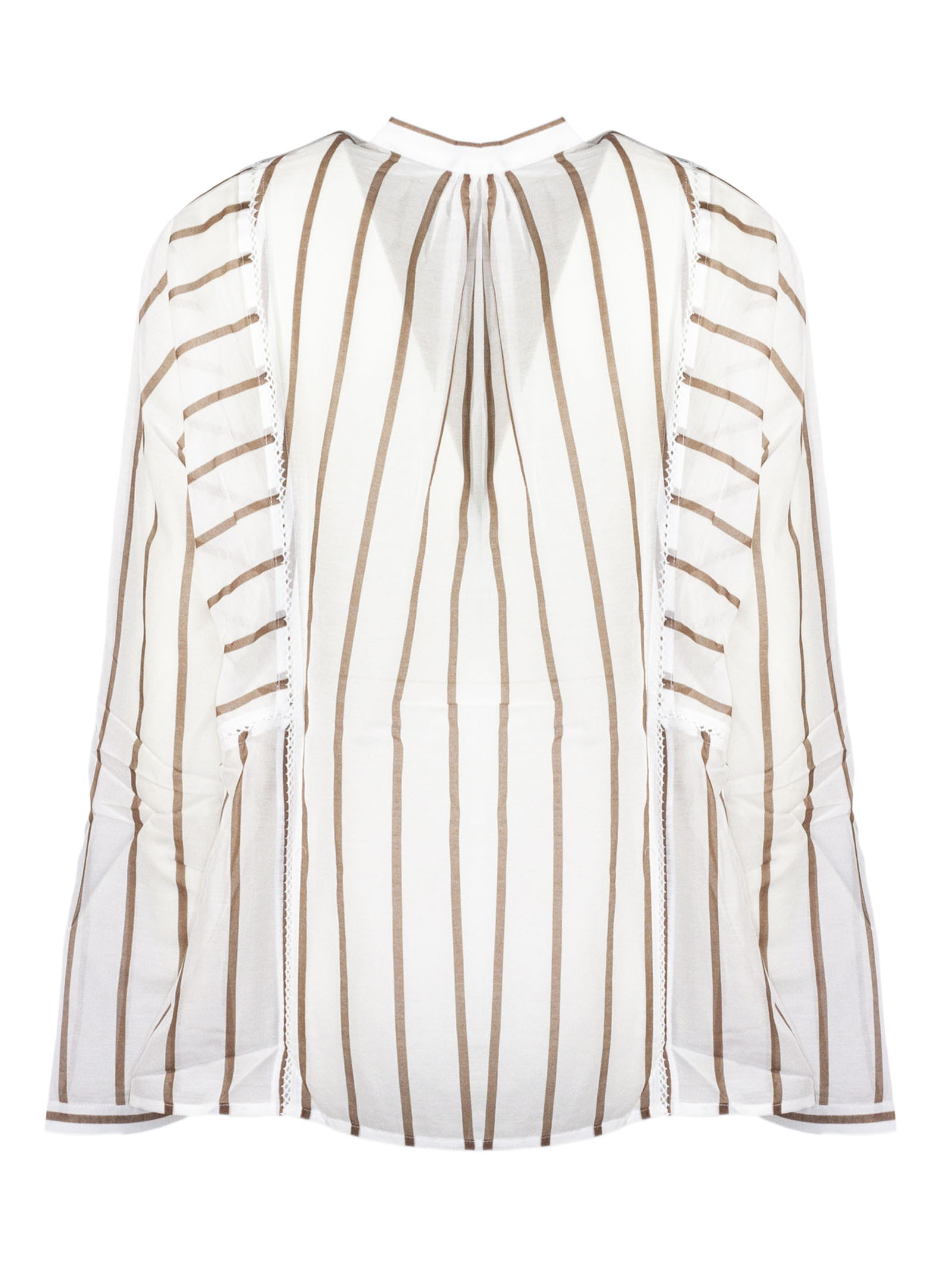 Camicia a righe verticali in misto cotone e seta bianche e marrone, collo alla coreana con bottoni frontali, maniche lunghe con polsini, dettagli in pizzo laterali, vestibilità regolare