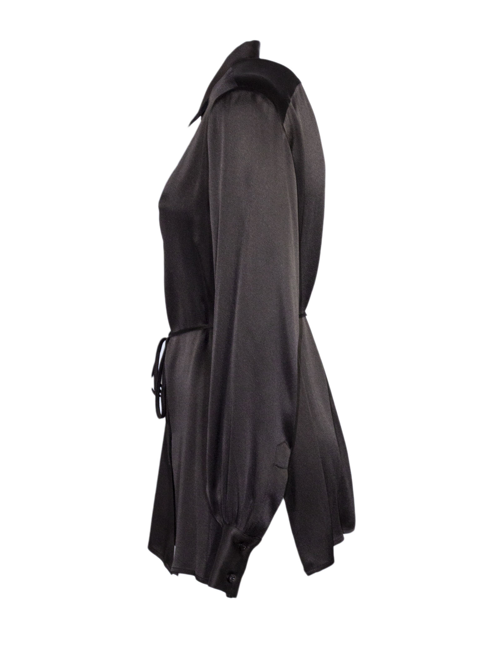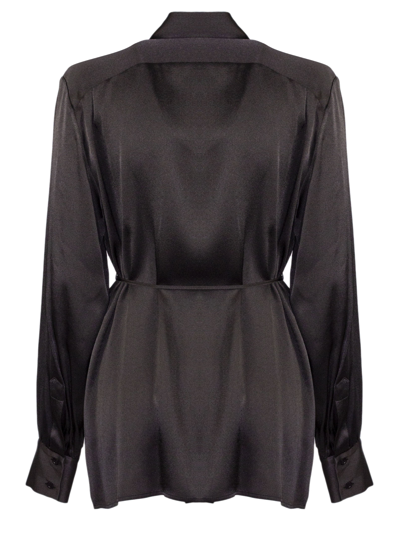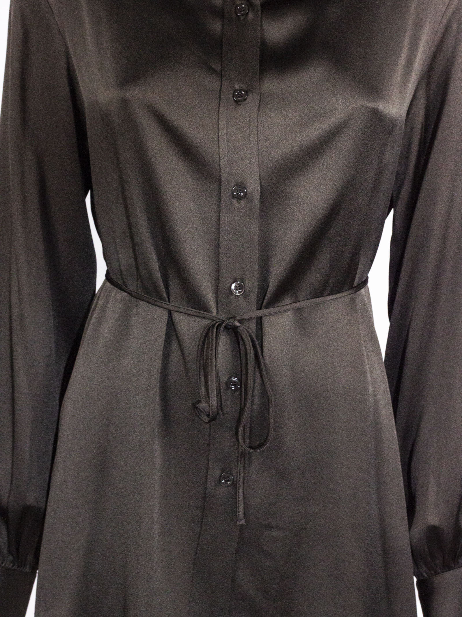 Camicia in misto seta marrone, linea fluida con taglio leggermente svasato, colletto classico, chiusura frontale con bottoni, maniche lunghe con polsini ampi, cintura sottile in vita da annodare, tessuto leggero e luminoso, vestibilità regolare
