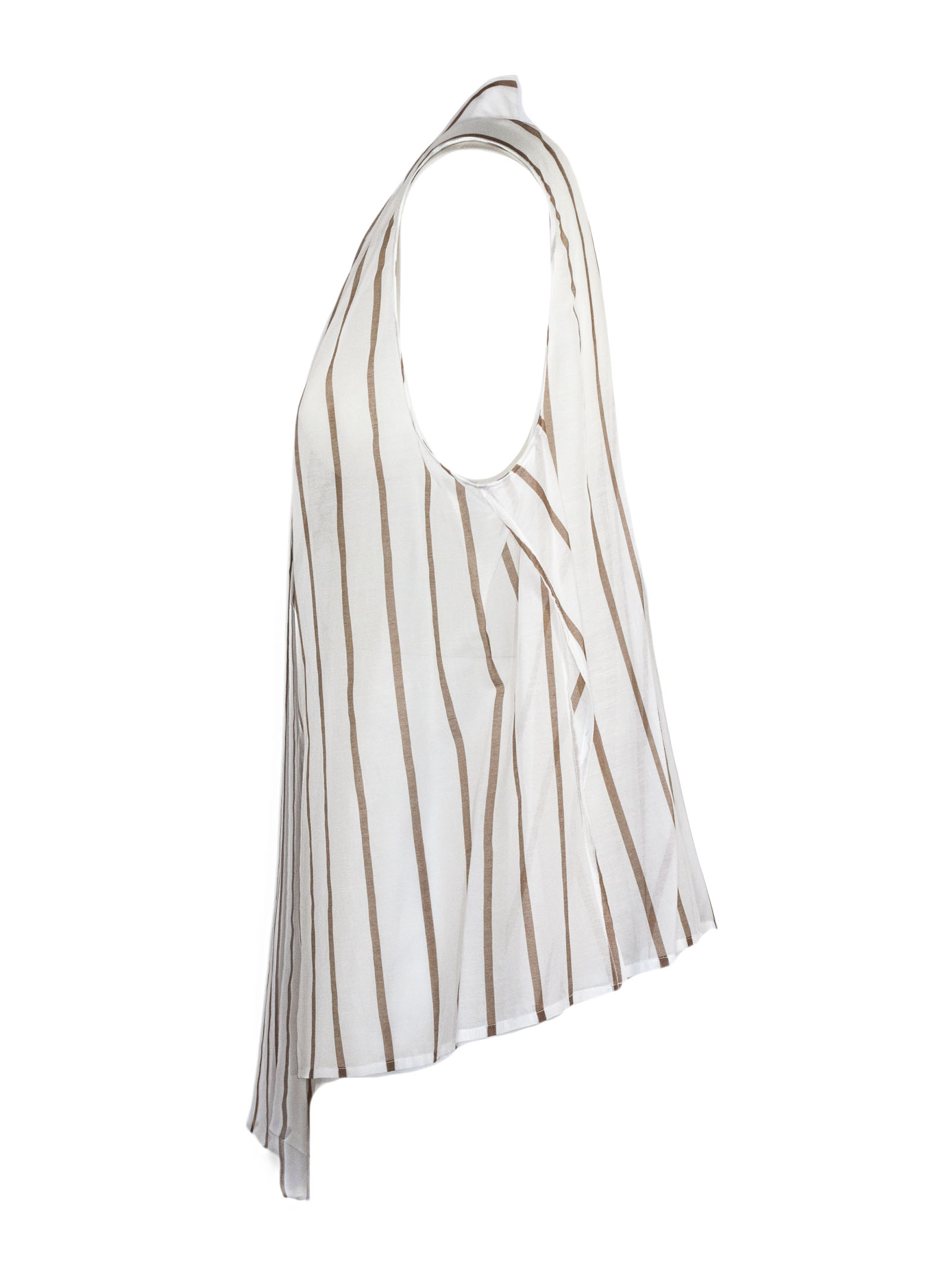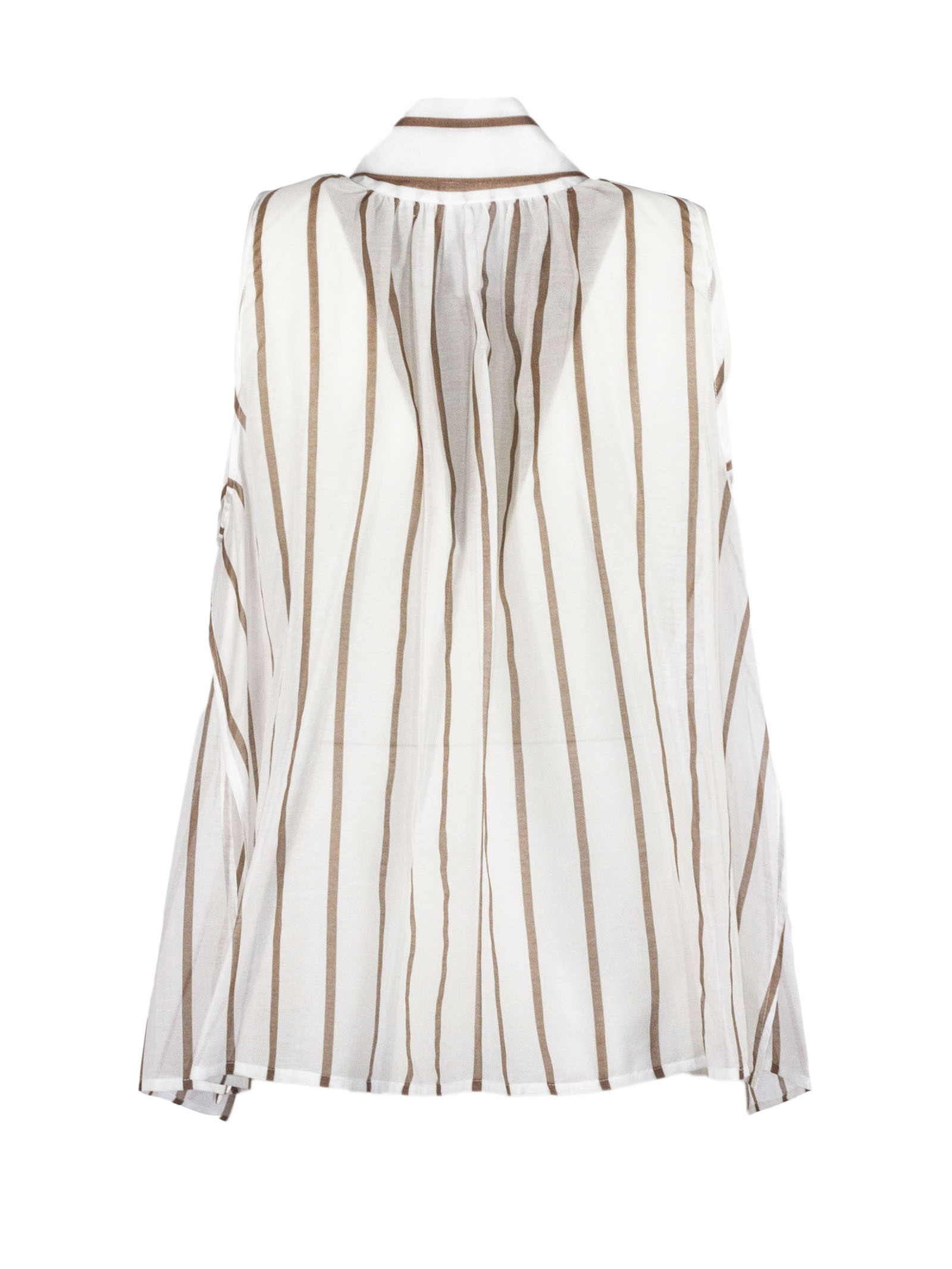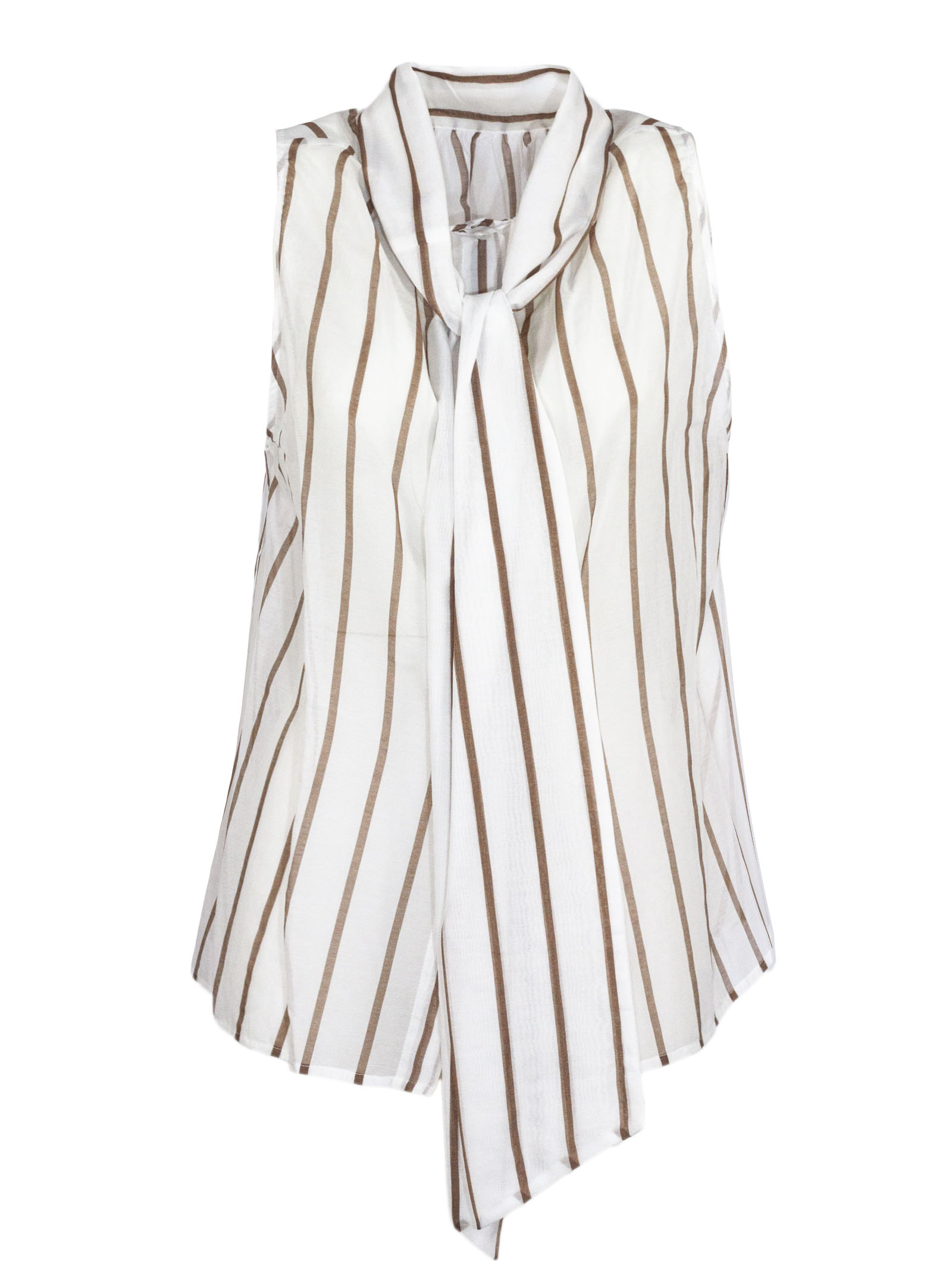 Camicia smanicata in cotone e seta, colore bianco con righe verticali beige, collo morbido con fiocco, vestibilità fluida e leggera