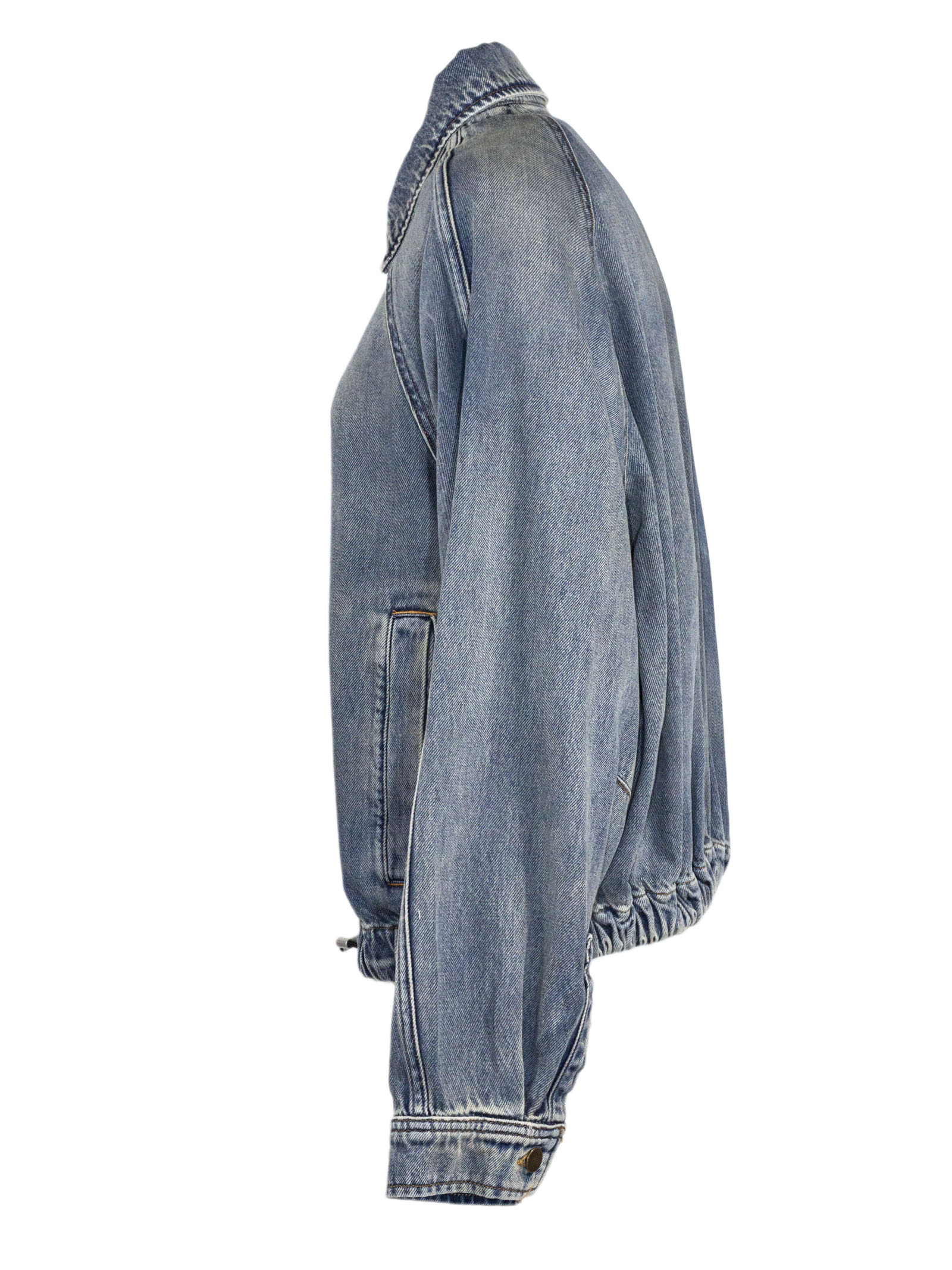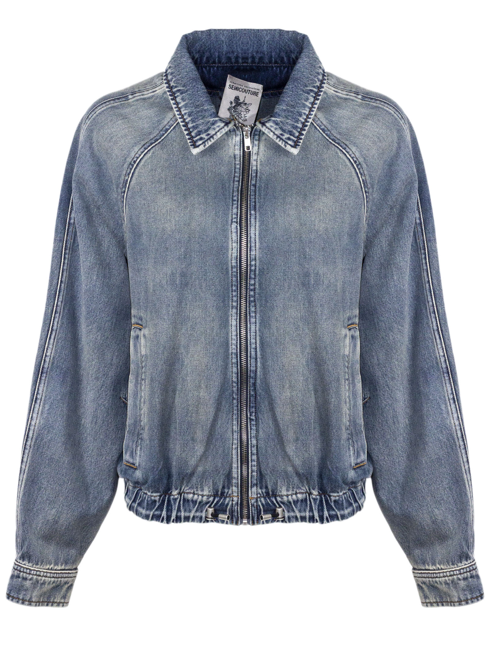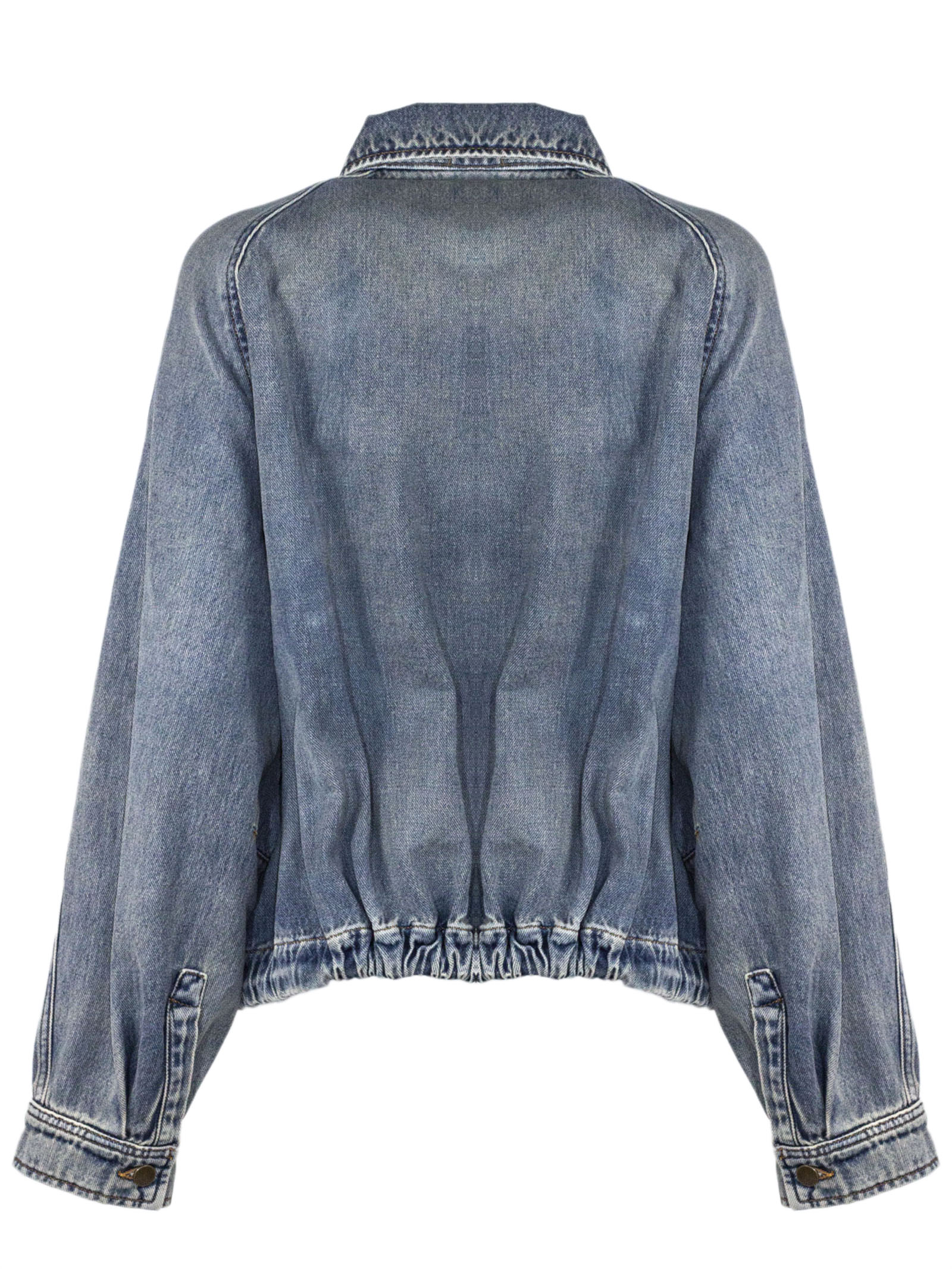 Giacca in denim di cotone blu chiaro, linea morbida, colletto classico, chiusura frontale con zip, maniche lunghe con polsini, tasche laterali a filetto, fondo con coulisse regolabile, lavaggio blu medio leggermente slavato, vestibilità regolare