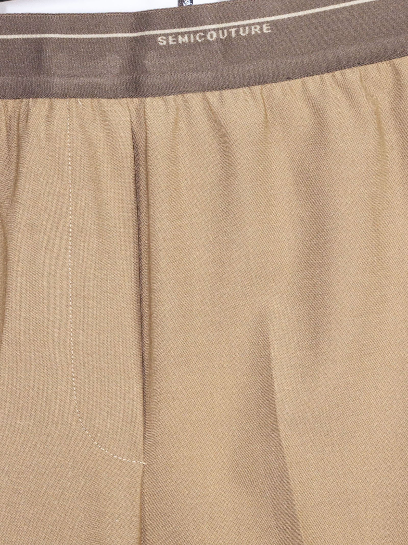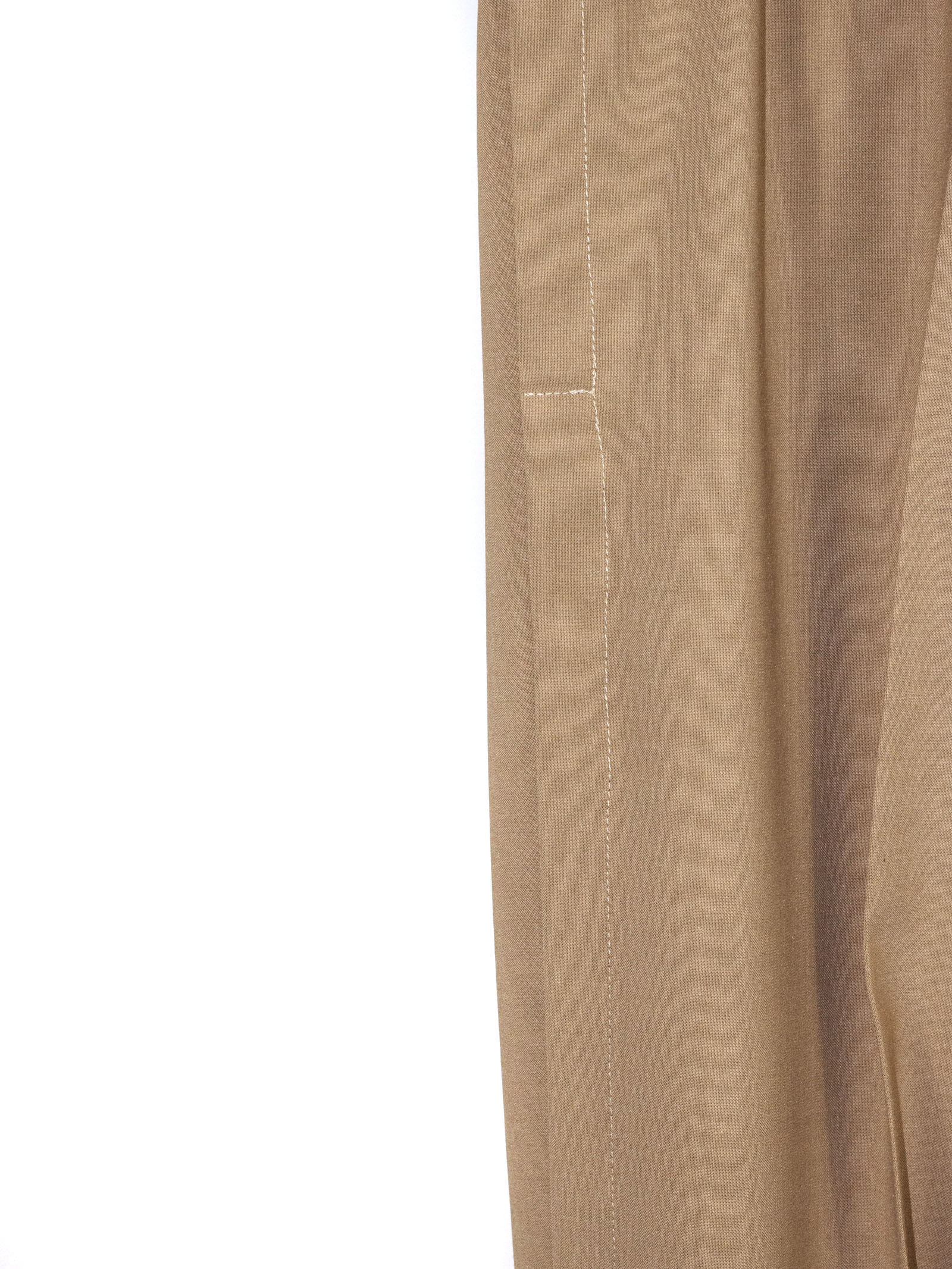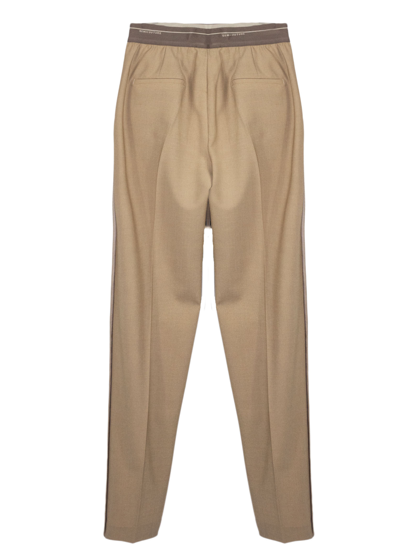 Pantalone in misto lana vergine beige, vita elasticizzata con fascia a contrasto, linea dritta con piega frontale, vestibilità regolare