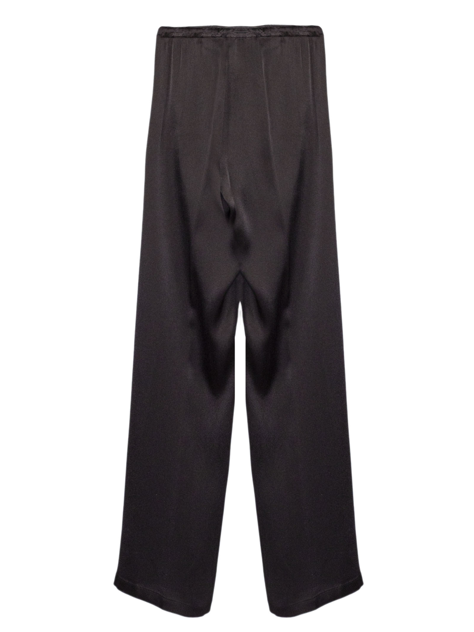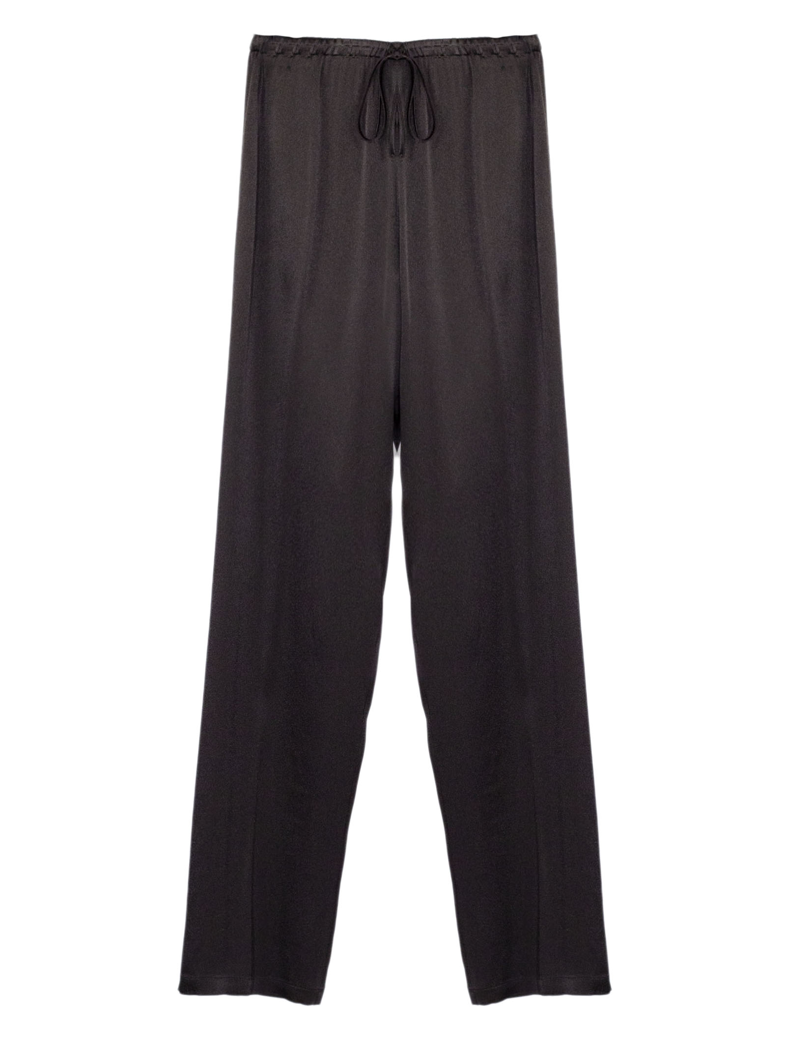 Pantalone testa di moro in misto seta, linea morbida e fluida, vita elasticizzata con coulisse regolabile, gamba ampia con piega centrale, tessuto leggero e confortevole, vestibilità rilassata ed elegante