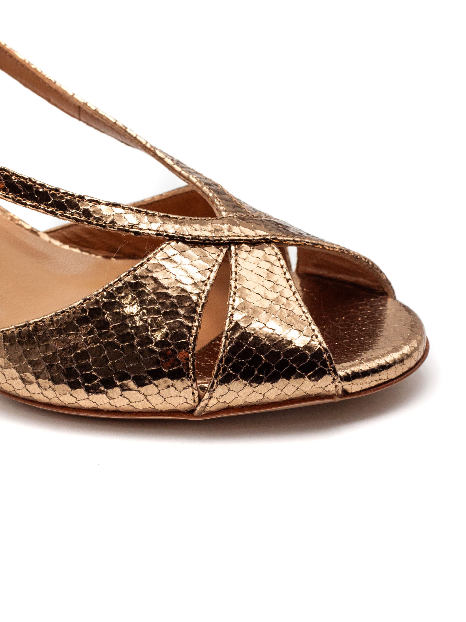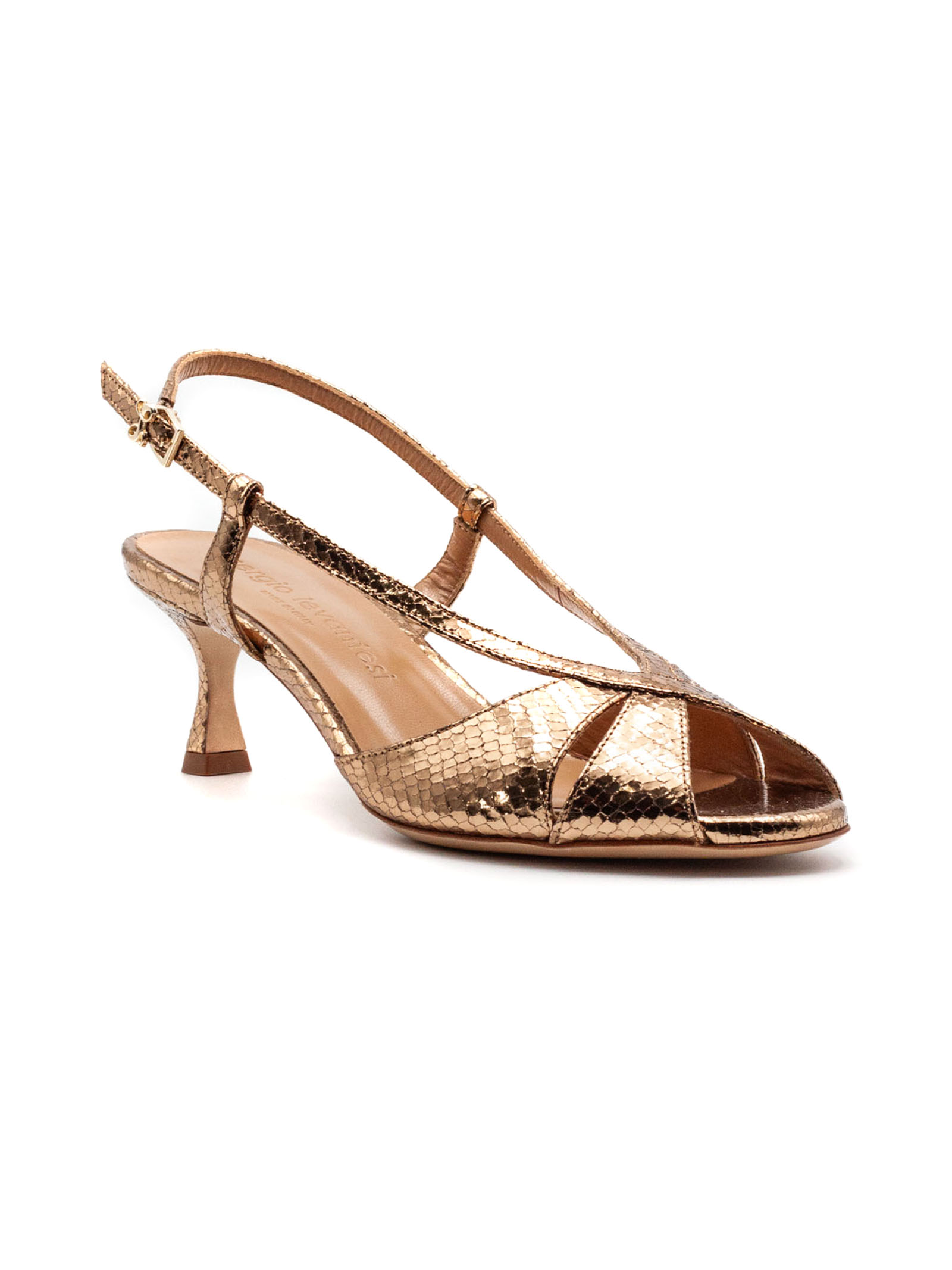 Sandalo slingback Edna con design a T, tomaia in pelle effetto laminato oro con texture rettile, punta aperta con motivo incrociato e piccolo cut-out centrale, cinturino posteriore regolabile con fibbia metallica, tacco medio sagomato, interno foderato in pelle, soletta confortevole, suola in cuoio