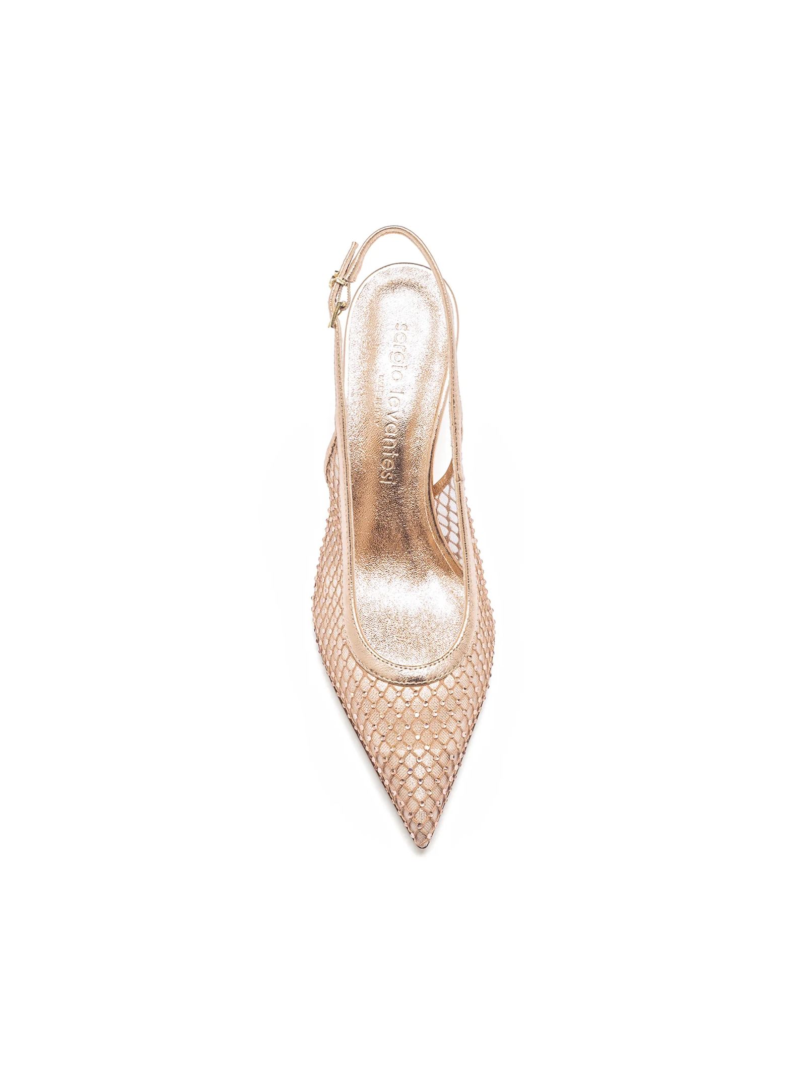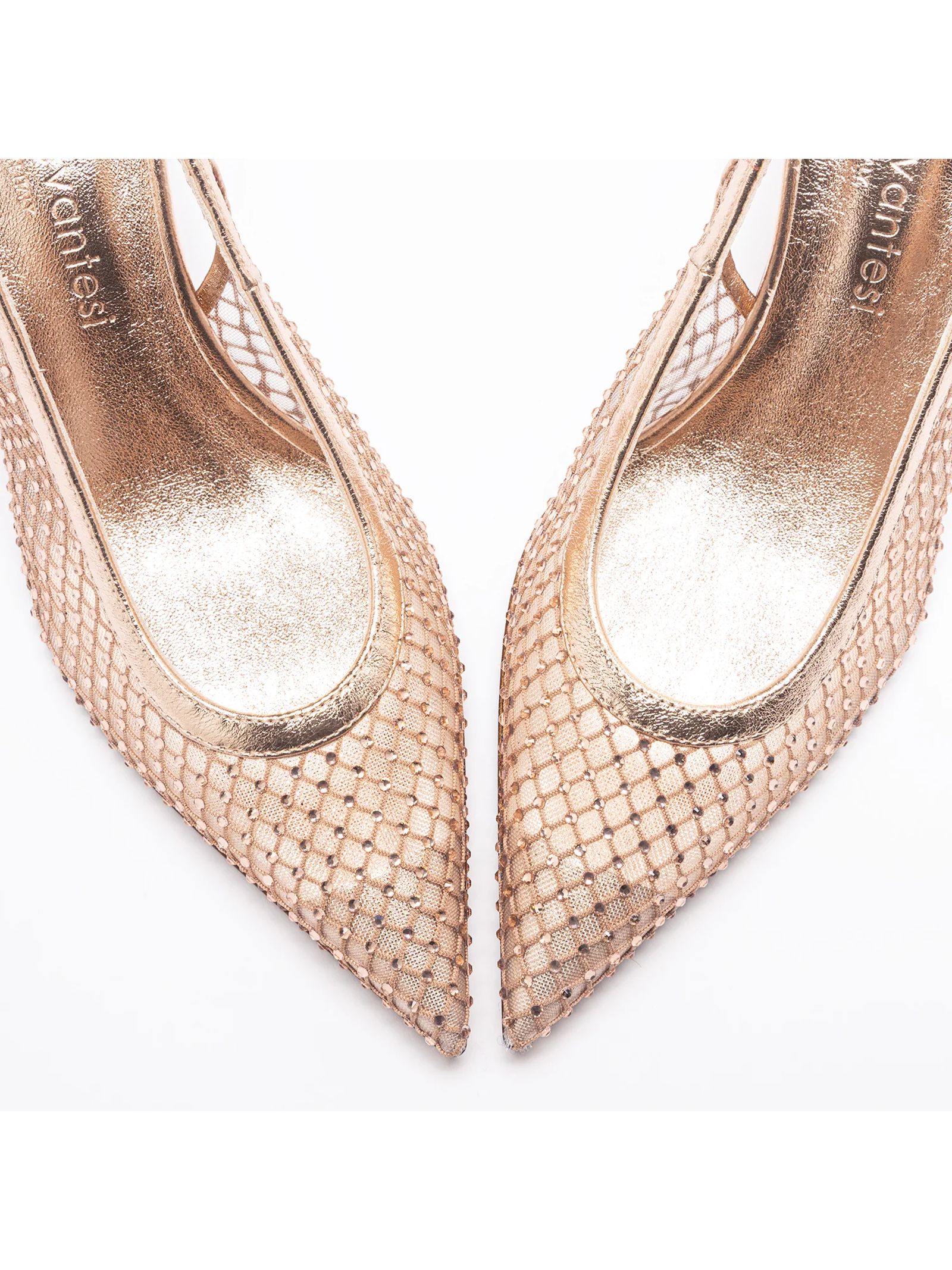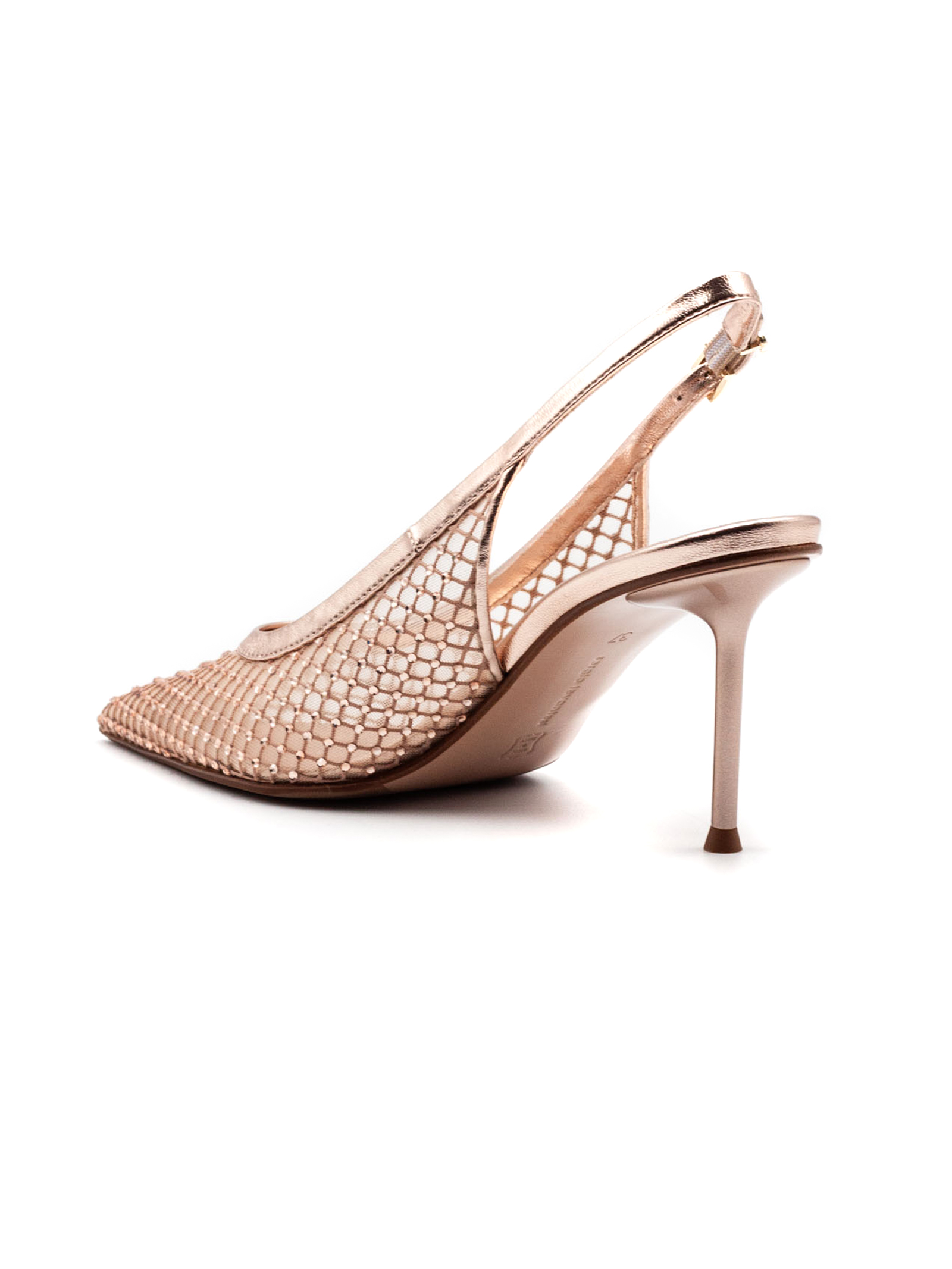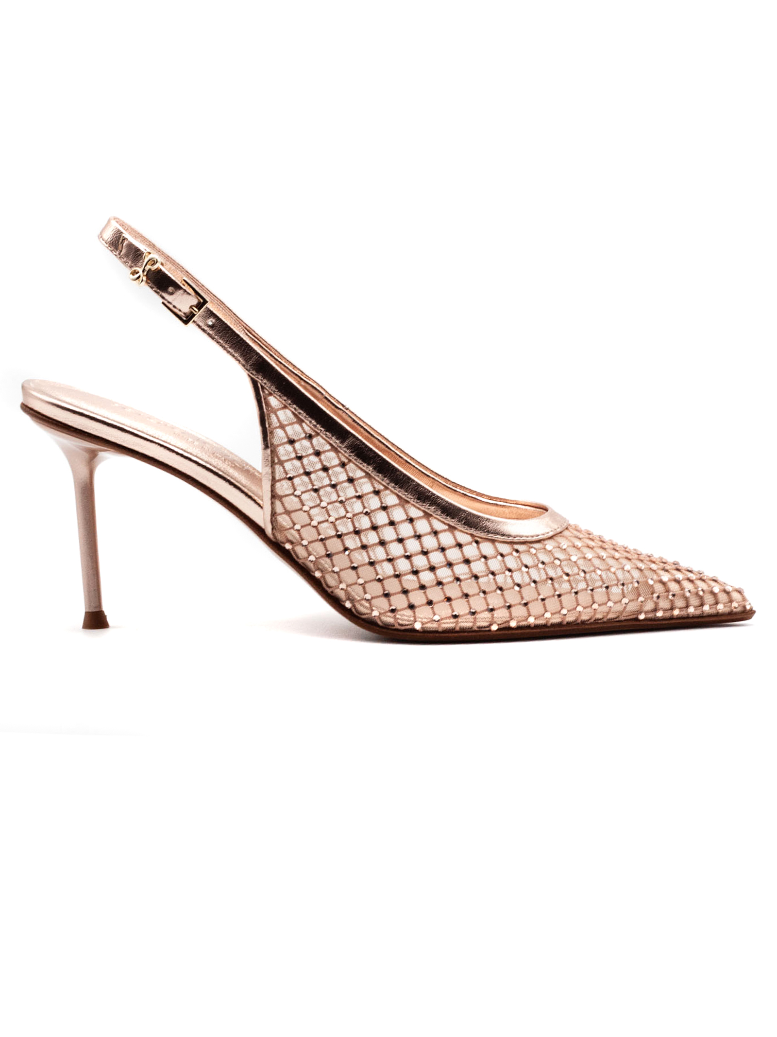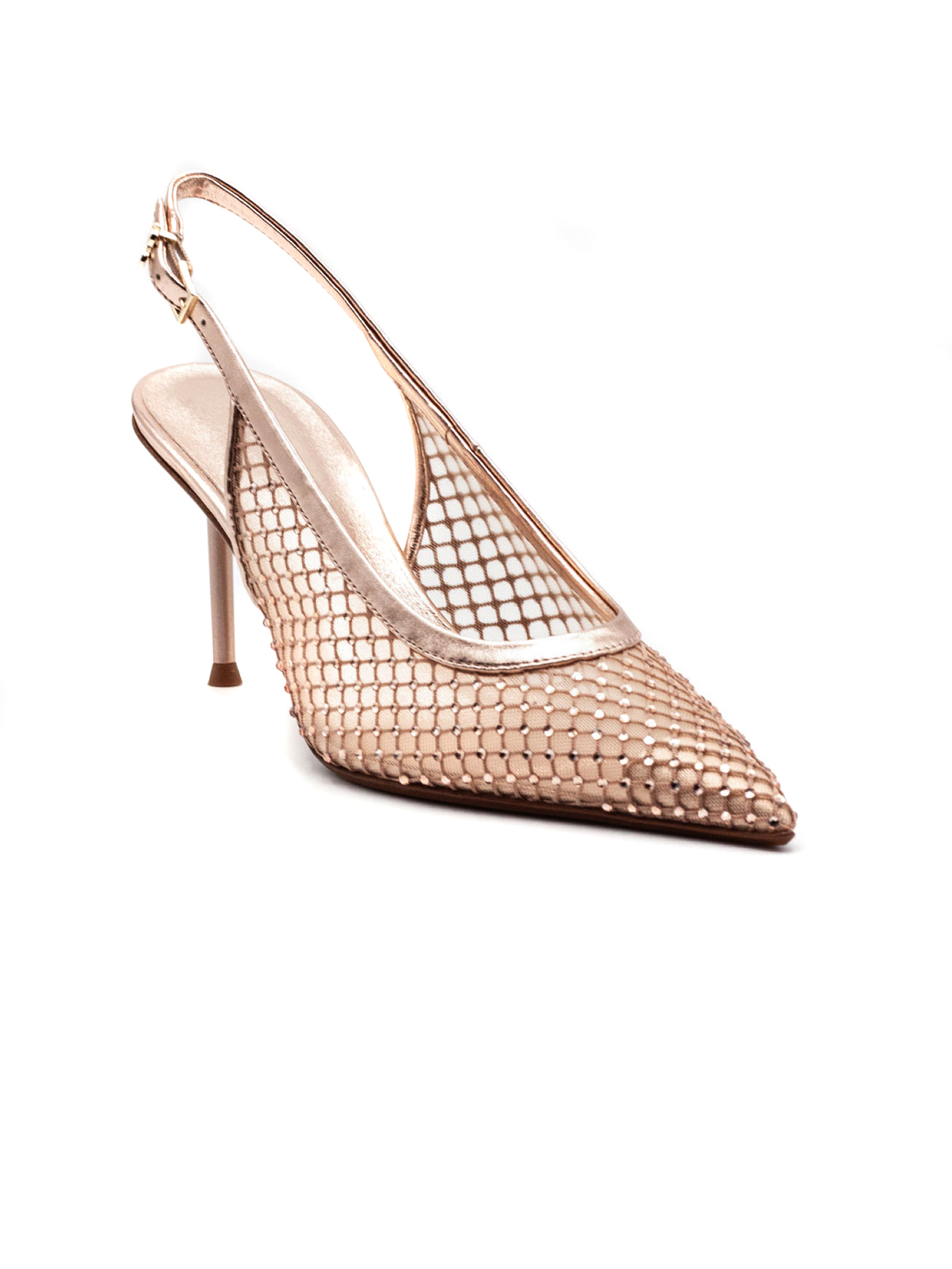 Slingback Greta in mesh e pelle color oro rosa, punta affusolata e tacco a spillo, tomaia in rete mesh con finiture effetto metallizzato, cinturino posteriore regolabile con fibbia e design leggero e traspirante, altezza tacco 6 cm
