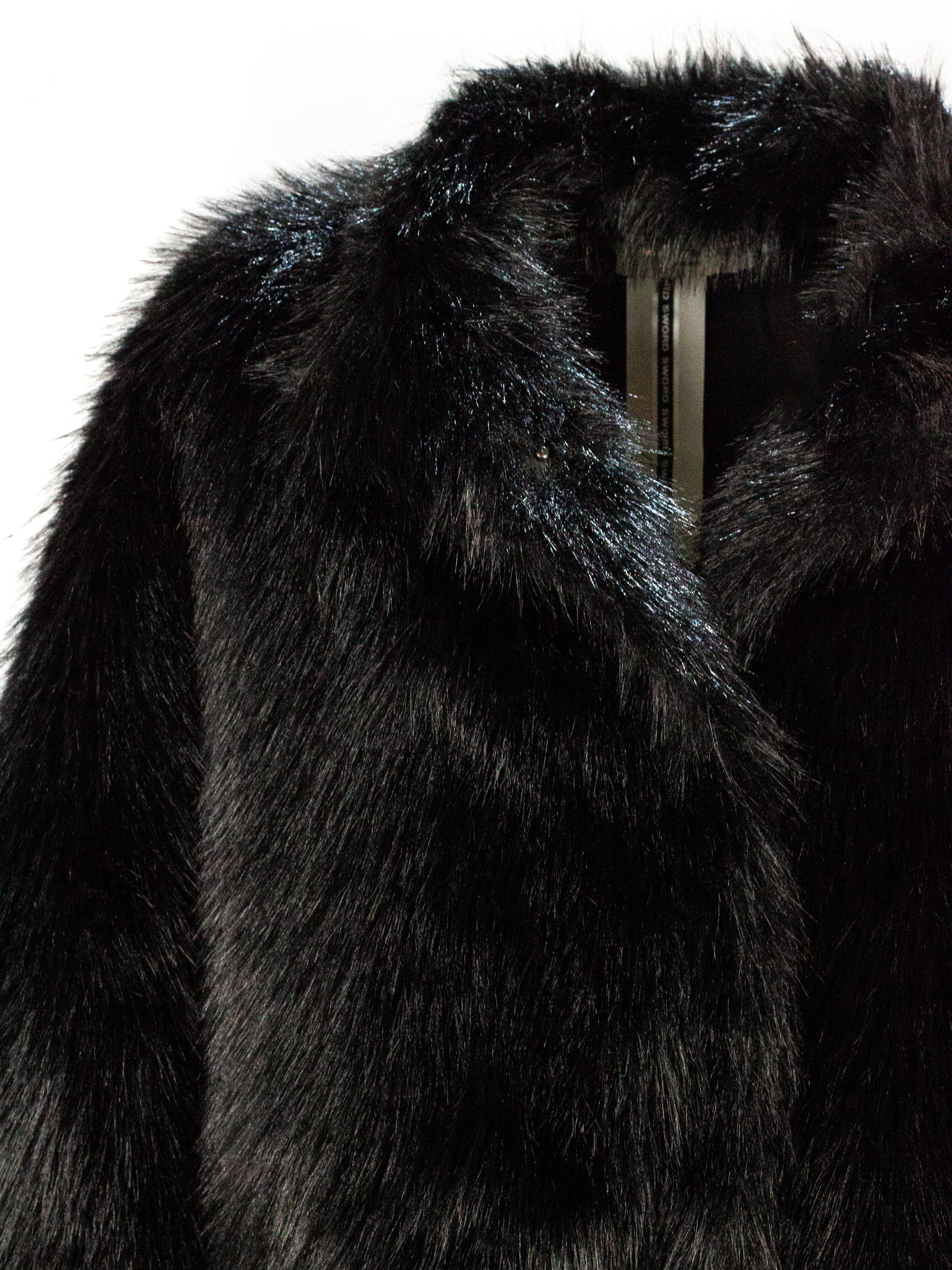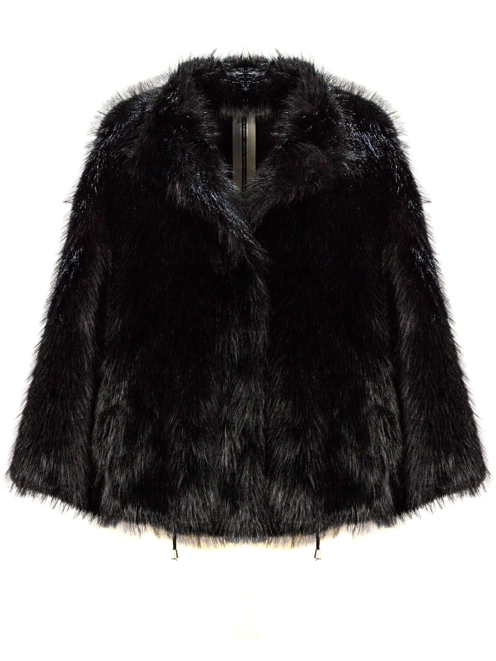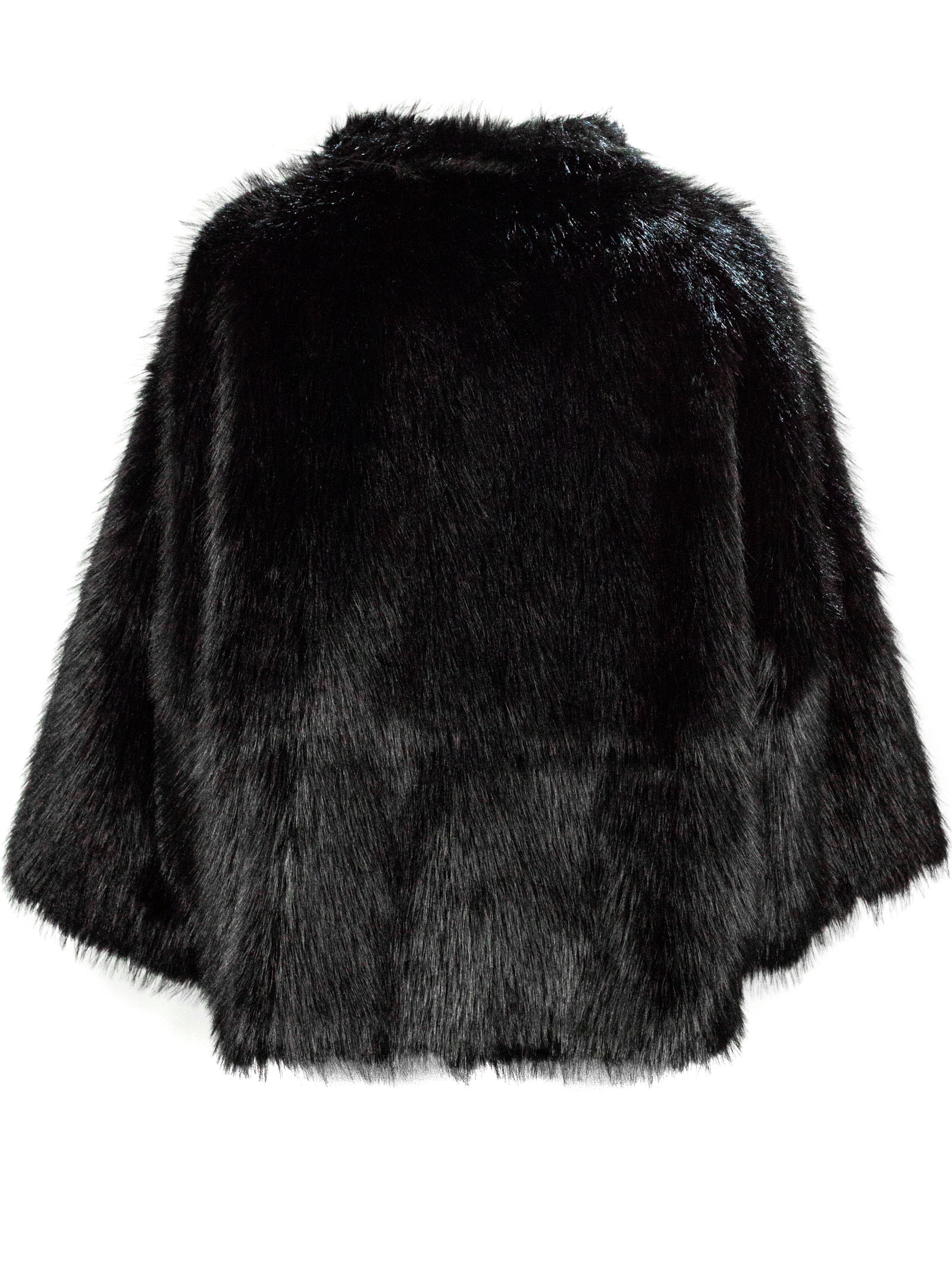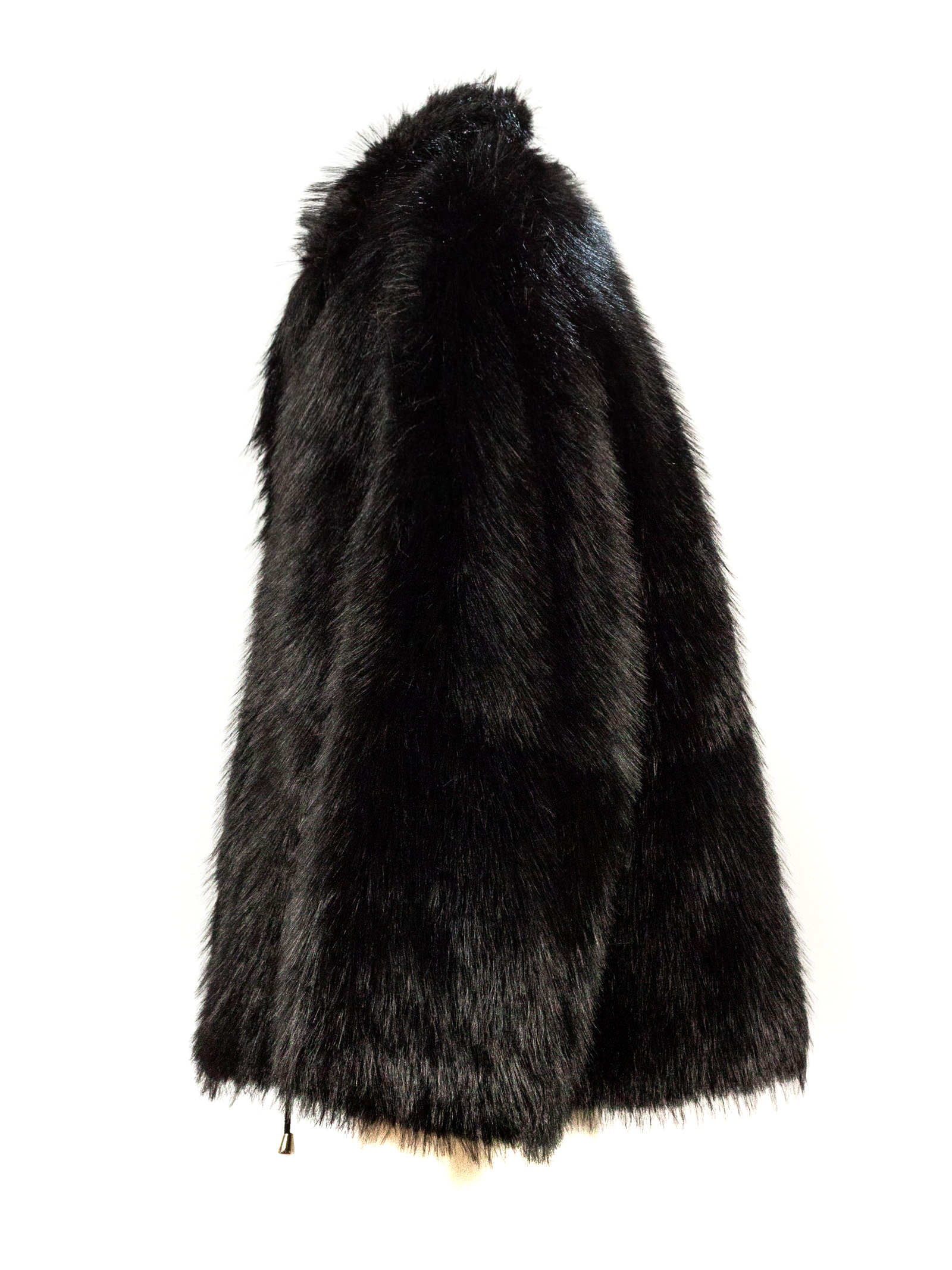 Giacca in Eco-Pelliccia Nera, Reverse Classici, Chiusura frontale nascosta, Fodera interna tono su tono, Vestibilità morbida, Coulisse regolabile al fondo con terminali metallici