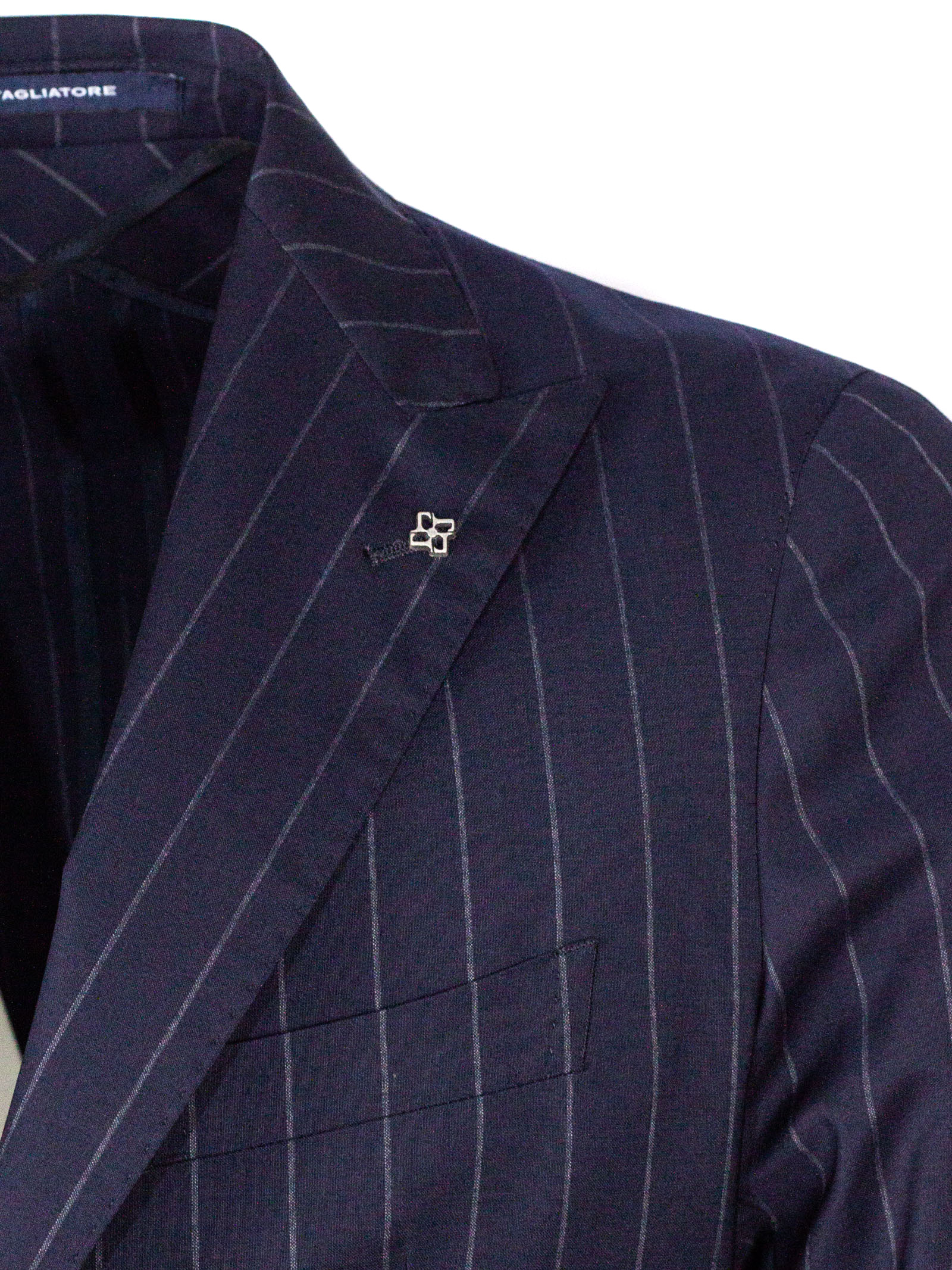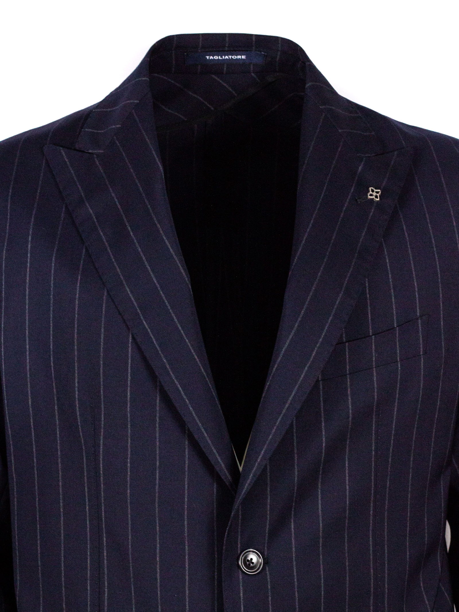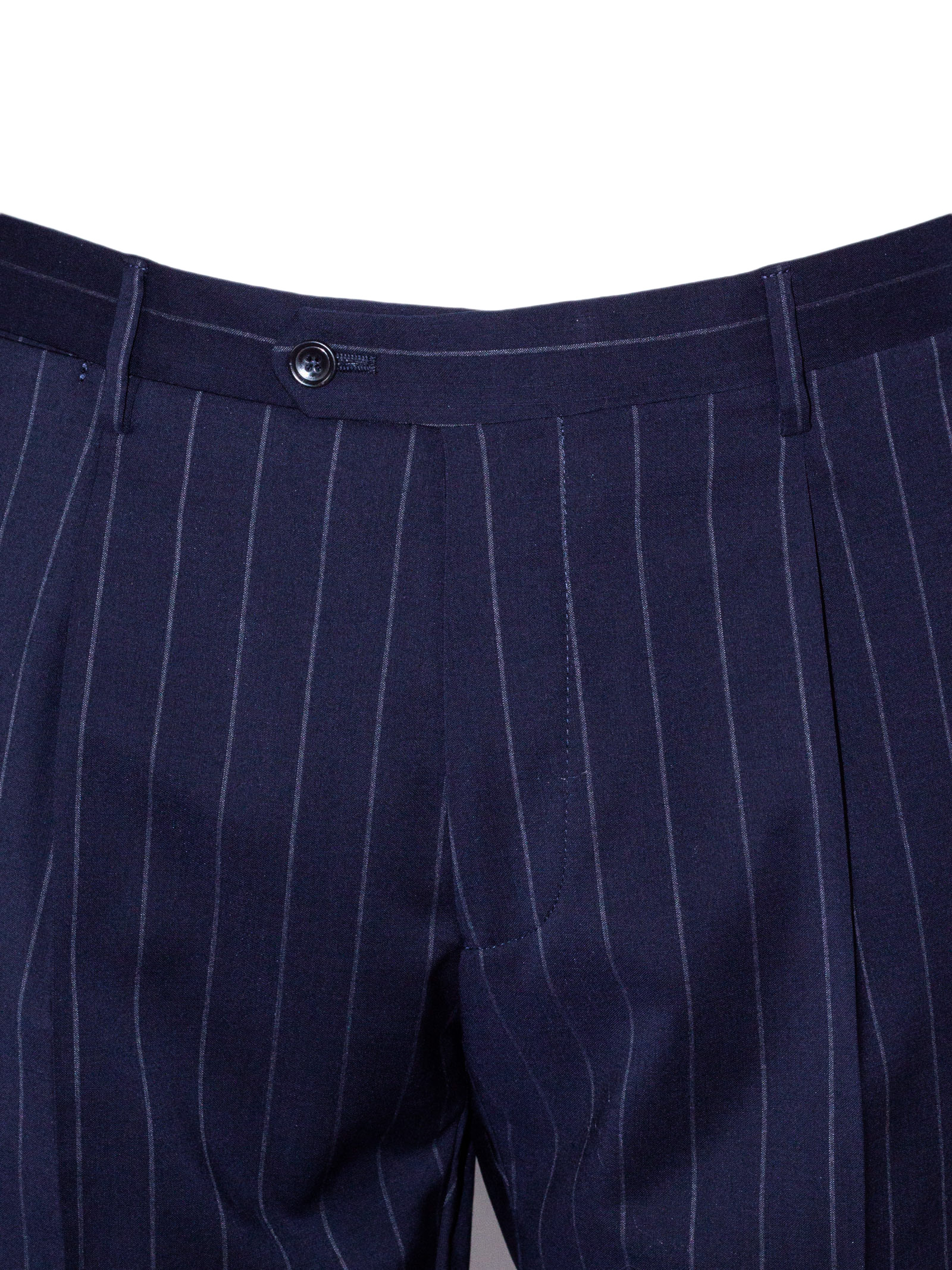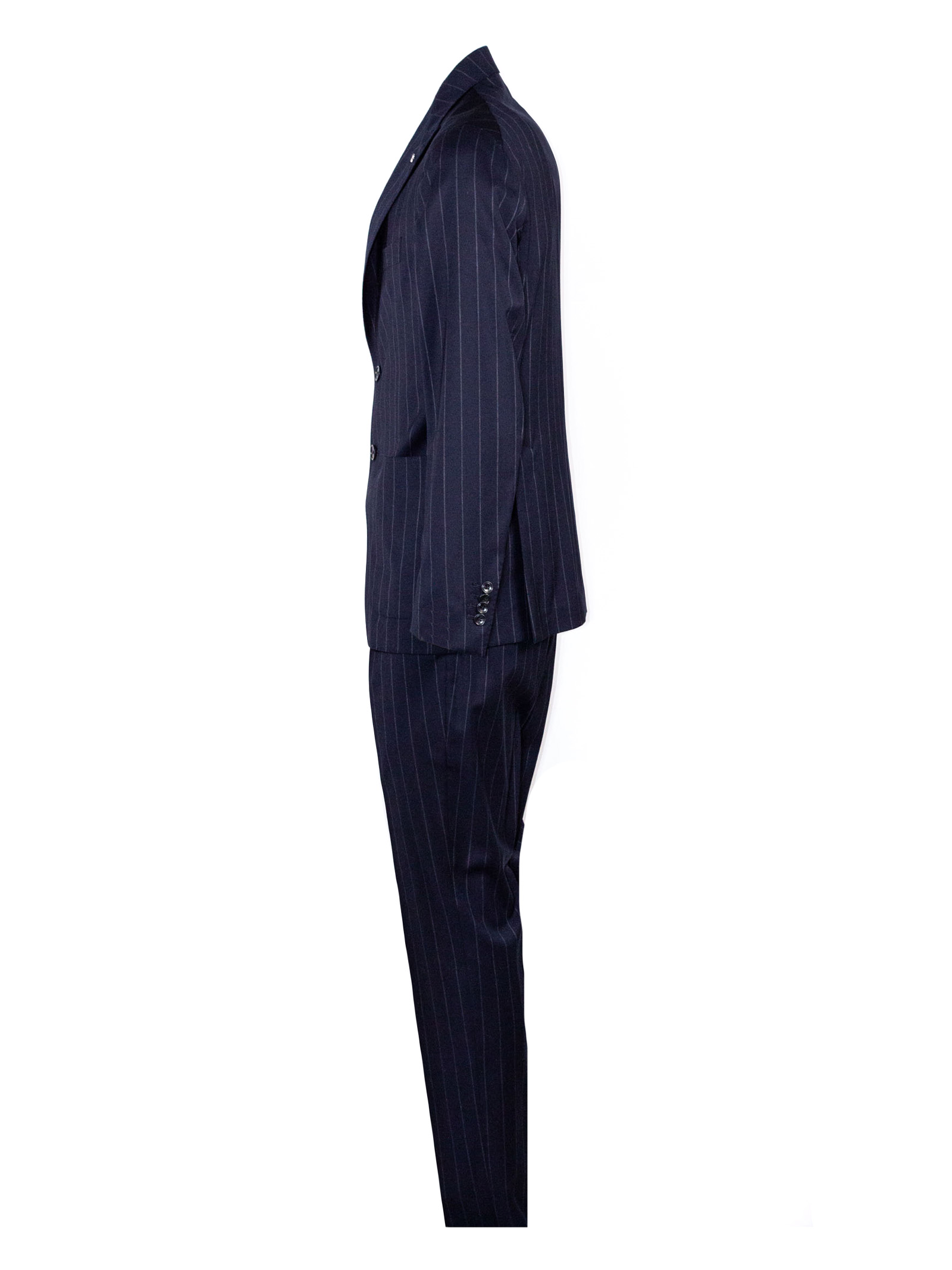 Abito sartoriale in lana vergine Super 110s blu scuro, fantasia gessata, giacca monopetto a due bottoni con rever classico e pantalone a linea dritta. Vestibilità elegante e confortevole