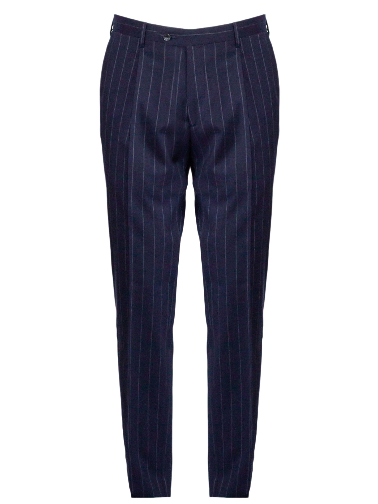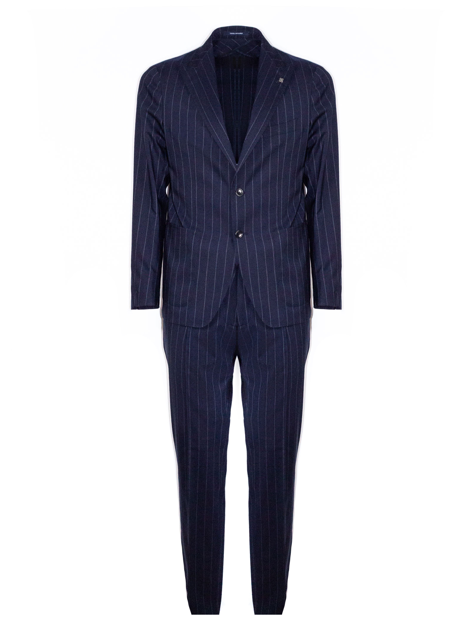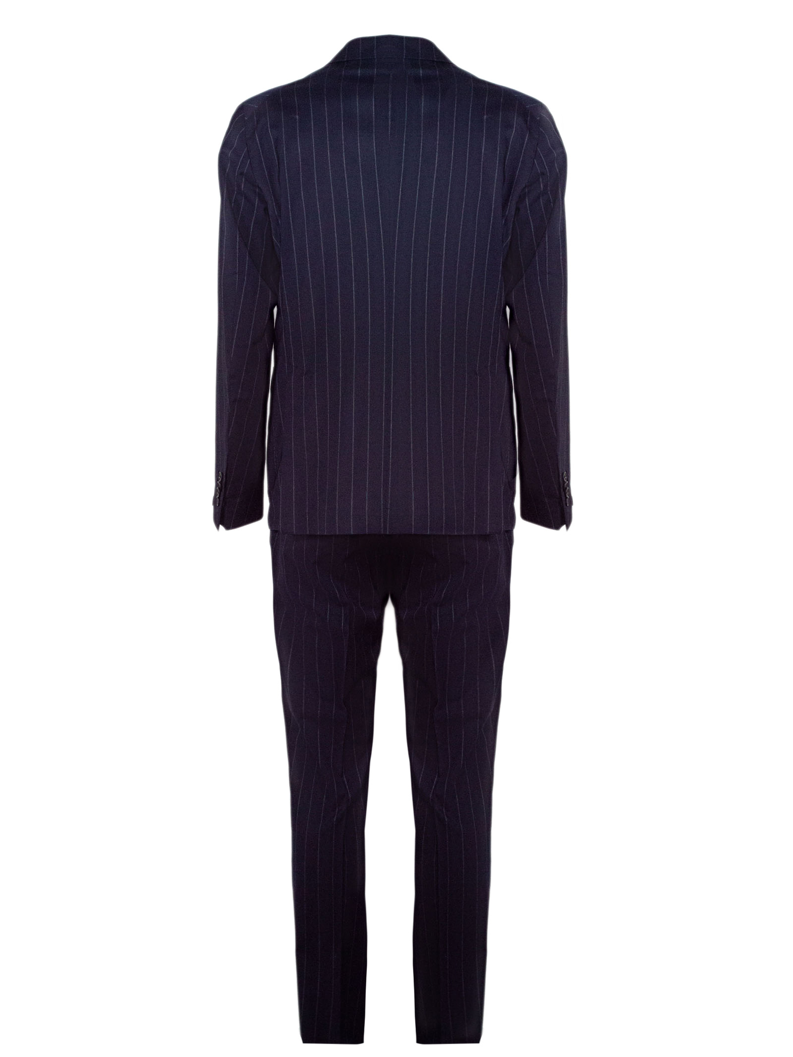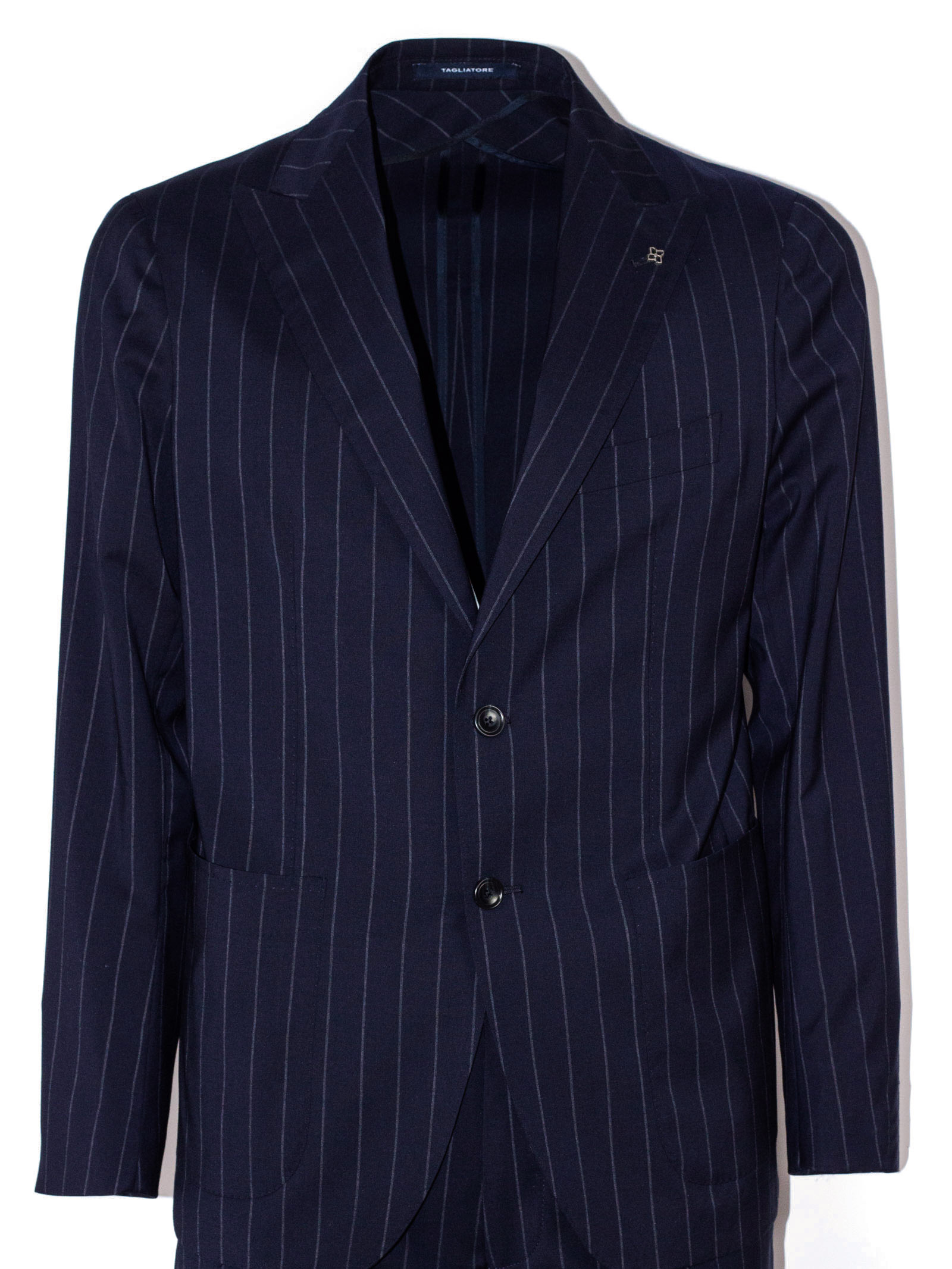 Abito sartoriale in lana vergine Super 110s blu scuro, fantasia gessata, giacca monopetto a due bottoni con rever classico e pantalone a linea dritta. Vestibilità elegante e confortevole