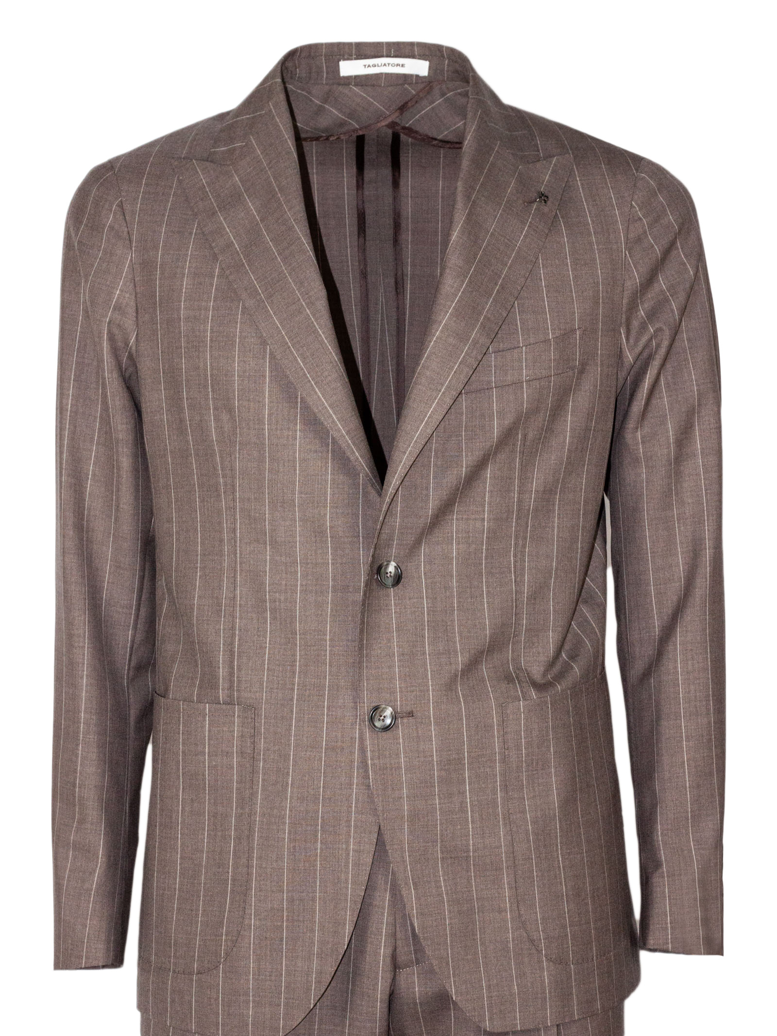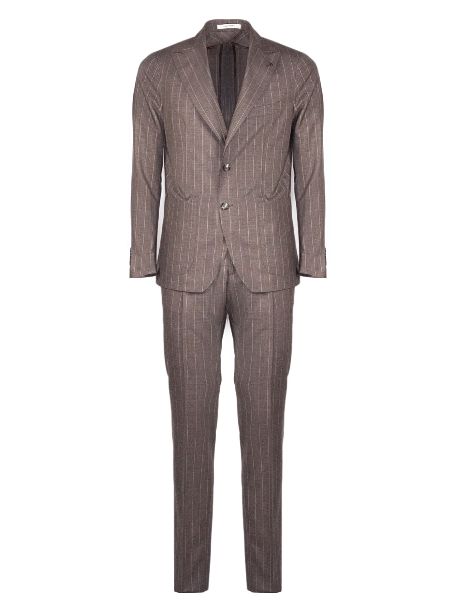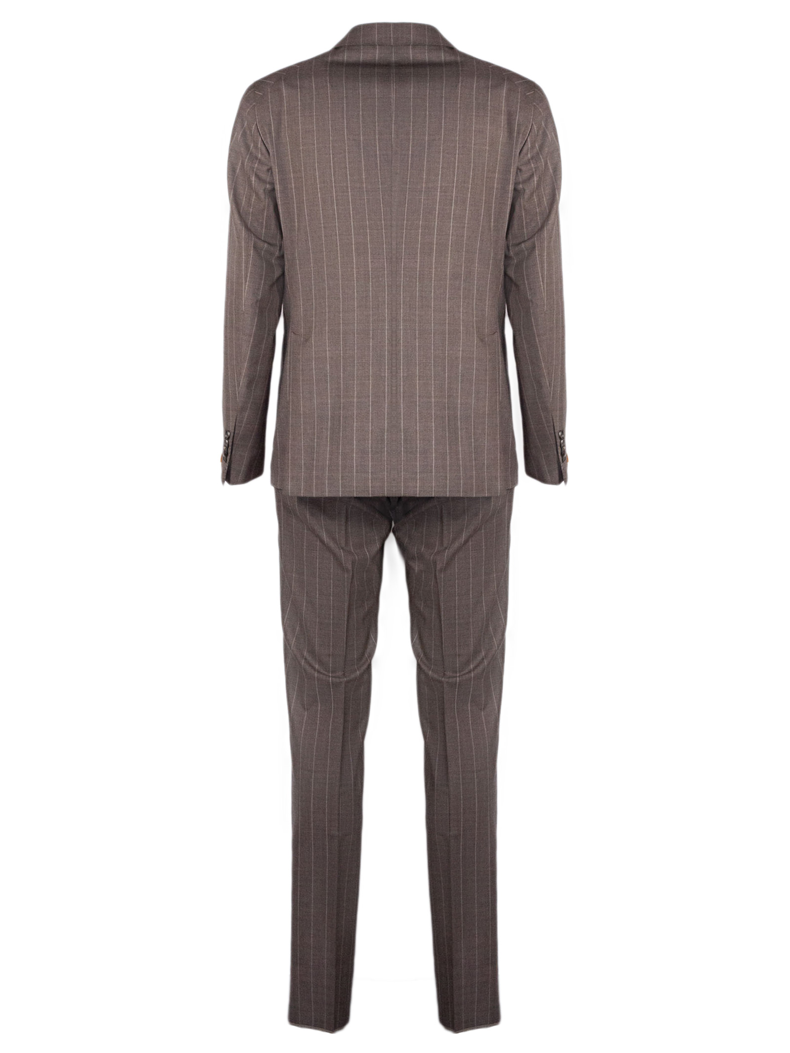 Abito sartoriale in lana vergine Super 130s, tonalità beige con elegante disegno gessato. Giacca monopetto con rever classico, chiusura a due bottoni, pantalone a linea dritta dal taglio equilibrato. Vestibilità elegante e confortevole