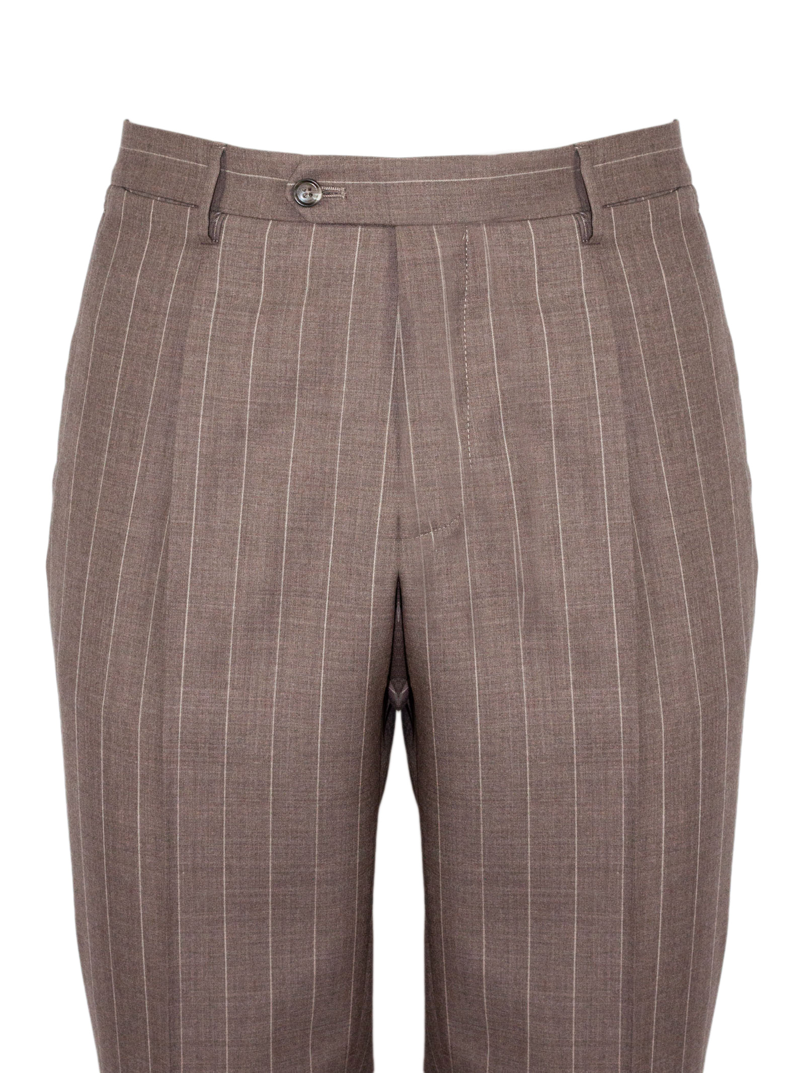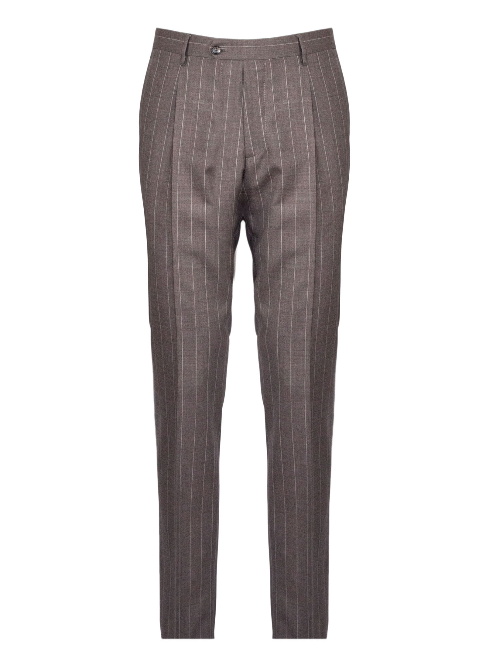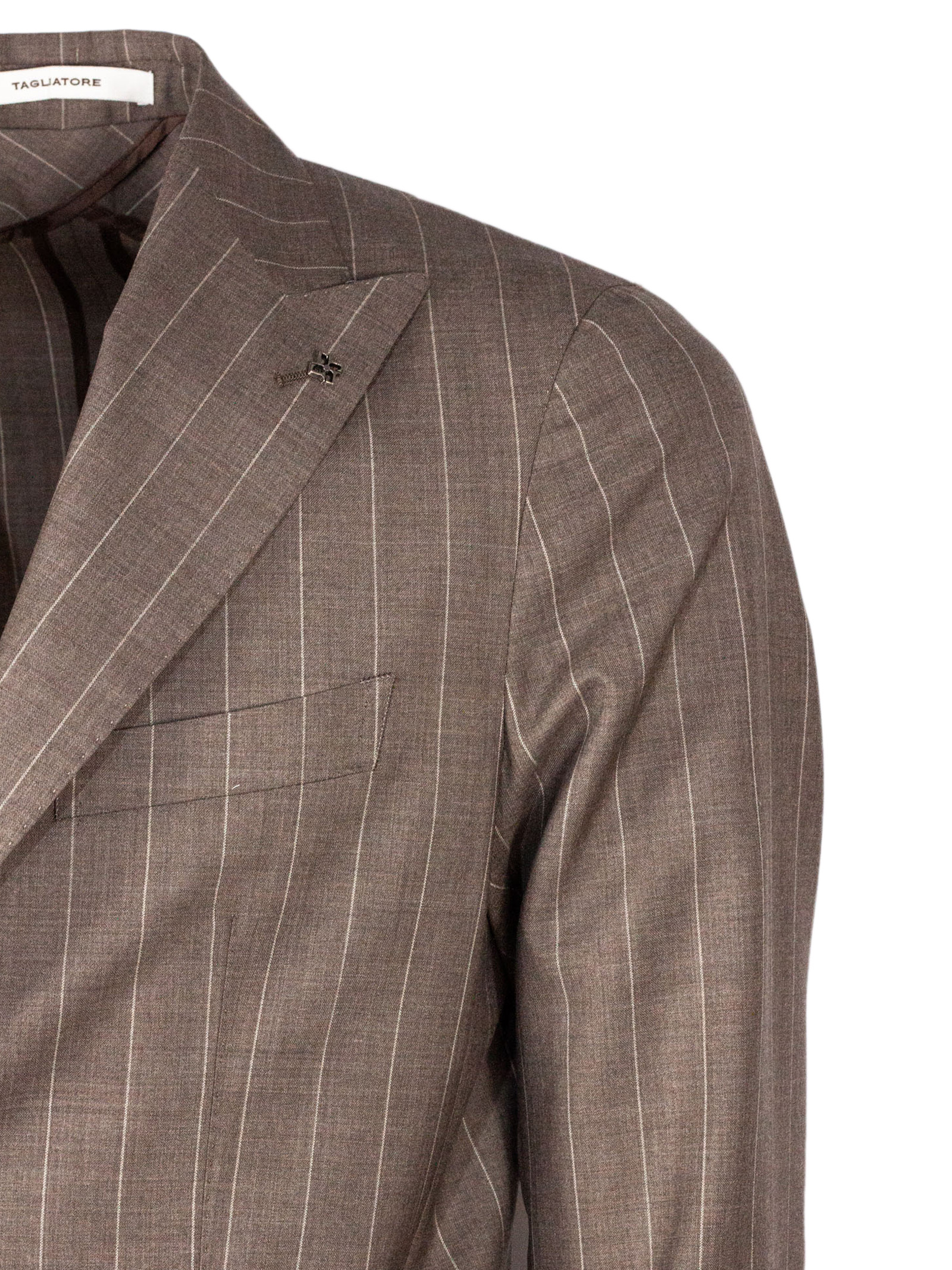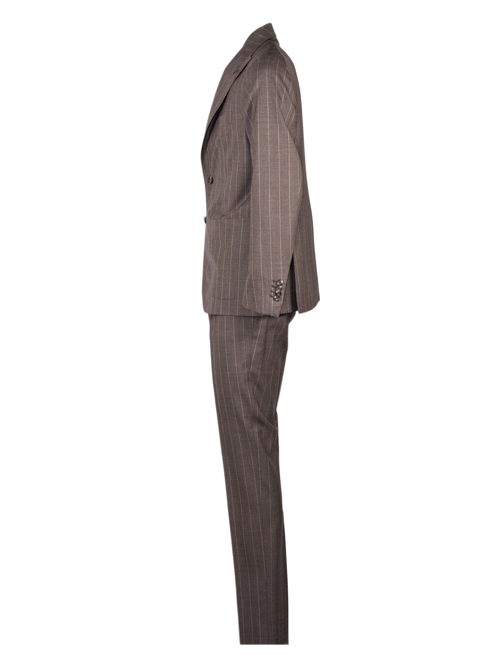 Abito sartoriale in lana vergine Super 130s, tonalità beige con elegante disegno gessato. Giacca monopetto con rever classico, chiusura a due bottoni, pantalone a linea dritta dal taglio equilibrato. Vestibilità elegante e confortevole