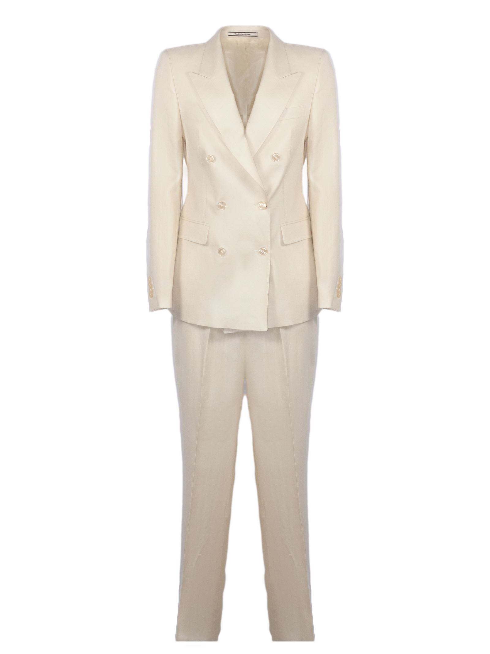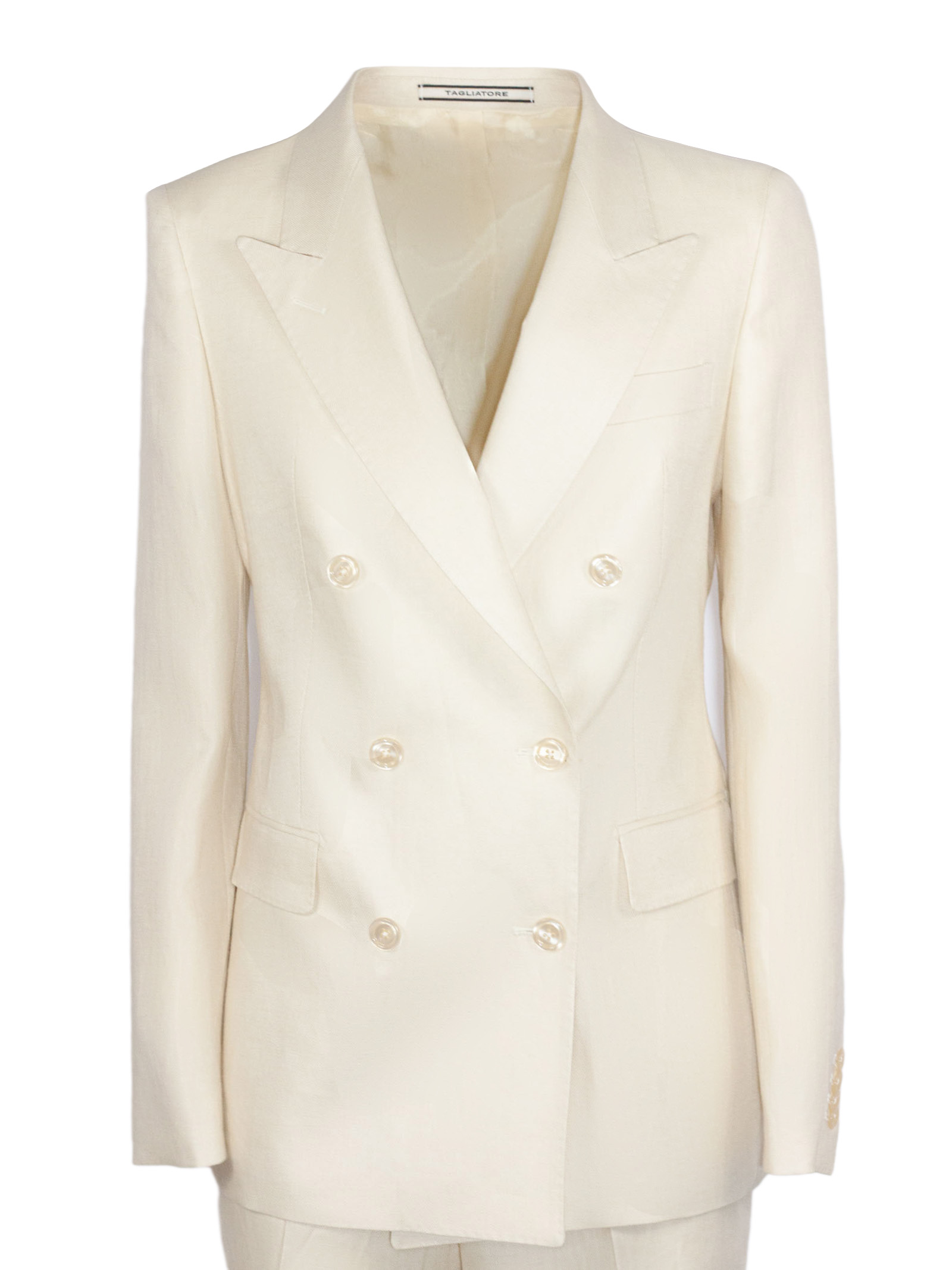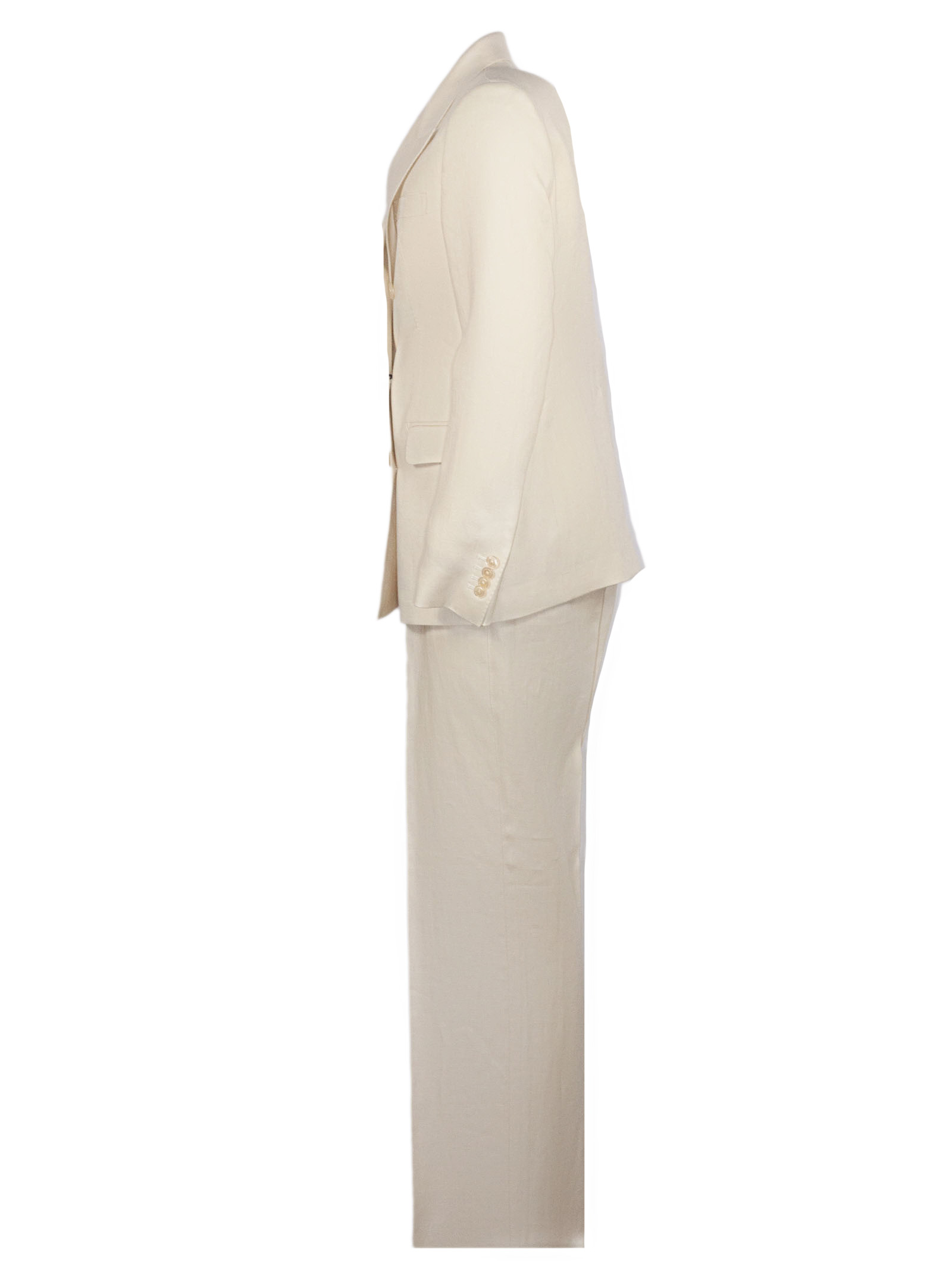 Abito sartoriale in lino, colore chiaro uniforme, giacca doppiopetto con chiusura a bottoni, revers a lancia, linea leggermente sagomata, spalle strutturate, tasche con patta e taschino sul petto, fodera interna liscia, pantalone coordinato a gamba dritta, vita regolare con passanti, chiusura con zip e bottone, tasche laterali e posteriori, vestibilità regular