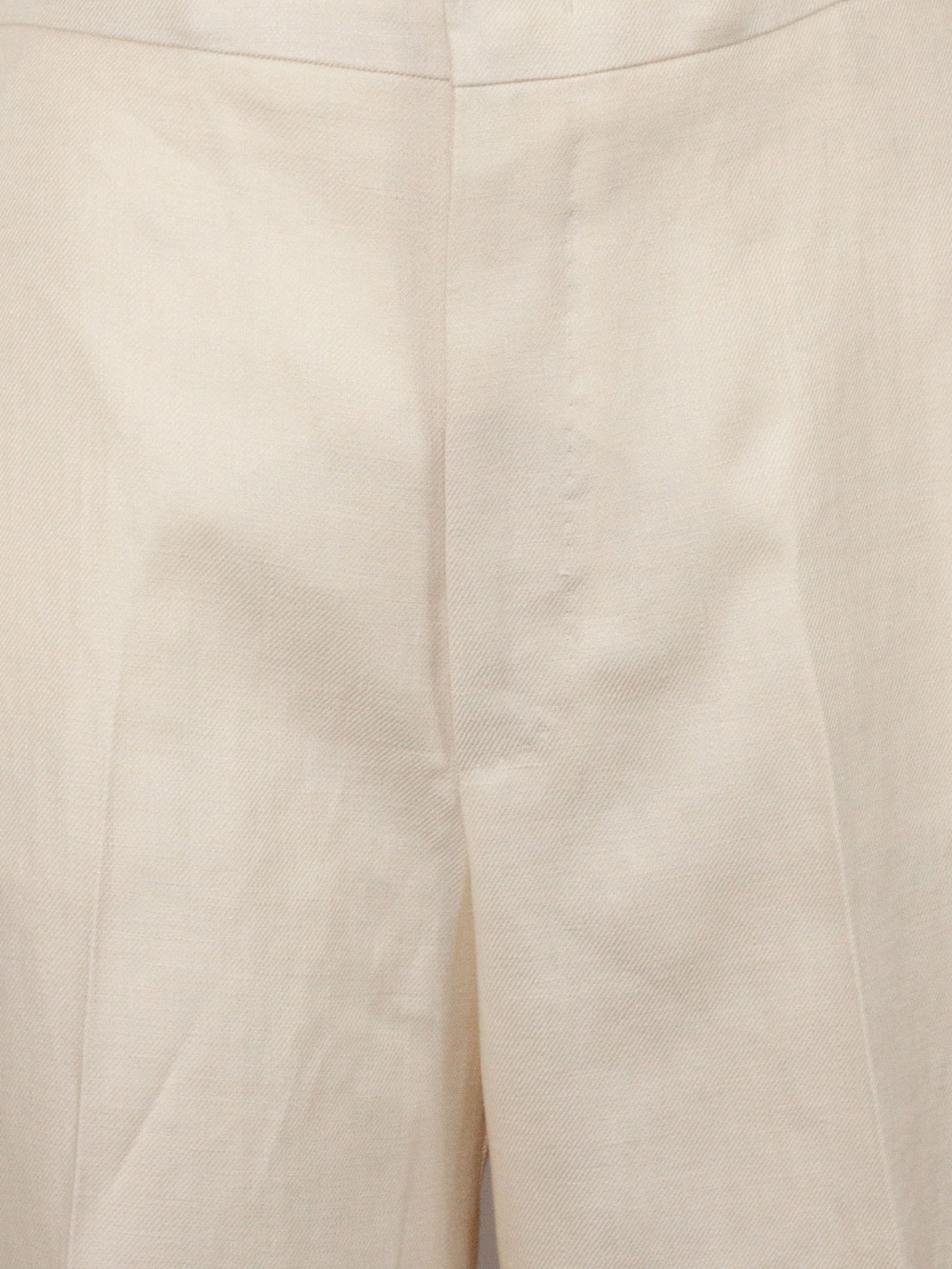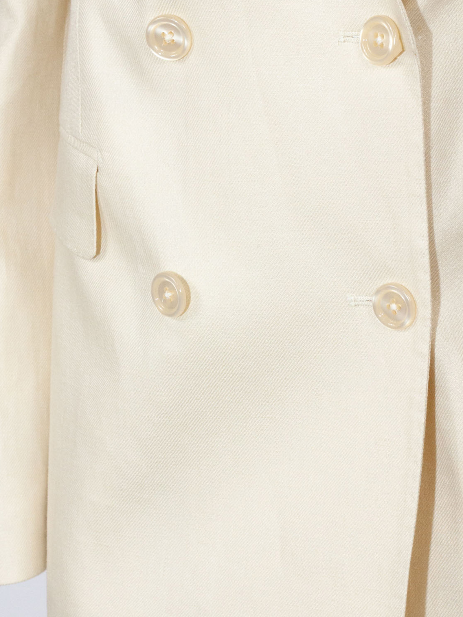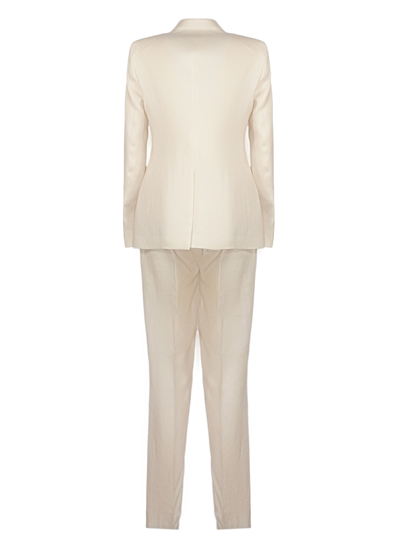 Abito sartoriale in lino, colore chiaro uniforme, giacca doppiopetto con chiusura a bottoni, revers a lancia, linea leggermente sagomata, spalle strutturate, tasche con patta e taschino sul petto, fodera interna liscia, pantalone coordinato a gamba dritta, vita regolare con passanti, chiusura con zip e bottone, tasche laterali e posteriori, vestibilità regular