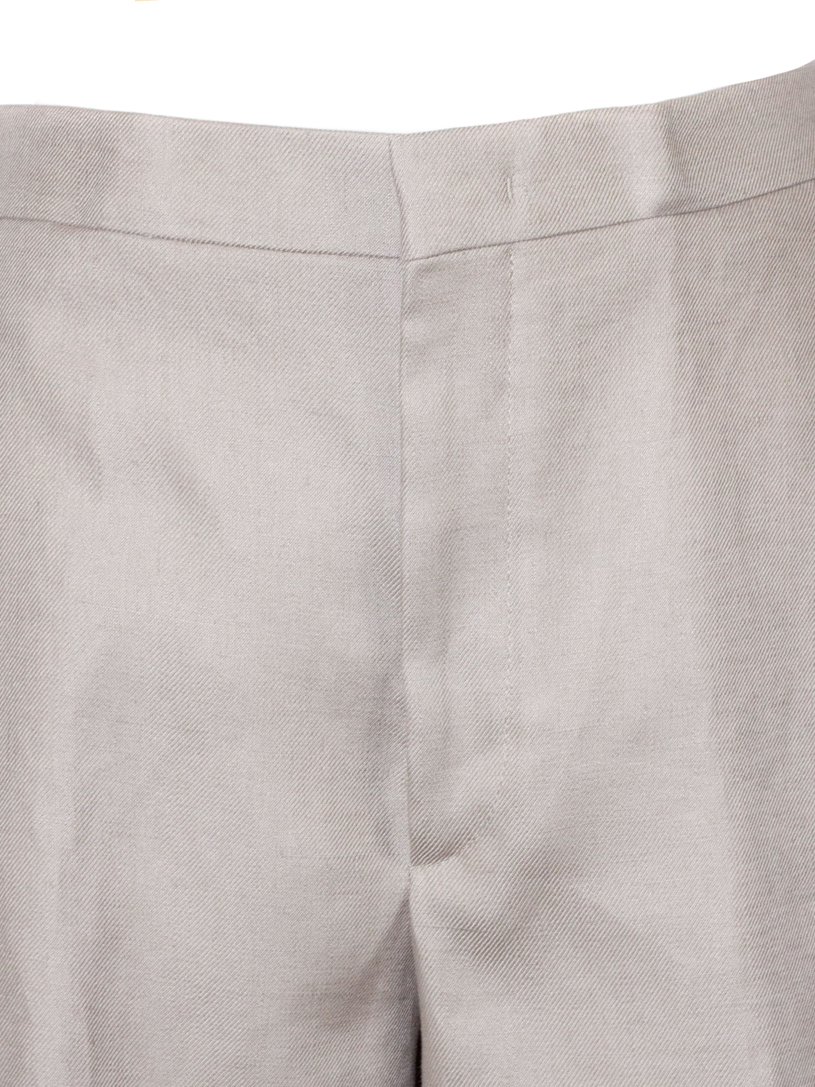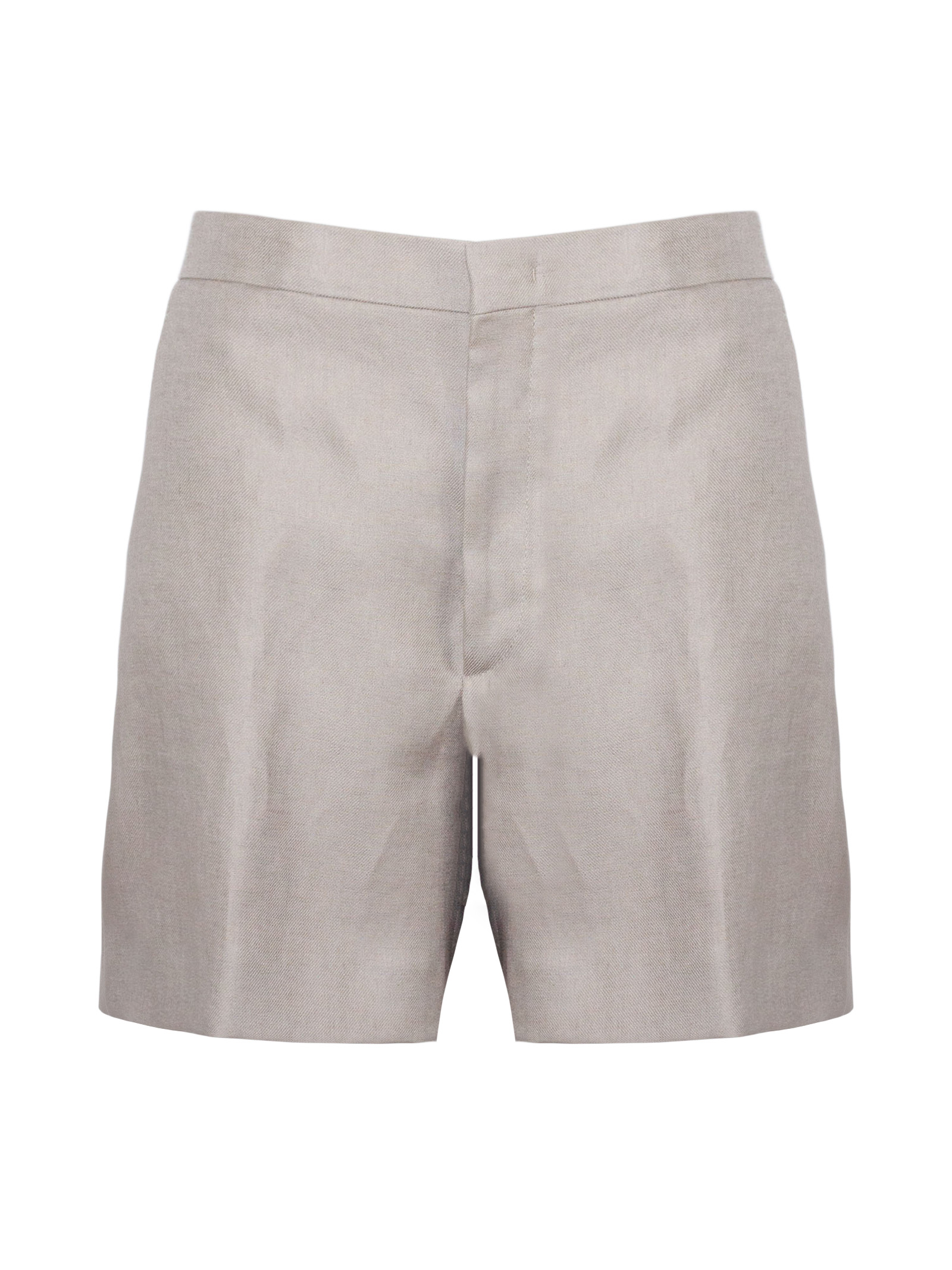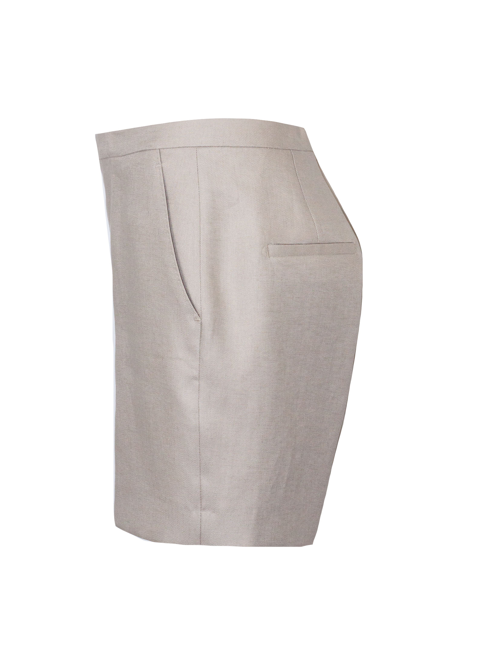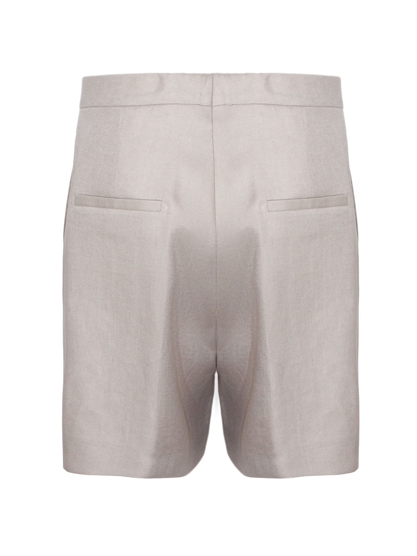 Bermuda in lino beige con vita alta, tasche laterali, tasche sul retro, chiusura frontale nascosta, taglio sartoriale