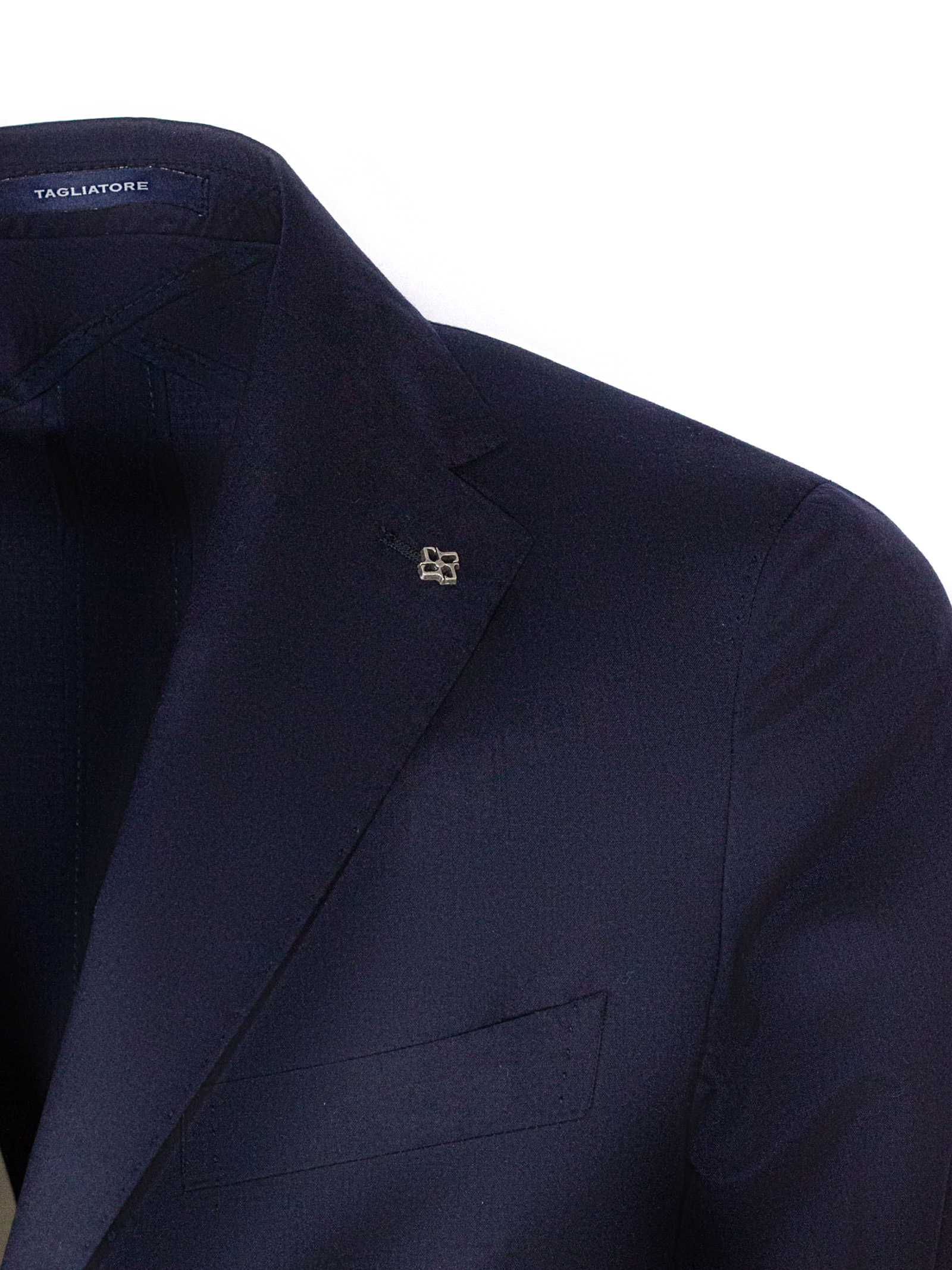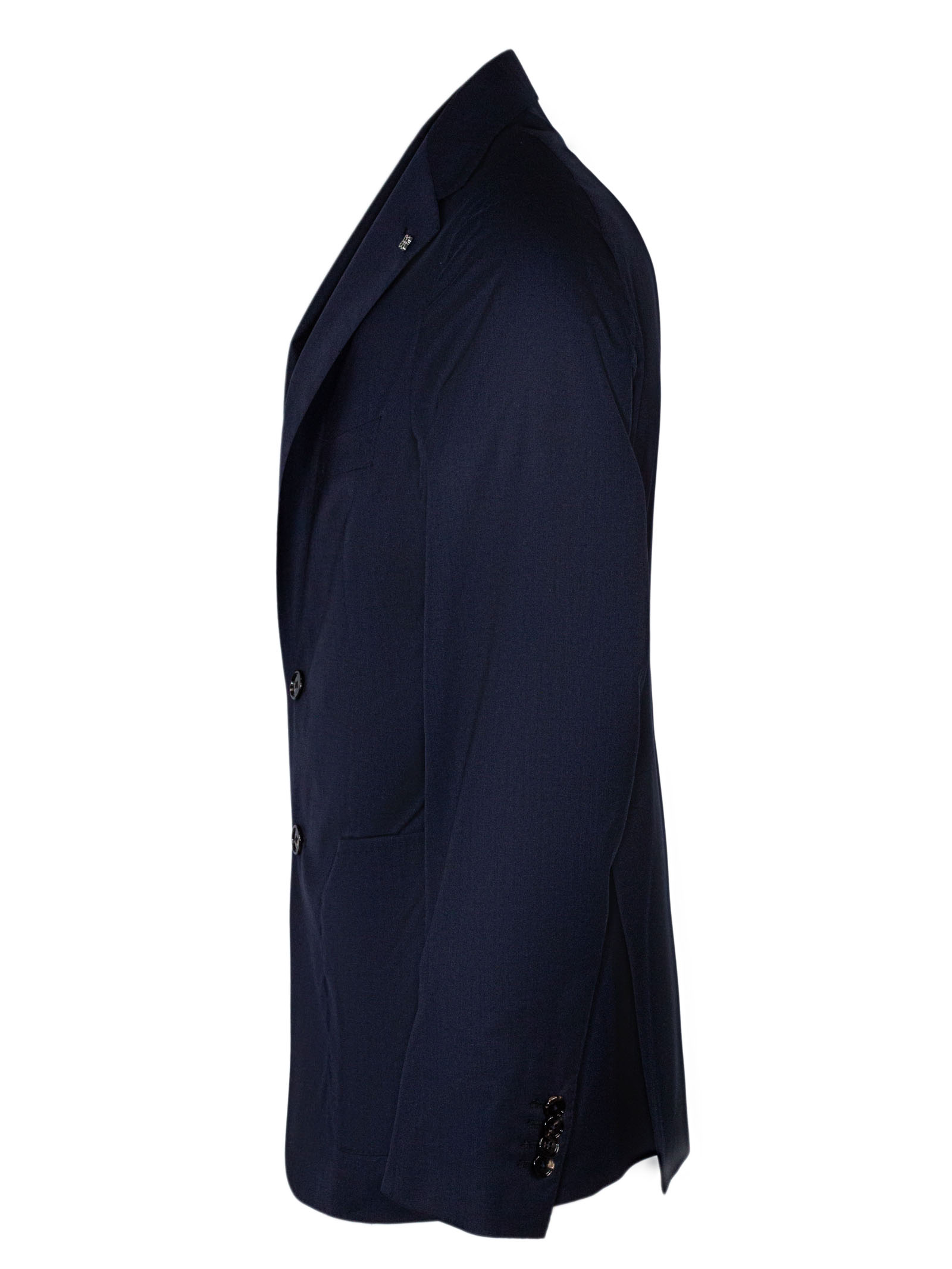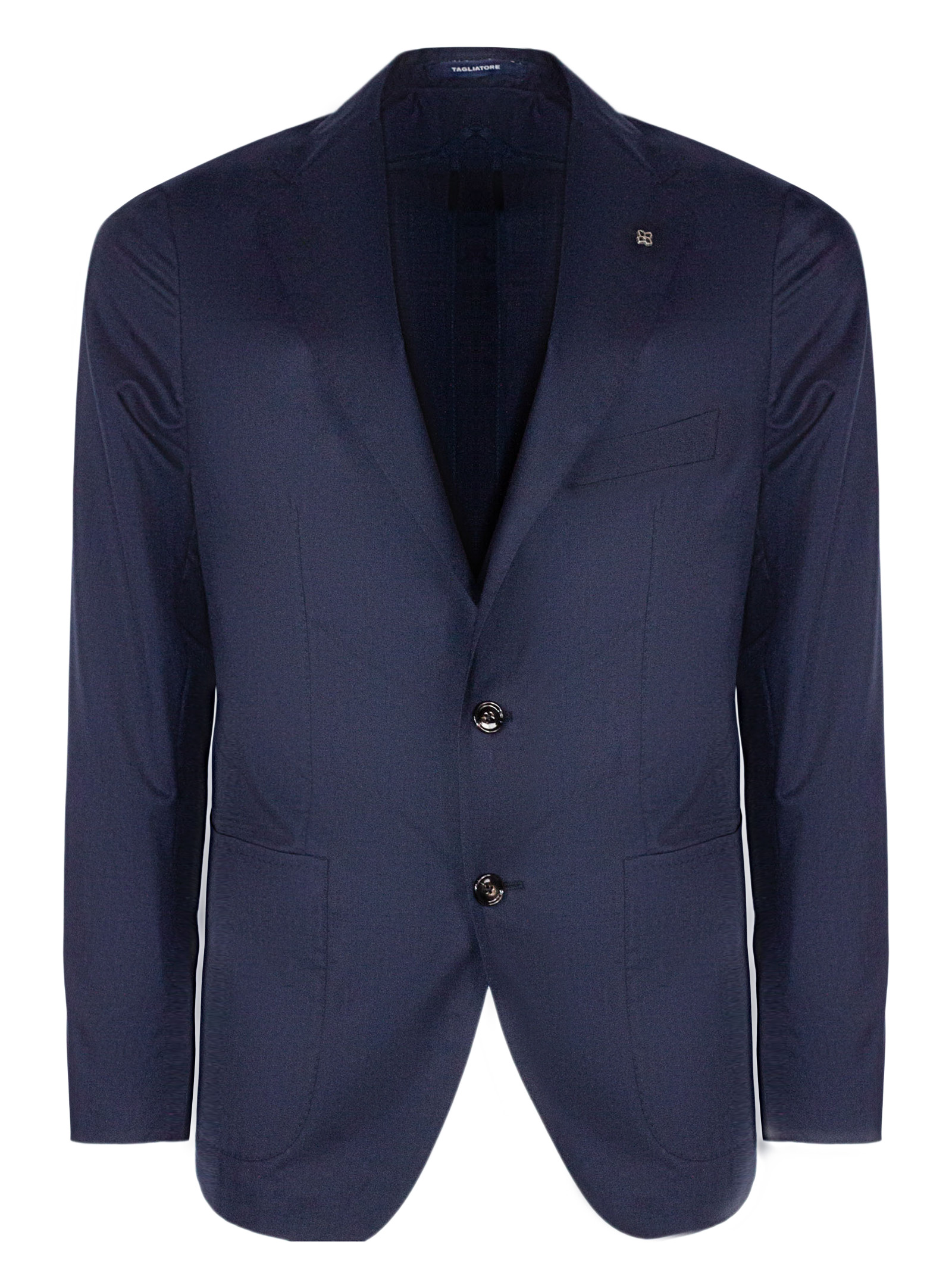 Blazer in misto lana e seta blu, rever classico, dettaglio spilla caratteristica del brand, taschino, tasche laterali, chiusura monopetto con bottoni, doppio spacco sul retro