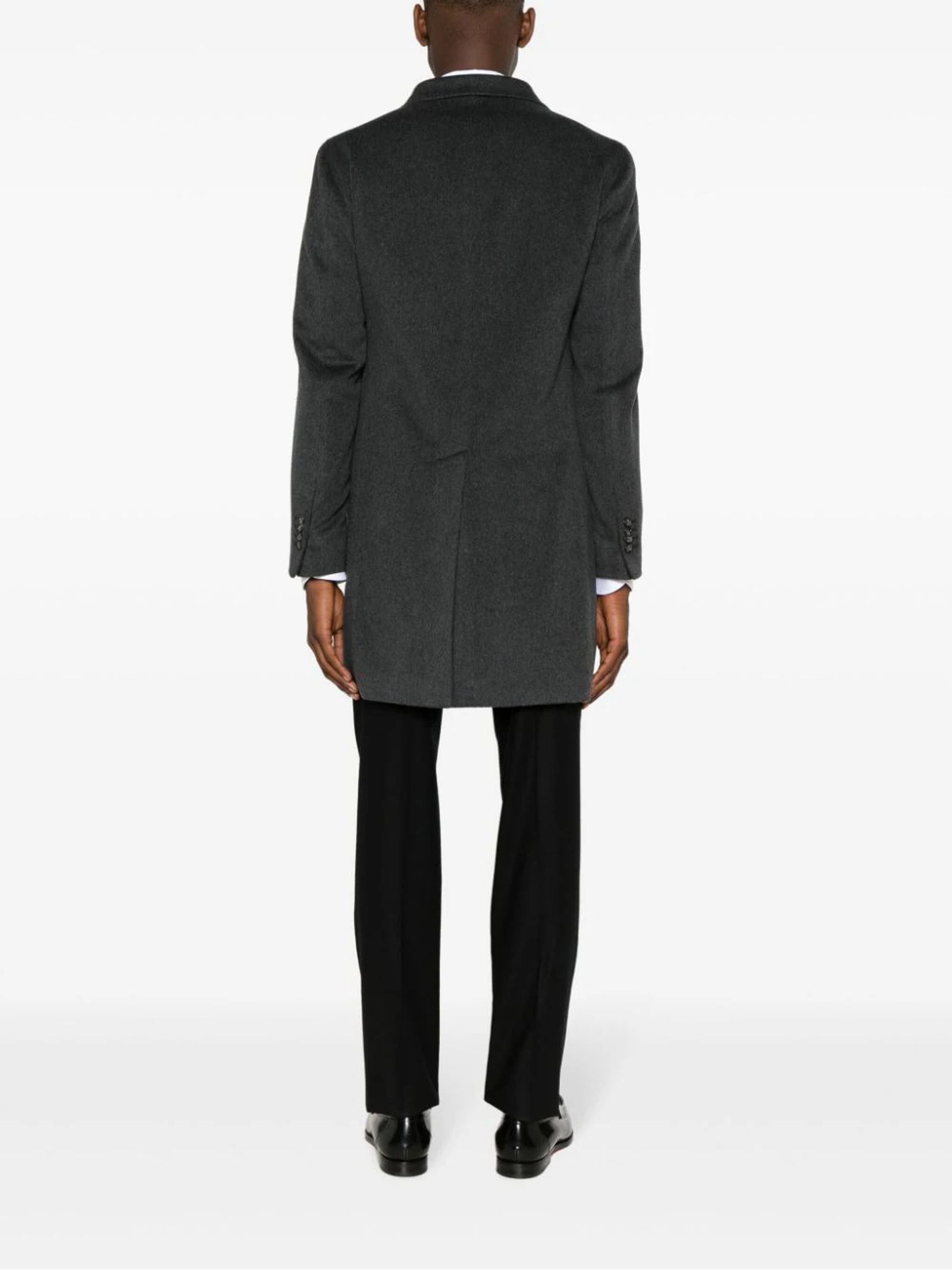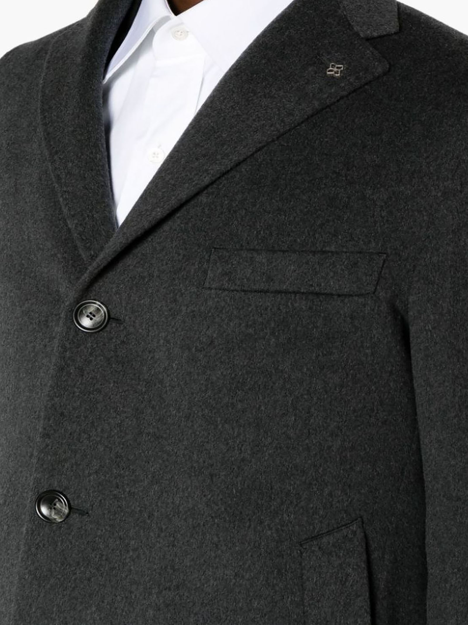 Cappotto monopetto grigio antracite, misto lana vergine e cashmere, dettaglio con spilla, revers a punta, chiusura frontale con bottoni, maniche lunghe, orli con bottone, tasca a filetto sul petto, due tasche a filetto laterali, spacco centrale posteriore, orlo dritto e altezza sopra al ginocchio.