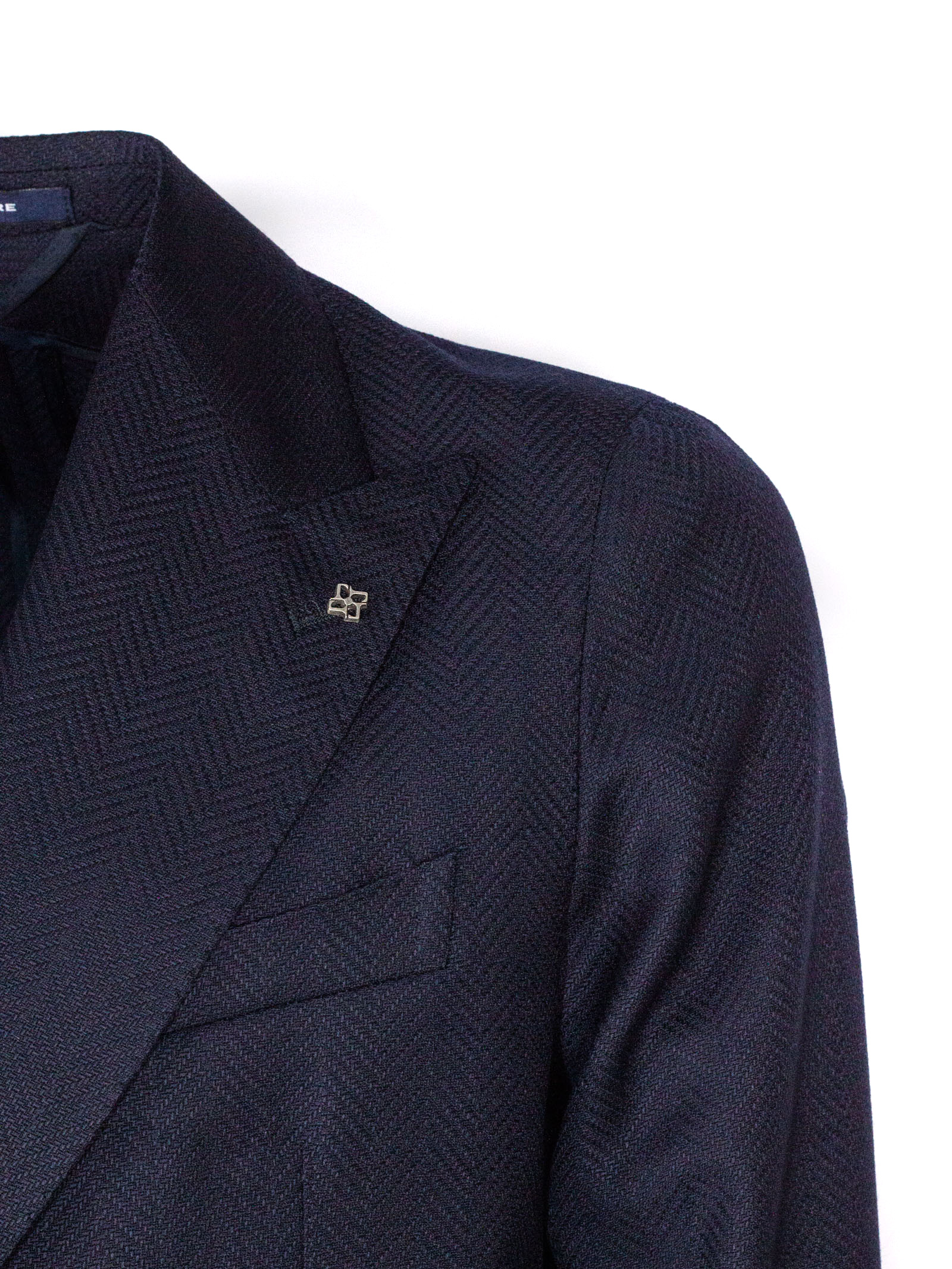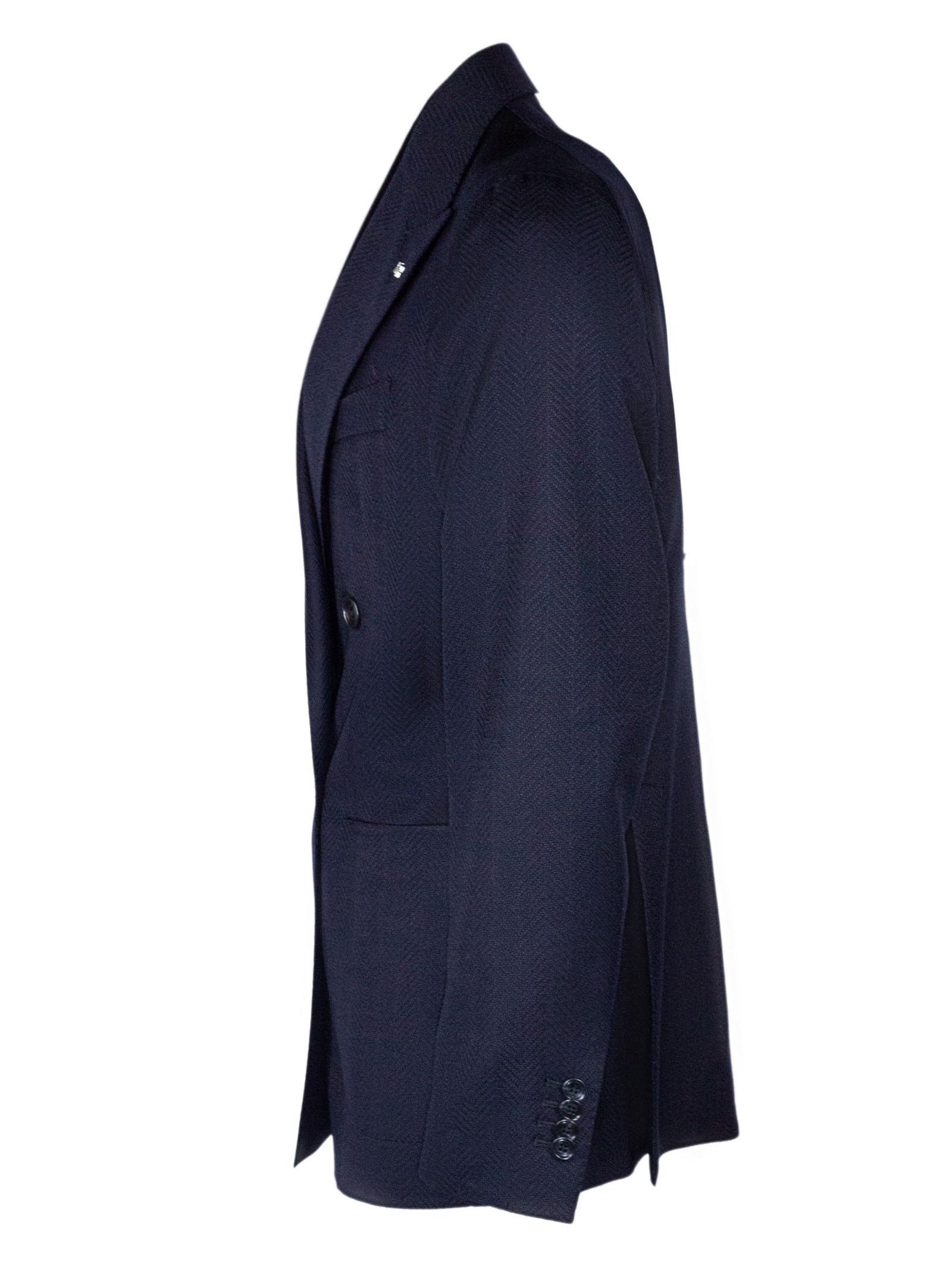 Giacca sartoriale doppiopetto in lana vergine blu, trama herringbone, Vestibilità regolare, rever classico, chiusura a due bottoni, tasche applicate, taschino sul petto, dettaglio spilla caratteristica del brand, doppio spacco sul retro