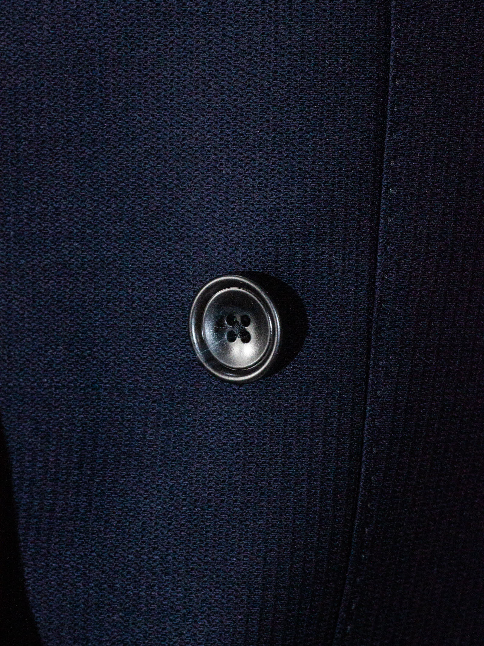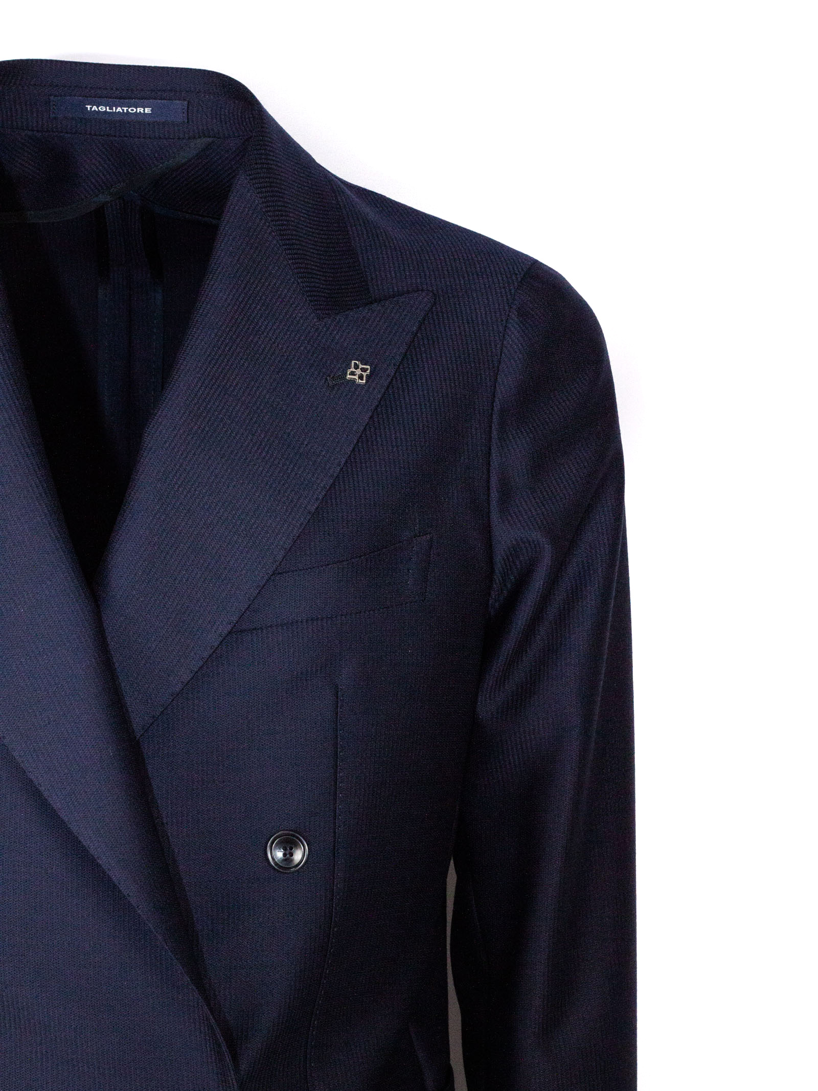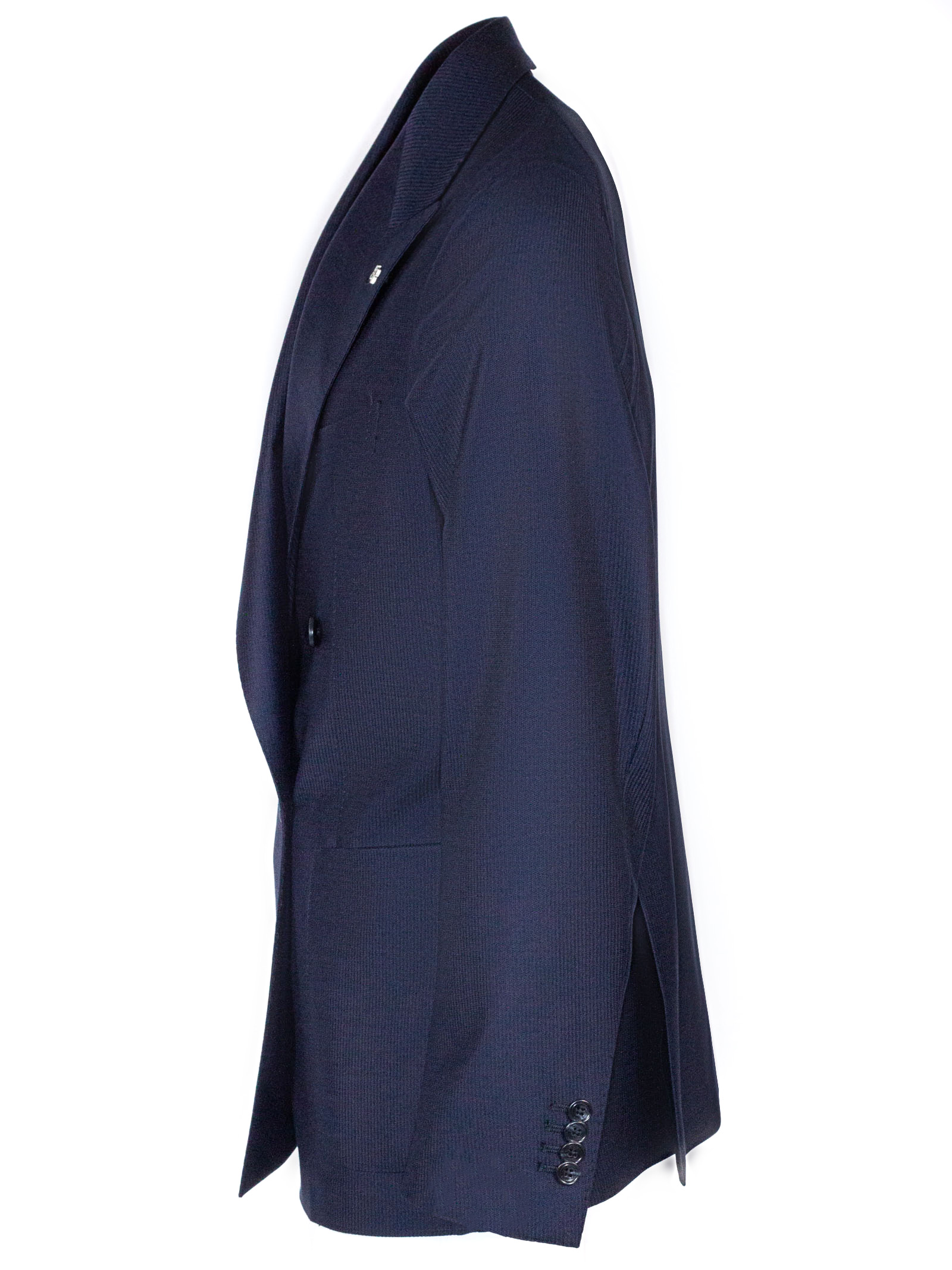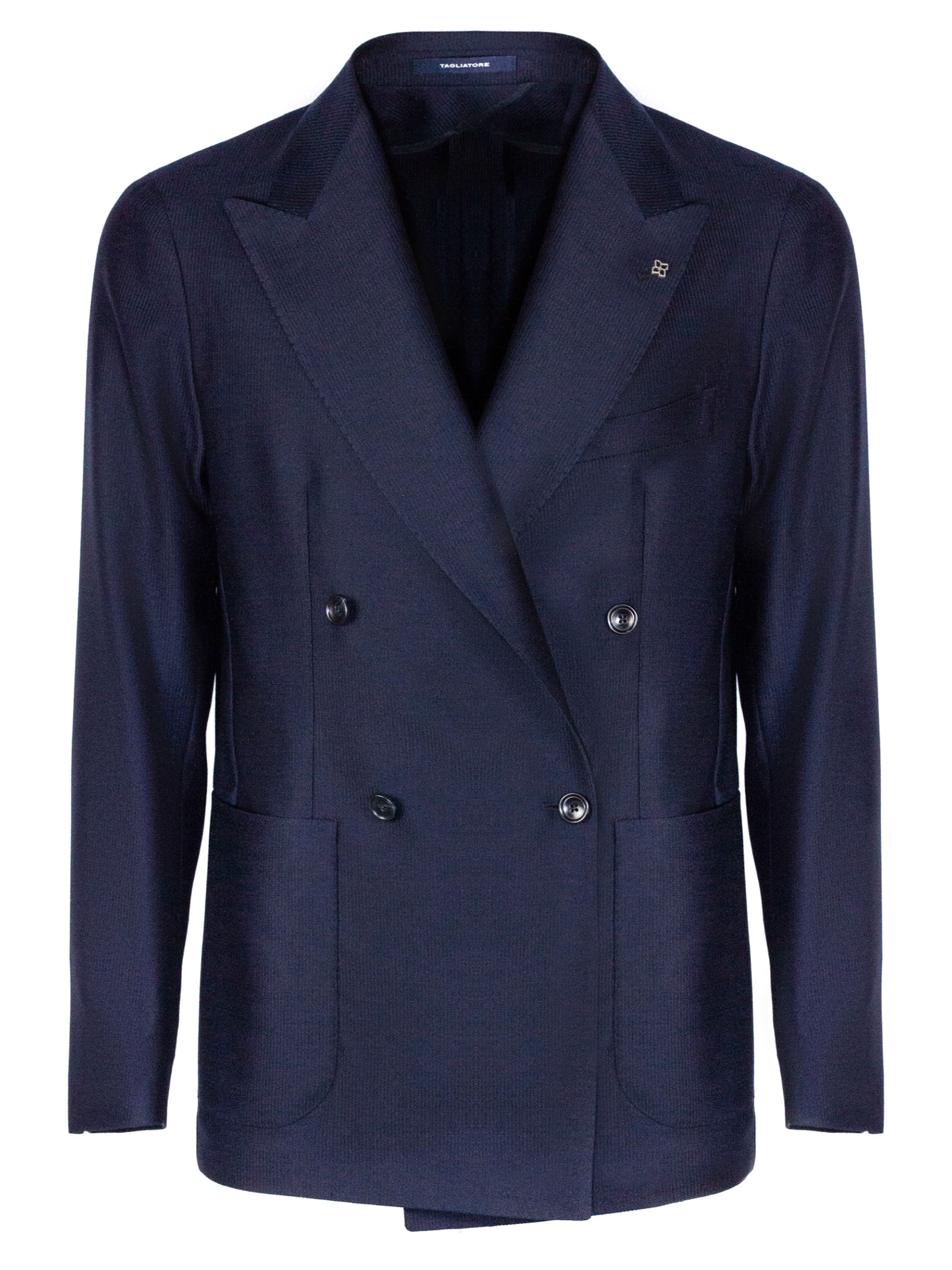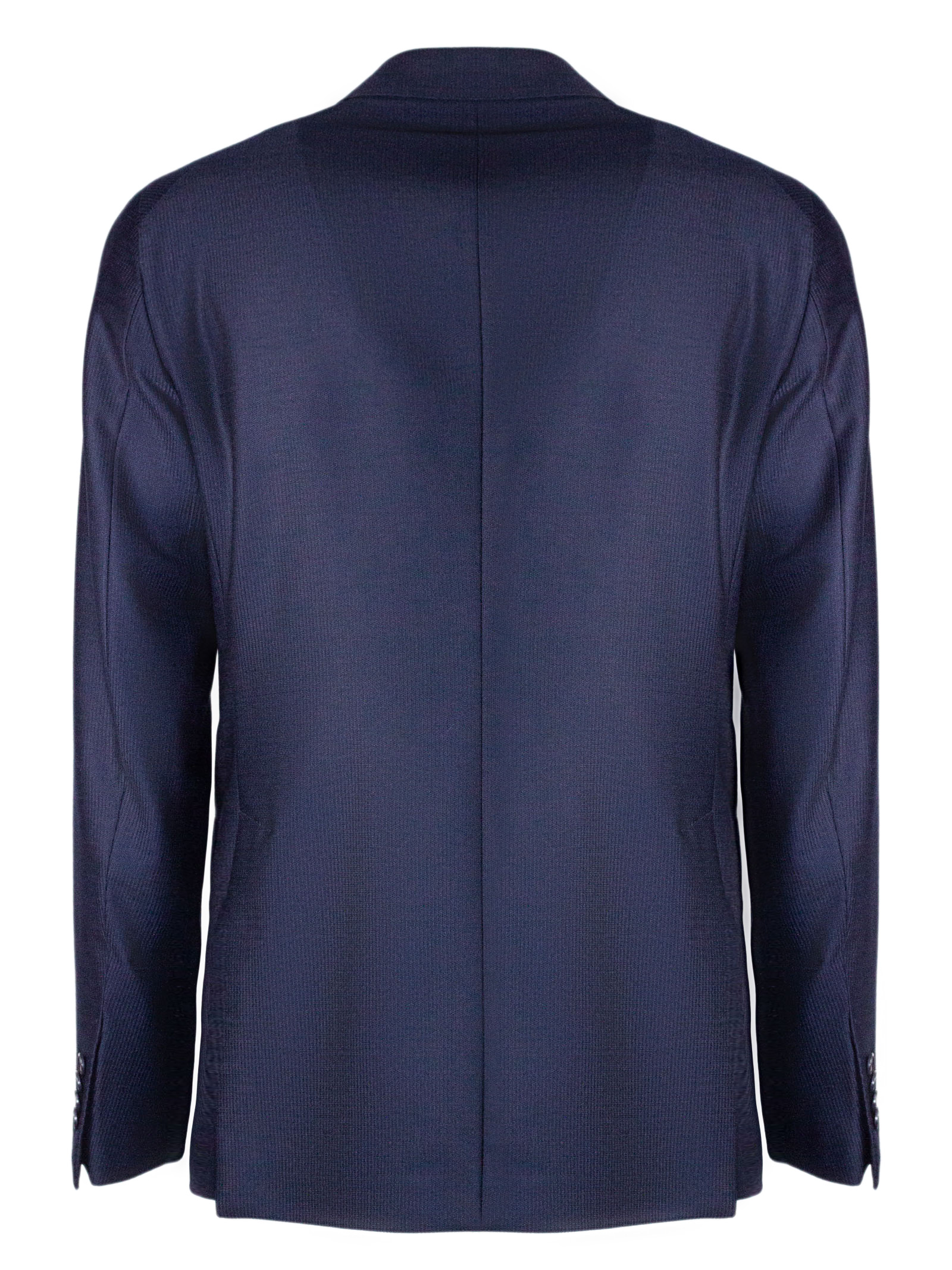 Giacca sartoriale doppiopetto in lana vergine blu, Vestibilità regolare, rever classico, chiusura a due bottoni, tasche applicate, taschino sul petto, dettaglio spilla caratteristica del brand, doppio spacco sul retro