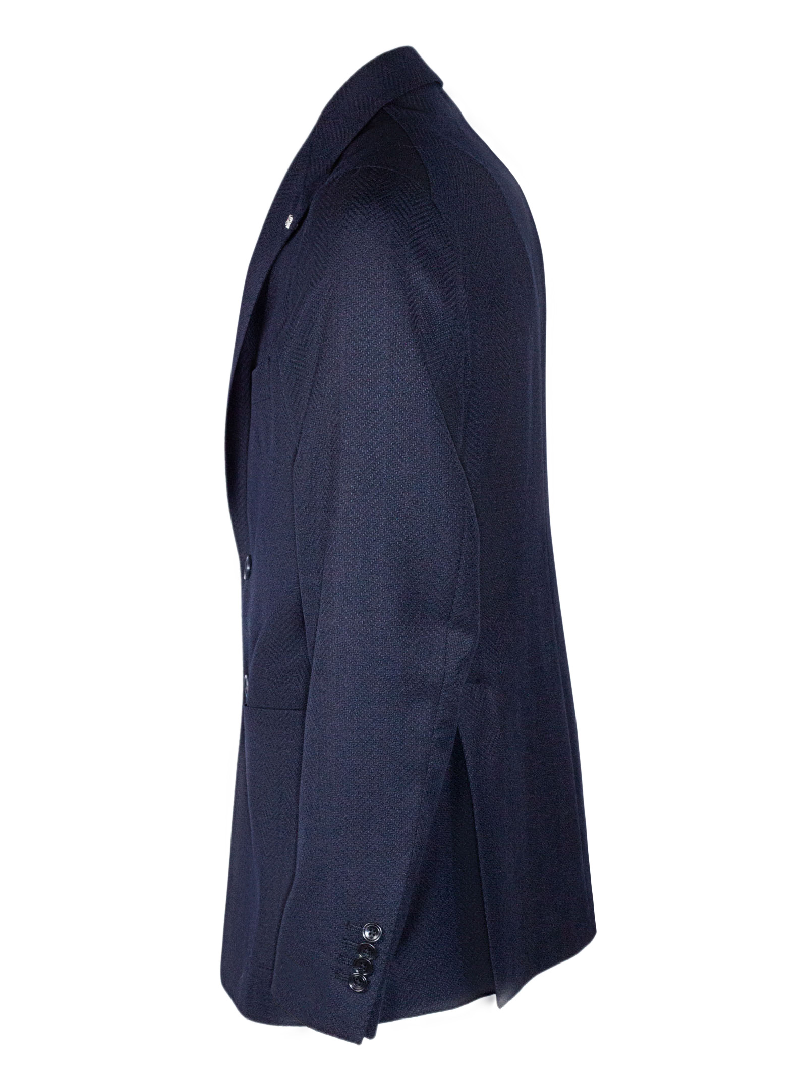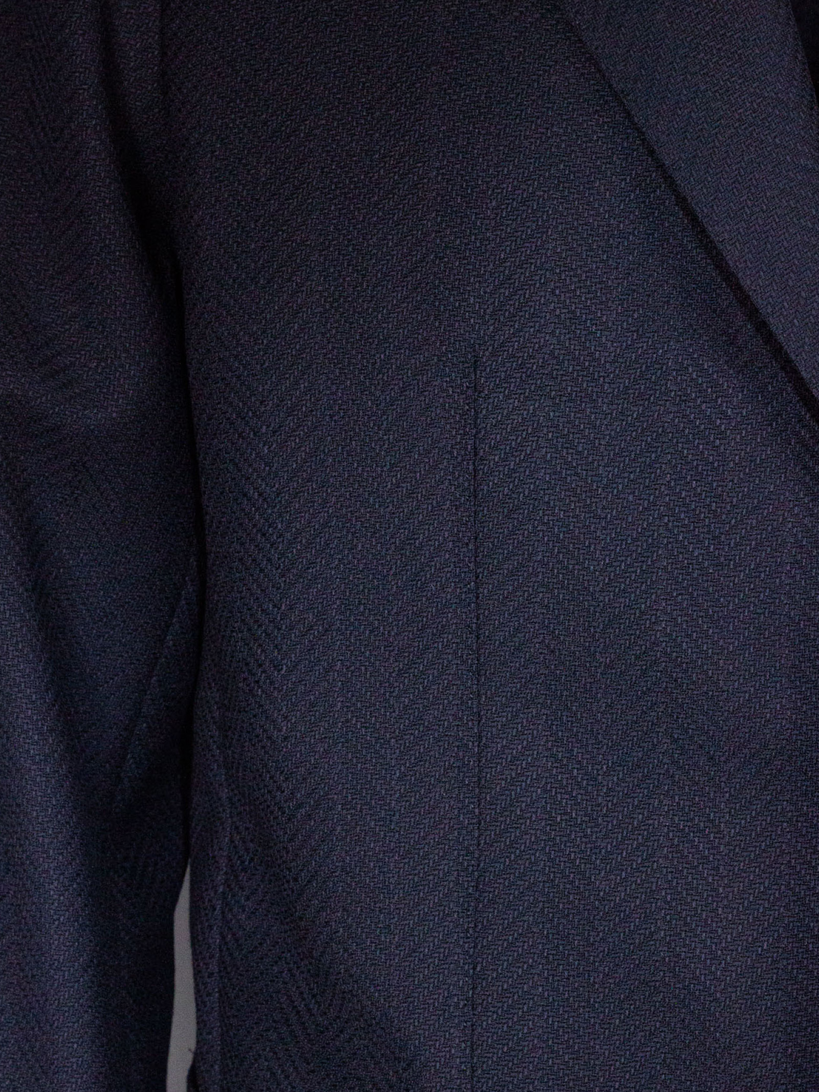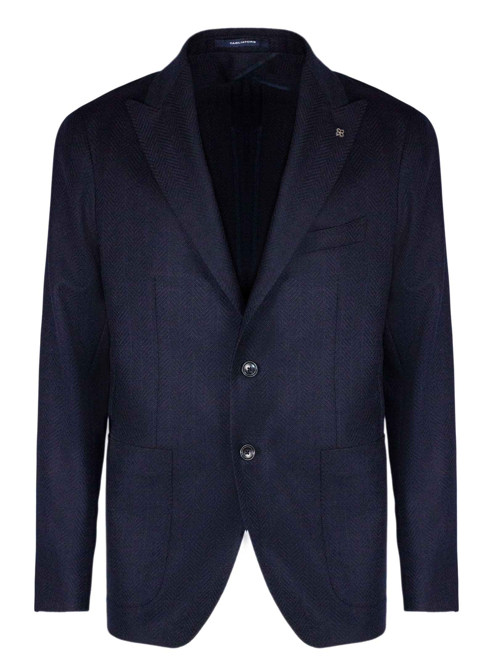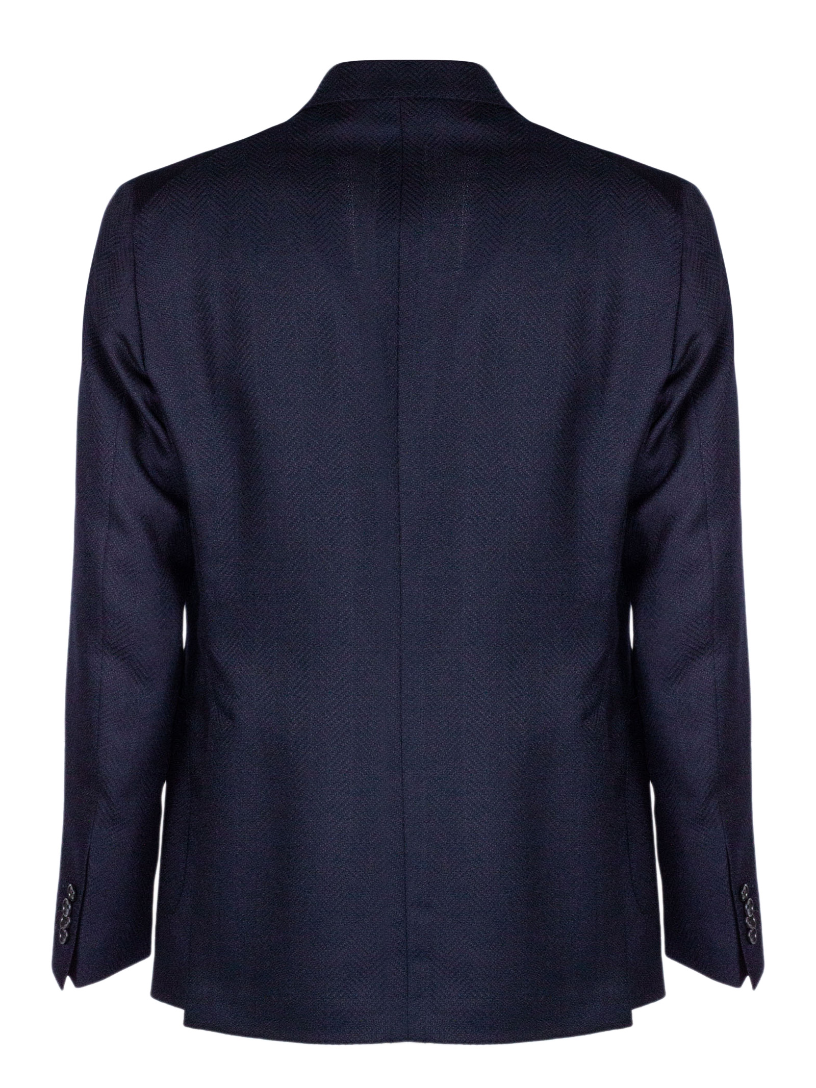 Giacca sartoriale in lana vergine blu, trama herringbone, Vestibilità regolare, rever classico, chiusura a due bottoni, tasche applicate, taschino sul petto, dettaglio spilla caratteristica del brand, doppio spacco sul retro