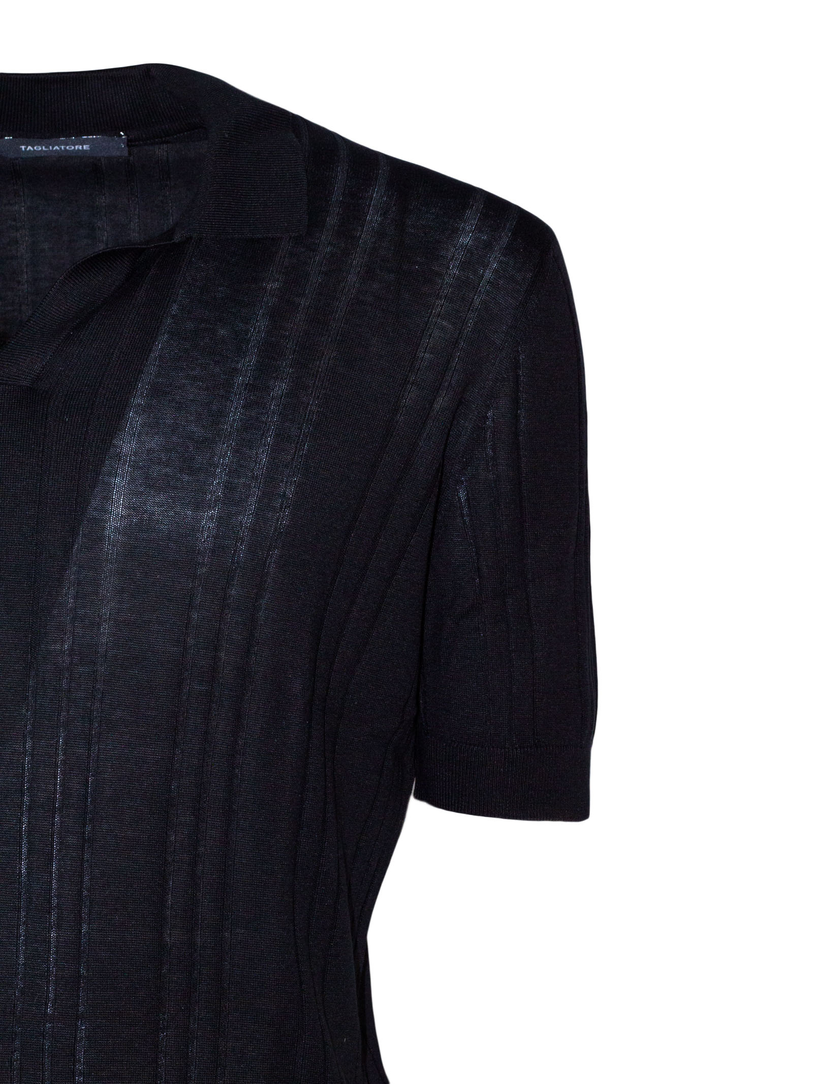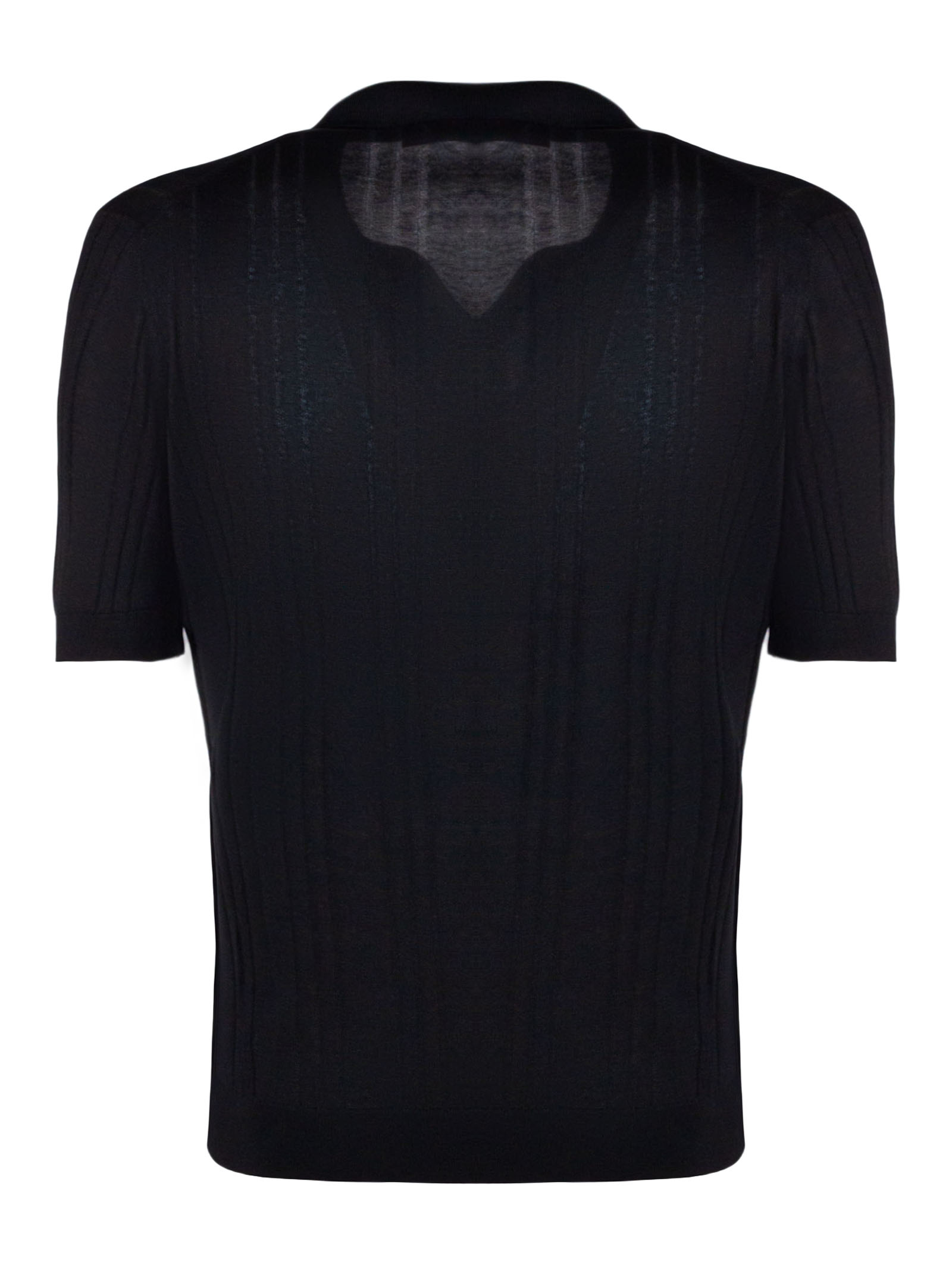 Polo in seta nera con colletto classico senza bottoni, design a costine, maniche corte con costine elasticizzate