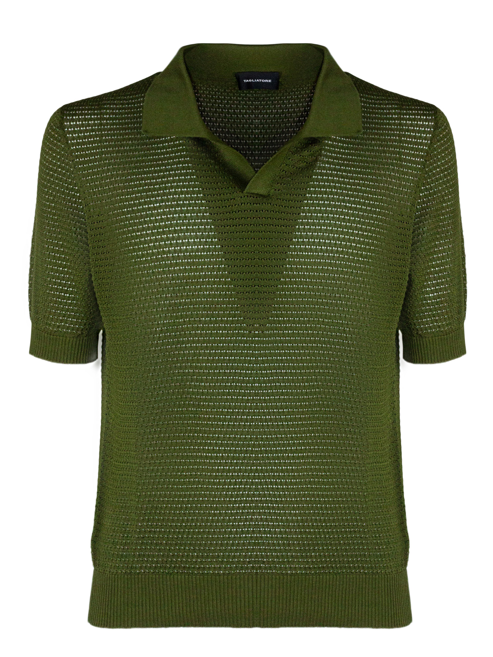 Polo traforata in cotone verde, colletto classico, maniche corte, finiture a costine