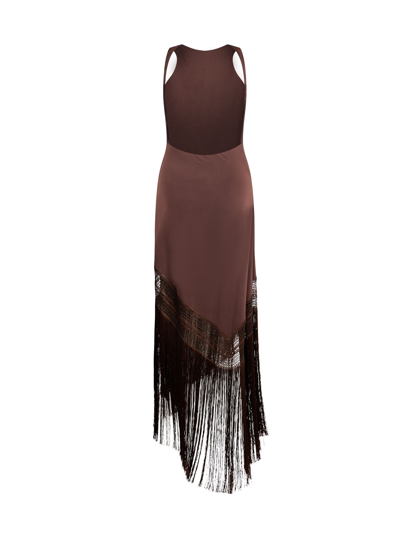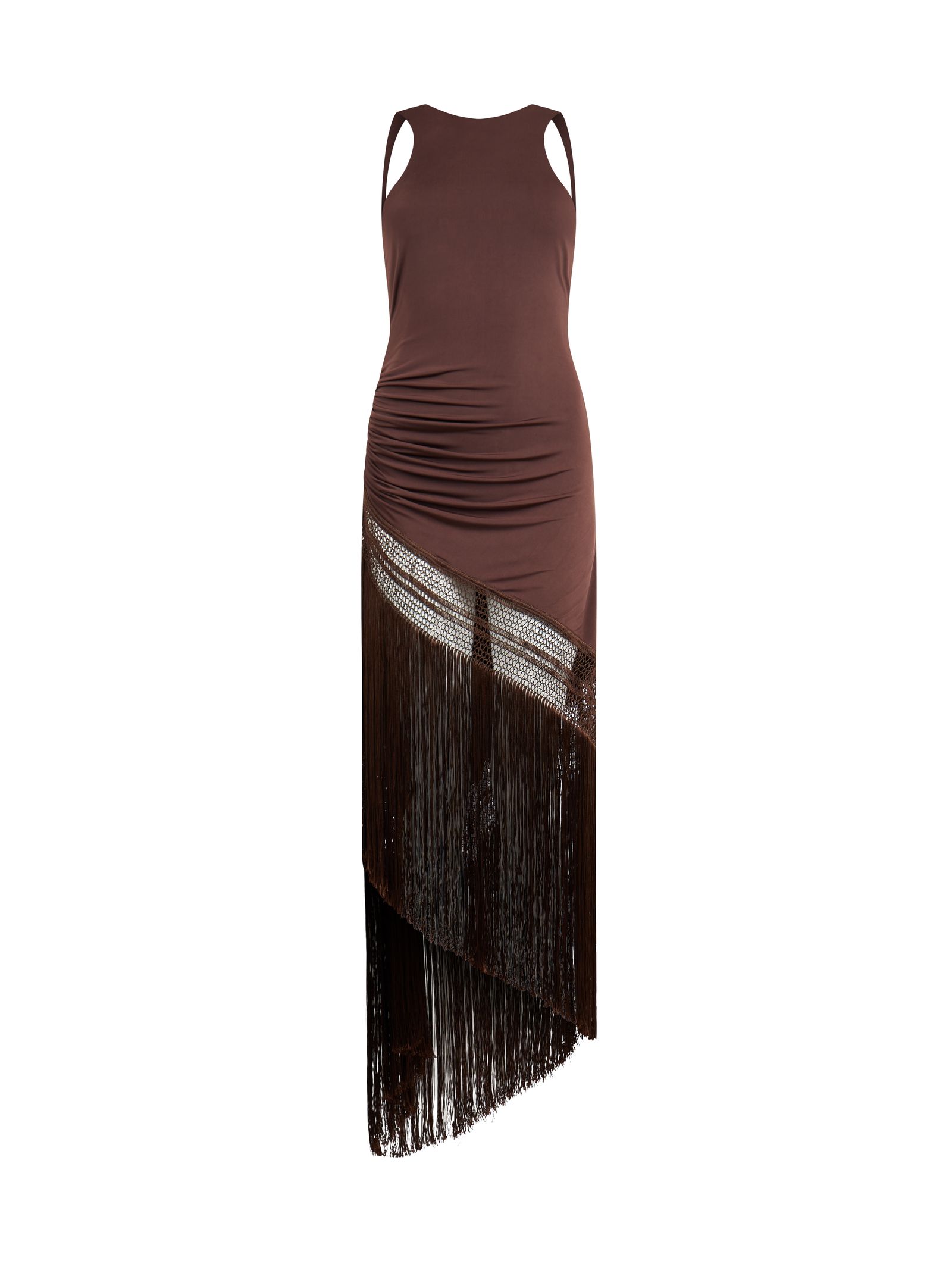 Abito lungo Marisol tessuto stretch, girocollo, senza maniche, drappeggio laterale, inserto trasparente con rete, balza asimmetrica, frange lunghe decorative, fondo irregolare, chiusura pull-on senza zip, vestibilità slim, lunghezza maxi