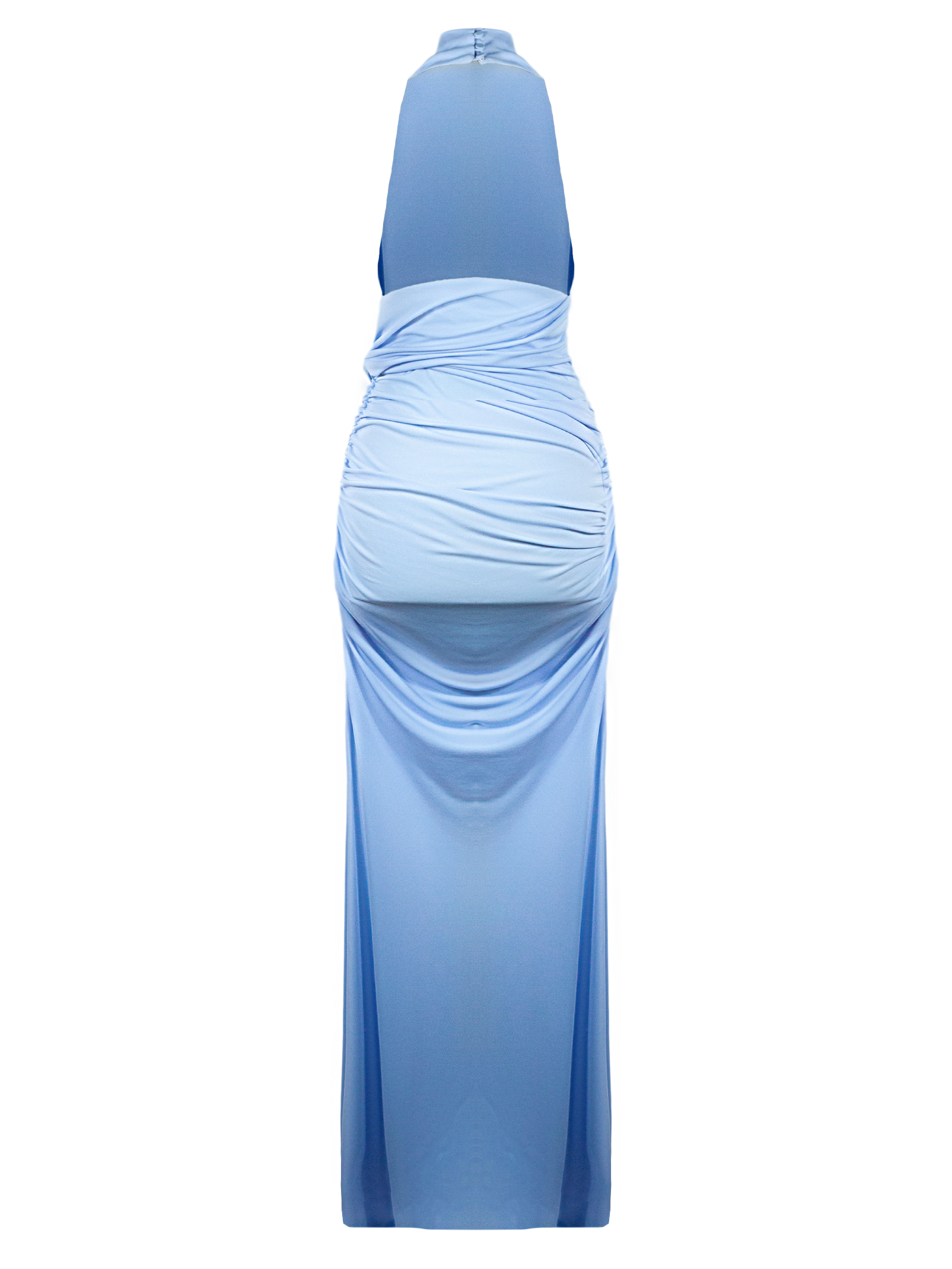 Abito lungo Stella in jersey interlock azzurro, collo alto, senza maniche, chiusura a bottone che incornicia la schiena scoperta. L'abito lungo arriva fino a terra ed è caratterizzato da drappeggi e un nodo in vita