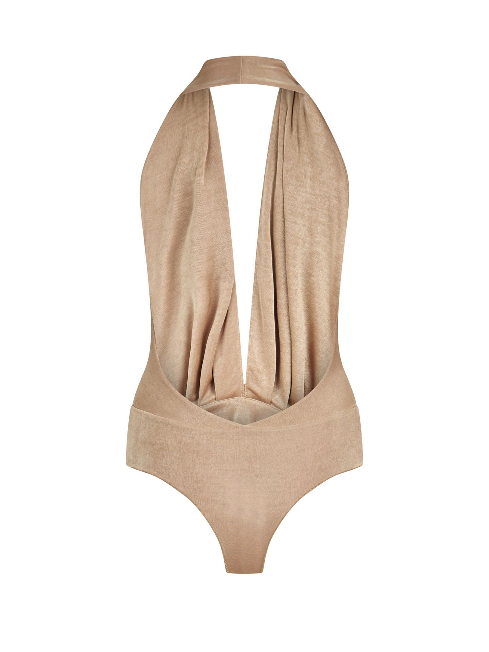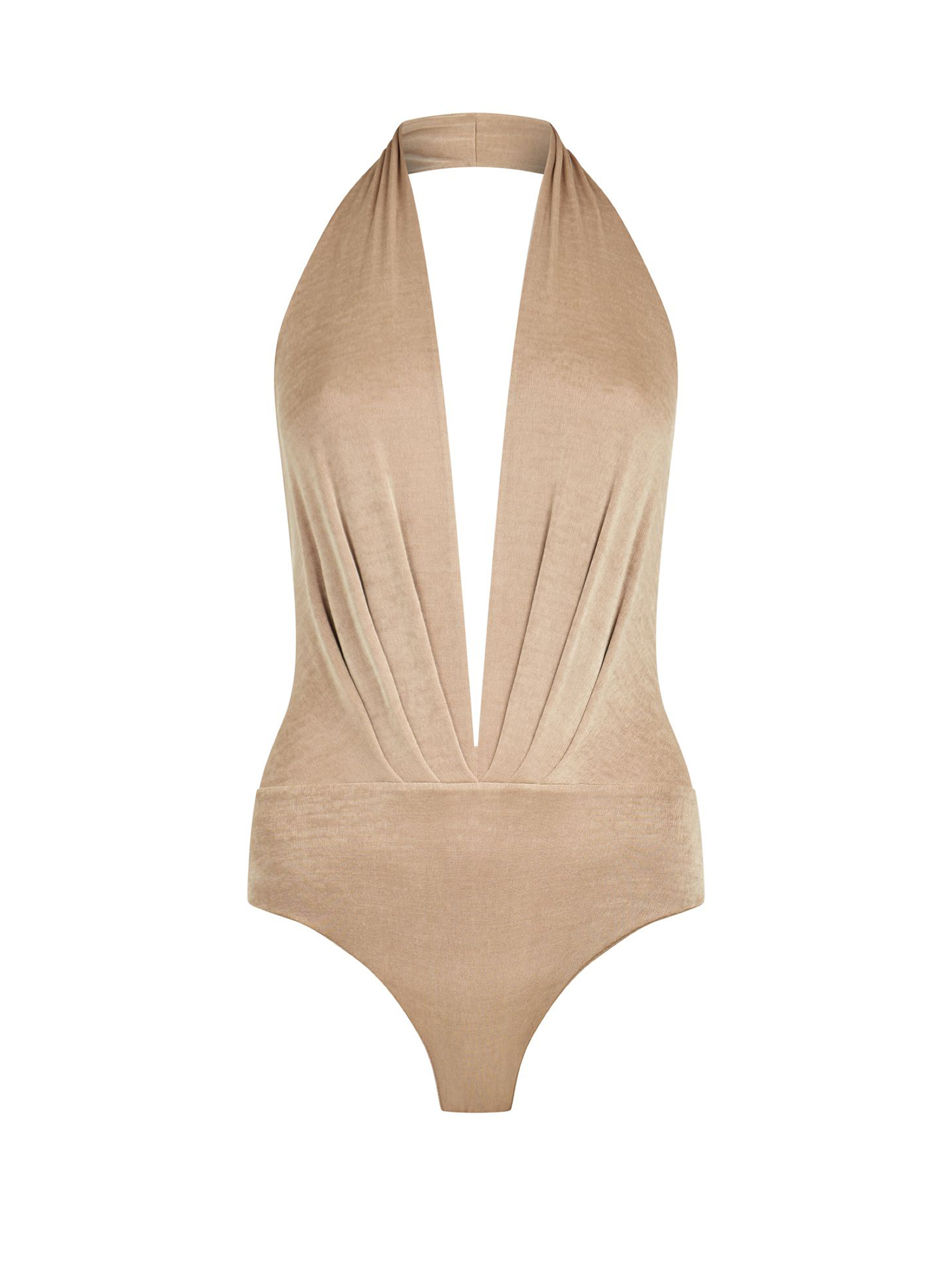 Body con scollo profondo a V, colore oro, design halter con collo scoperto, linea aderente che valorizza la silhouette, tessuto morbido ed elasticizzato, arricciature frontali che creano un effetto drappeggiato, chiusura inferiore pratica, vestibilità confortevole