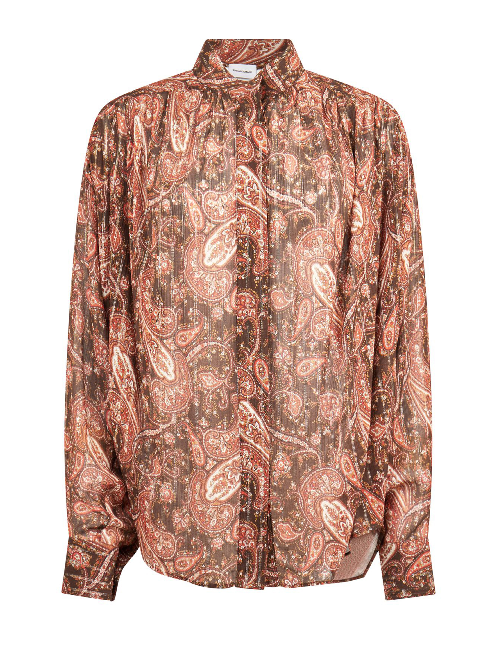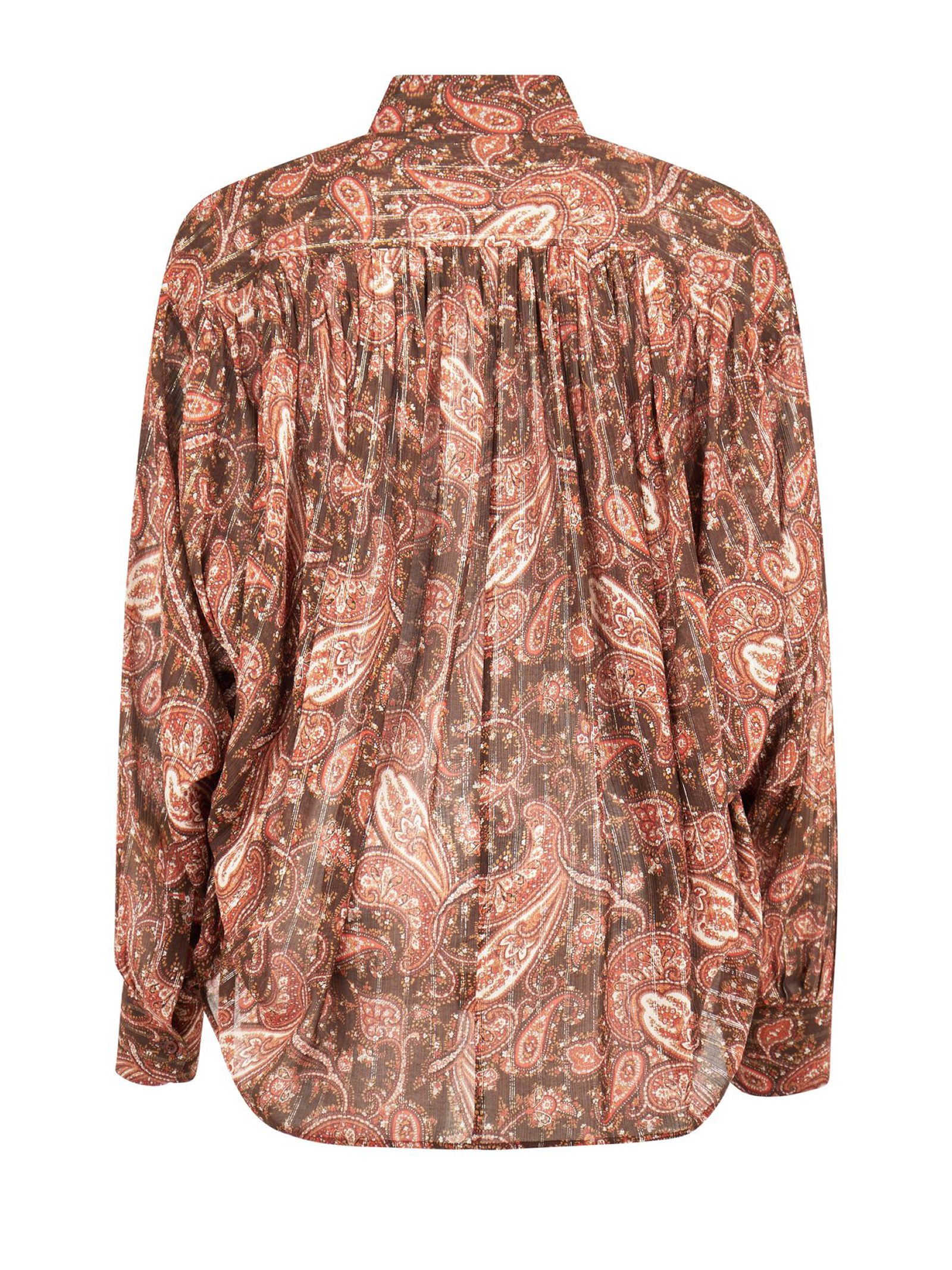 Camicia Raina in misto seta, fantasia paisley nei toni del marrone, beige e arancio, vestibilità morbida con linea dritta, colletto classico con chiusura frontale nascosta, maniche lunghe con volume leggero e polsini con bottone, spalle leggermente arricciate per un effetto morbido, tessuto con finitura leggermente trasparente e texture delicata, fondo arrotondato