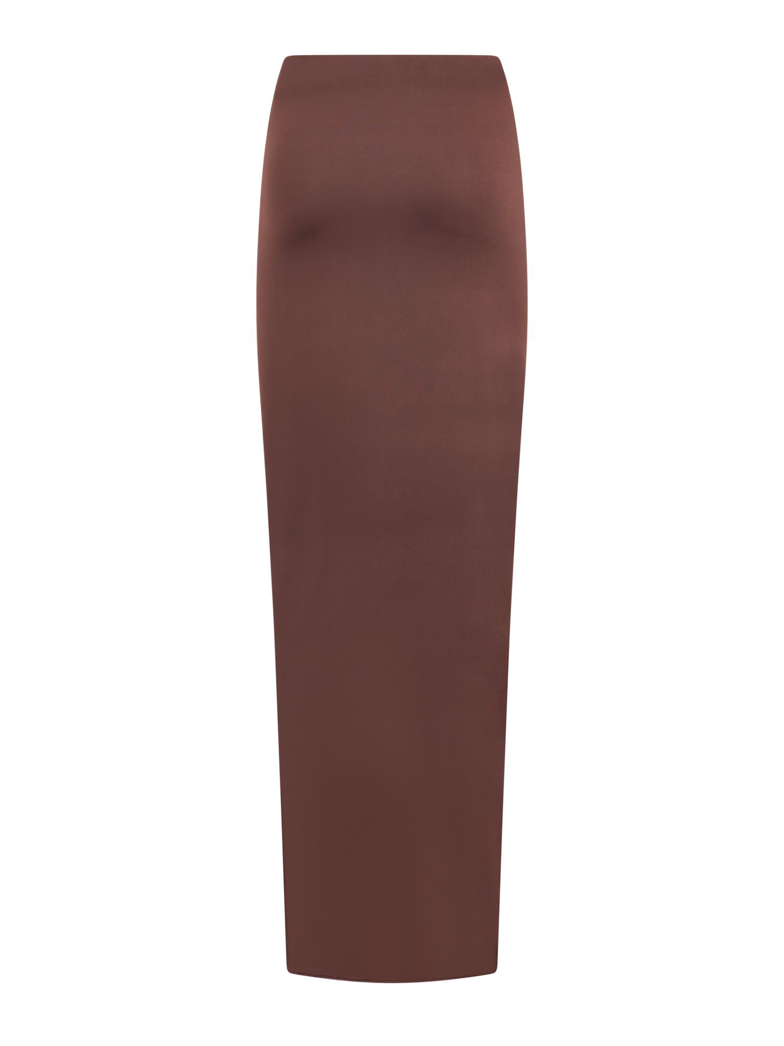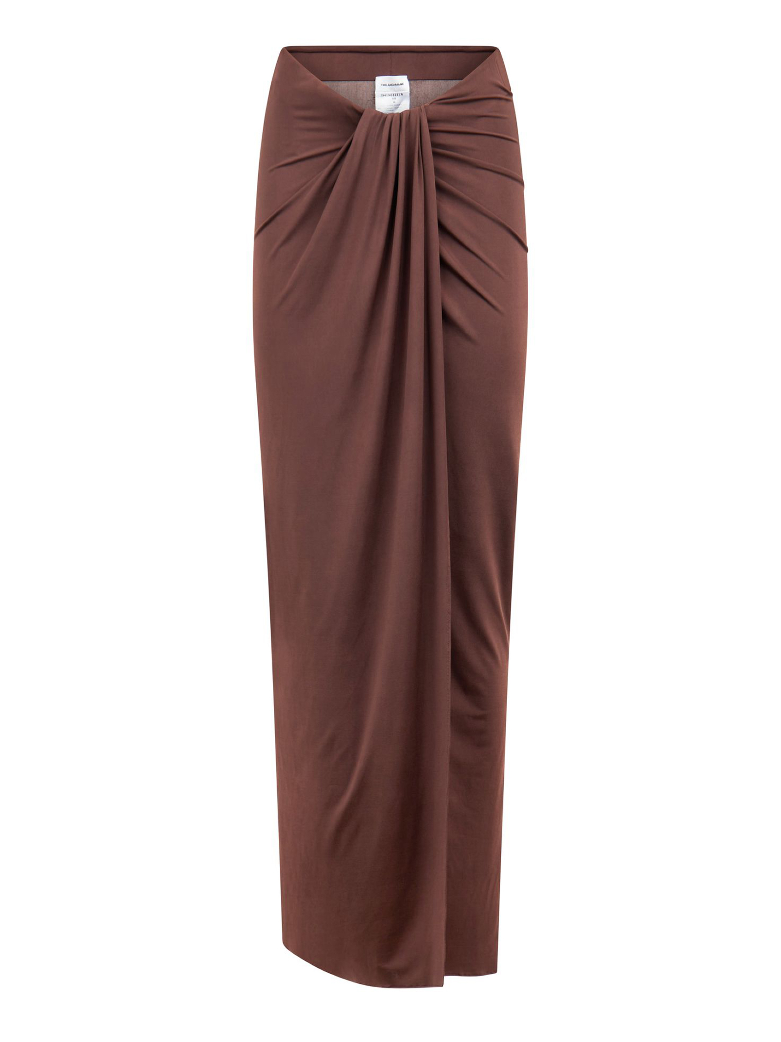 Gonna midi Anja marrone, linea aderente, design drappeggiato frontale, arricciatura centrale, effetto nodo in vita, tessuto elasticizzato, finitura liscia, vita alta, chiusura invisibile, vestibilità slim, colore marrone caldo, lunghezza sotto il ginocchio