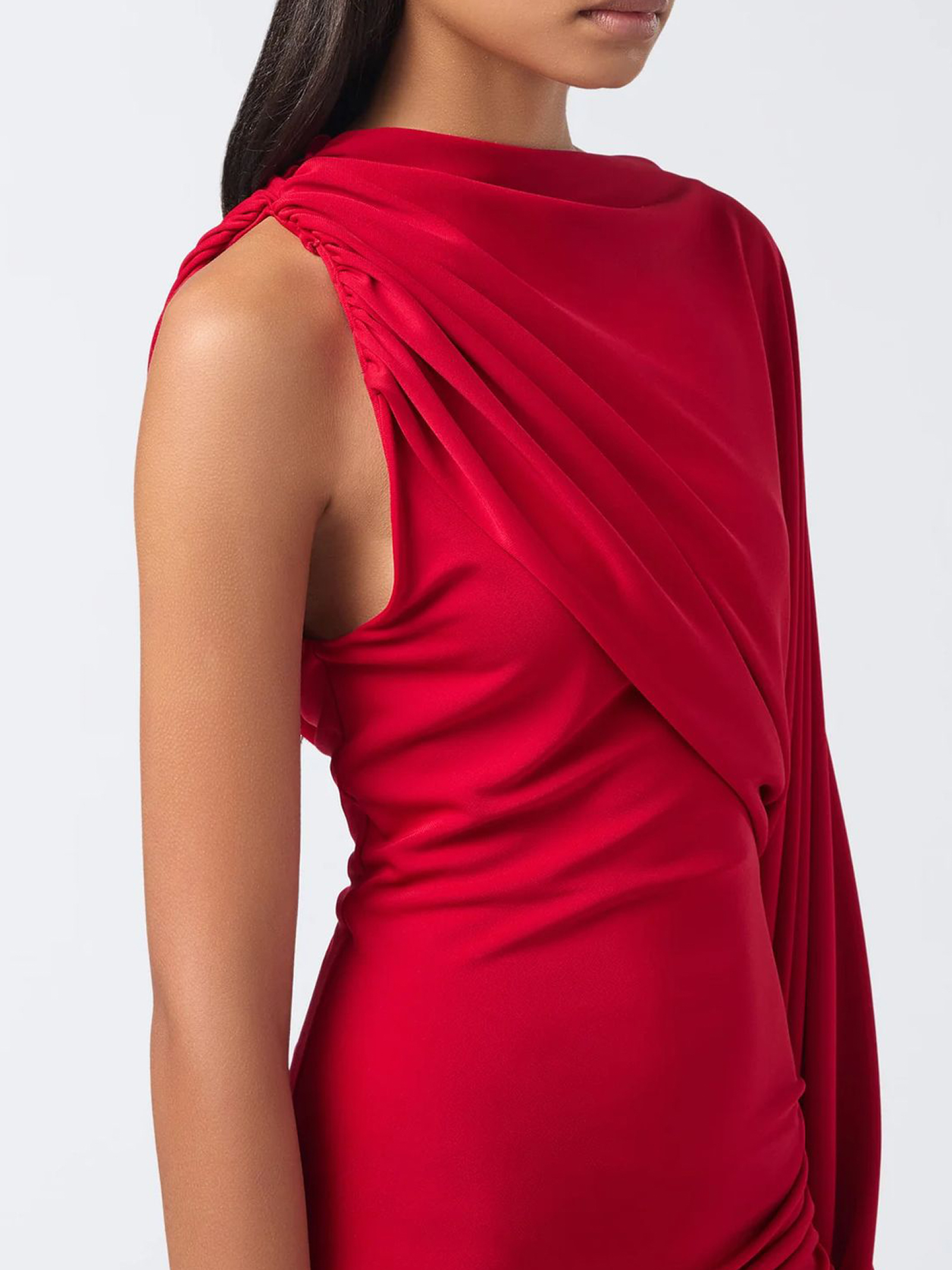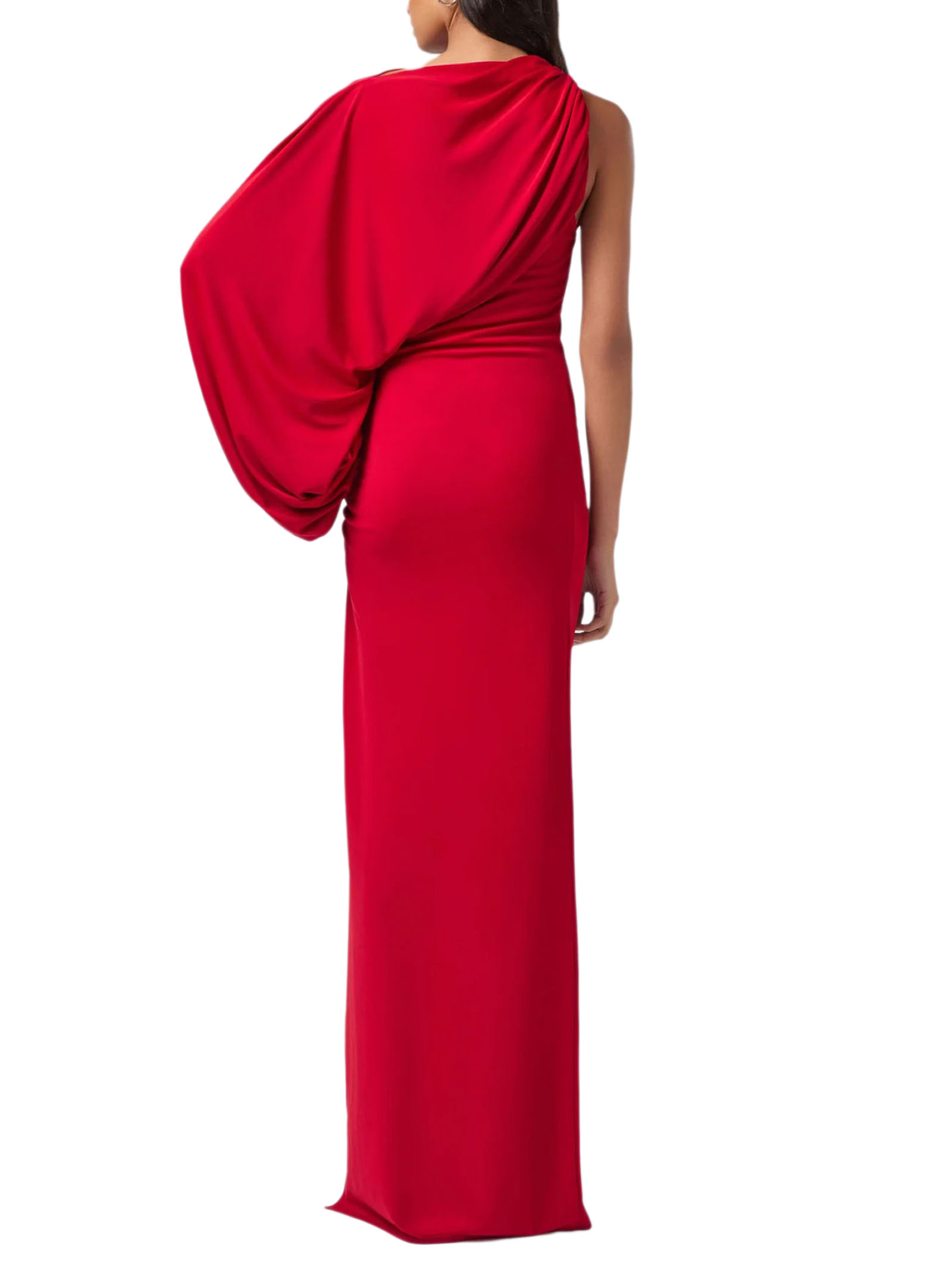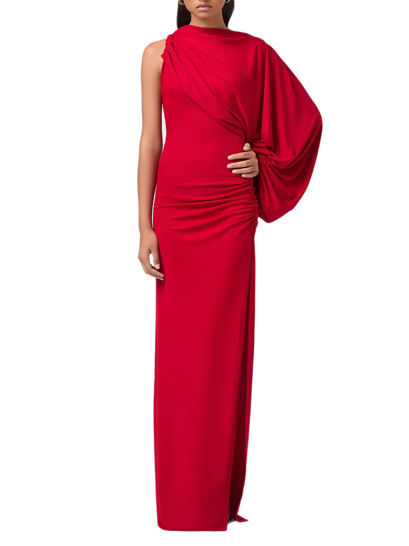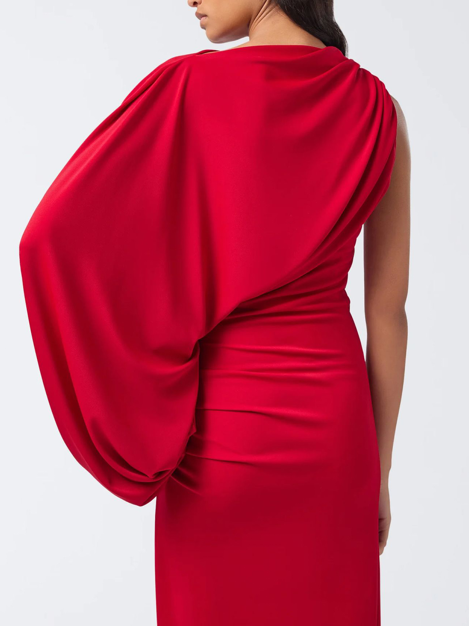 Selene one-shoulder maxi dress in scarlet interlocking jersey, one oversized bishop sleeve, asymmetrical shape, slightly fitted silhouette and ruching at the hip