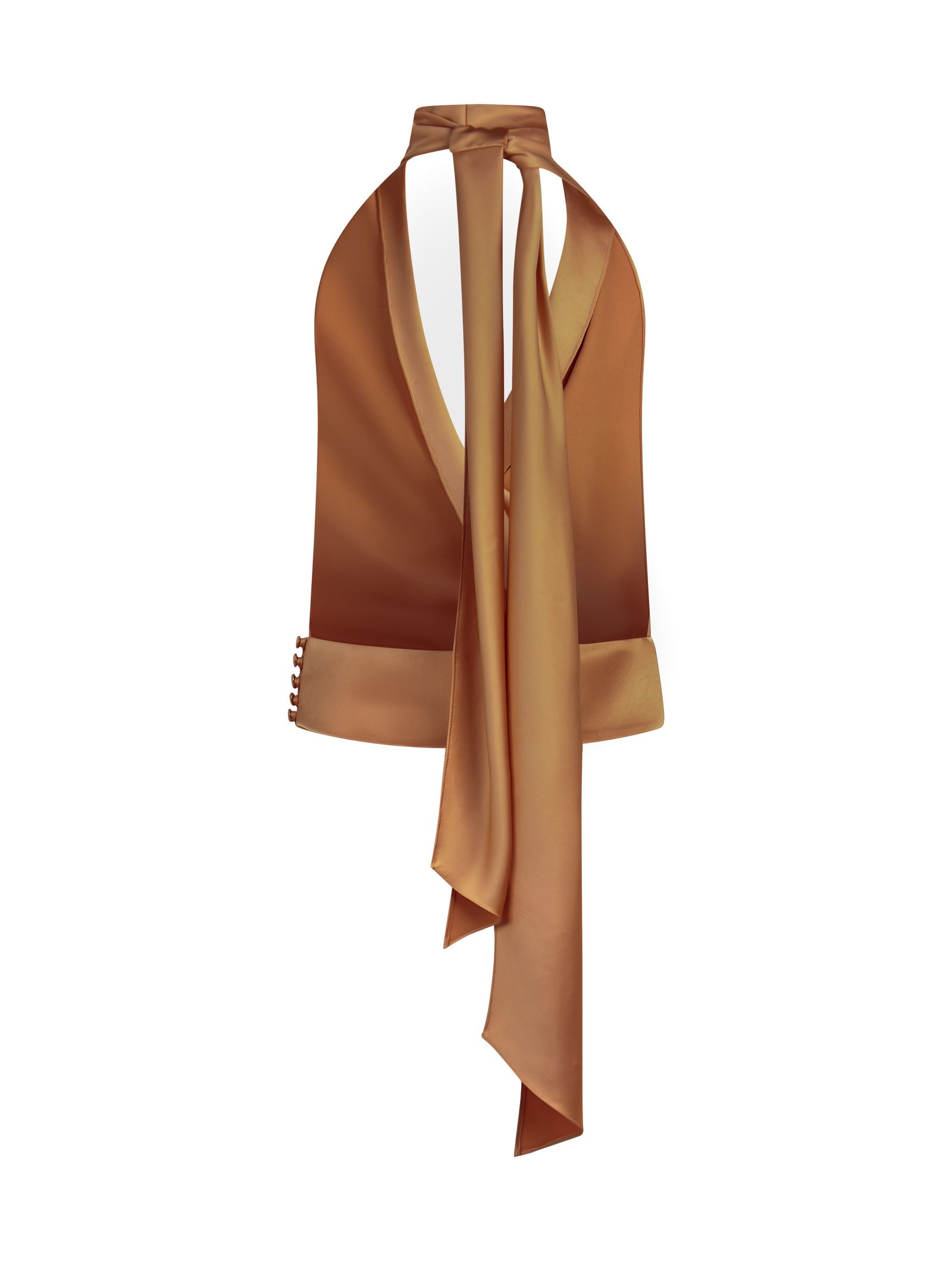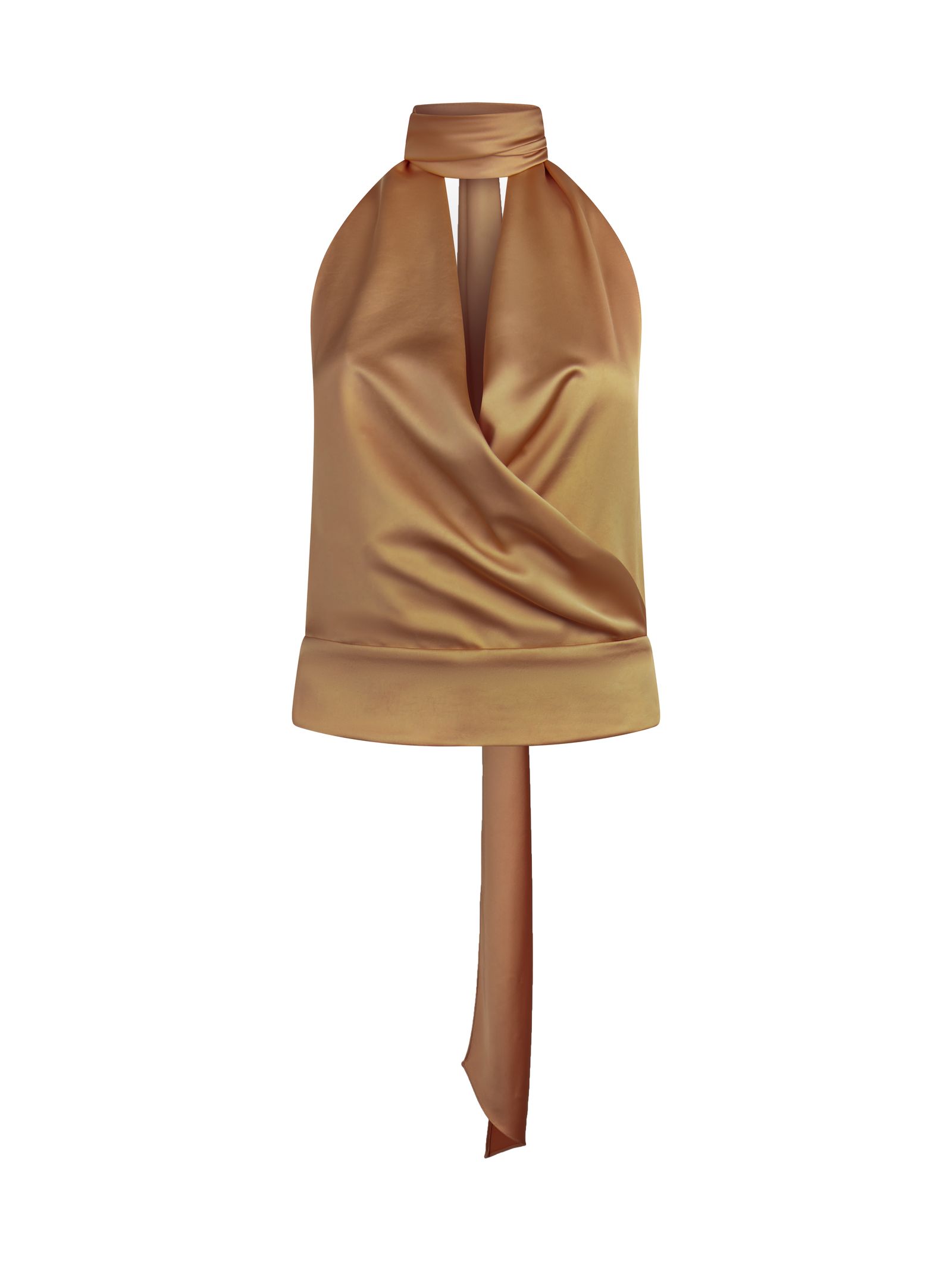Top halter in raso lucido bronzo, scollo profondo a V con drappeggio morbido, collo alto avvolgente con fascia ampia, tessuto fluido e setoso, vestibilità regolare con linea scivolata, orlo inferiore rifinito con banda liscia, design elegante e minimal, chiusura posteriore regolabile