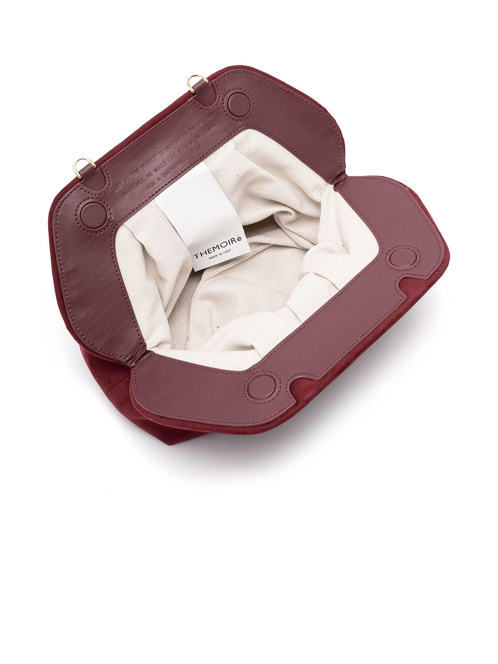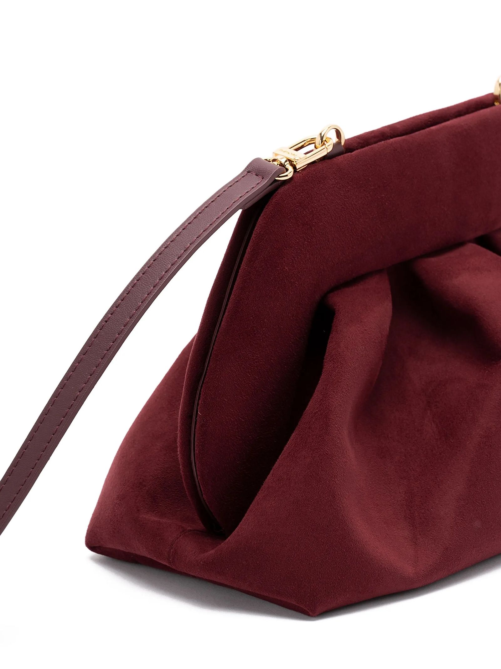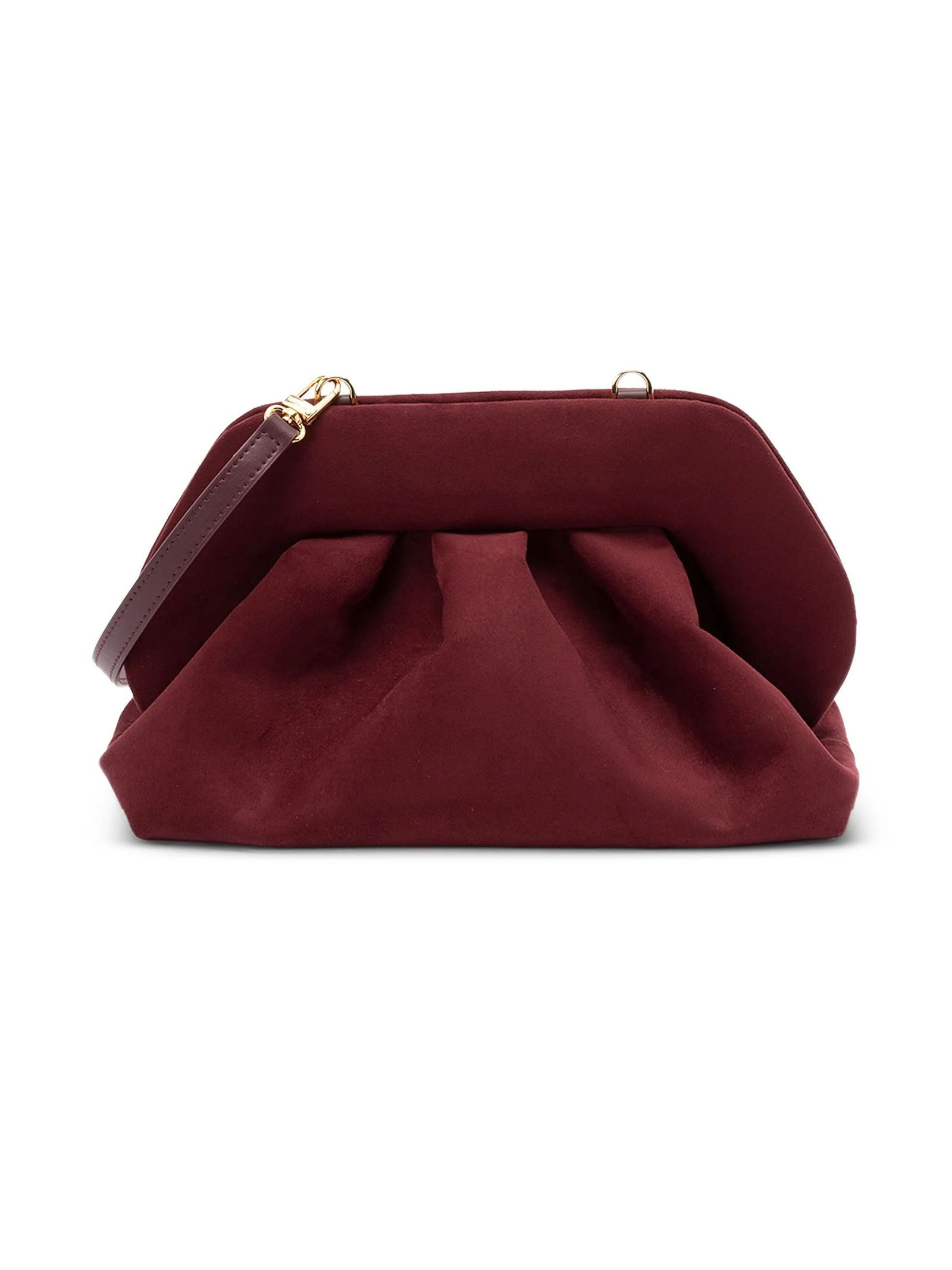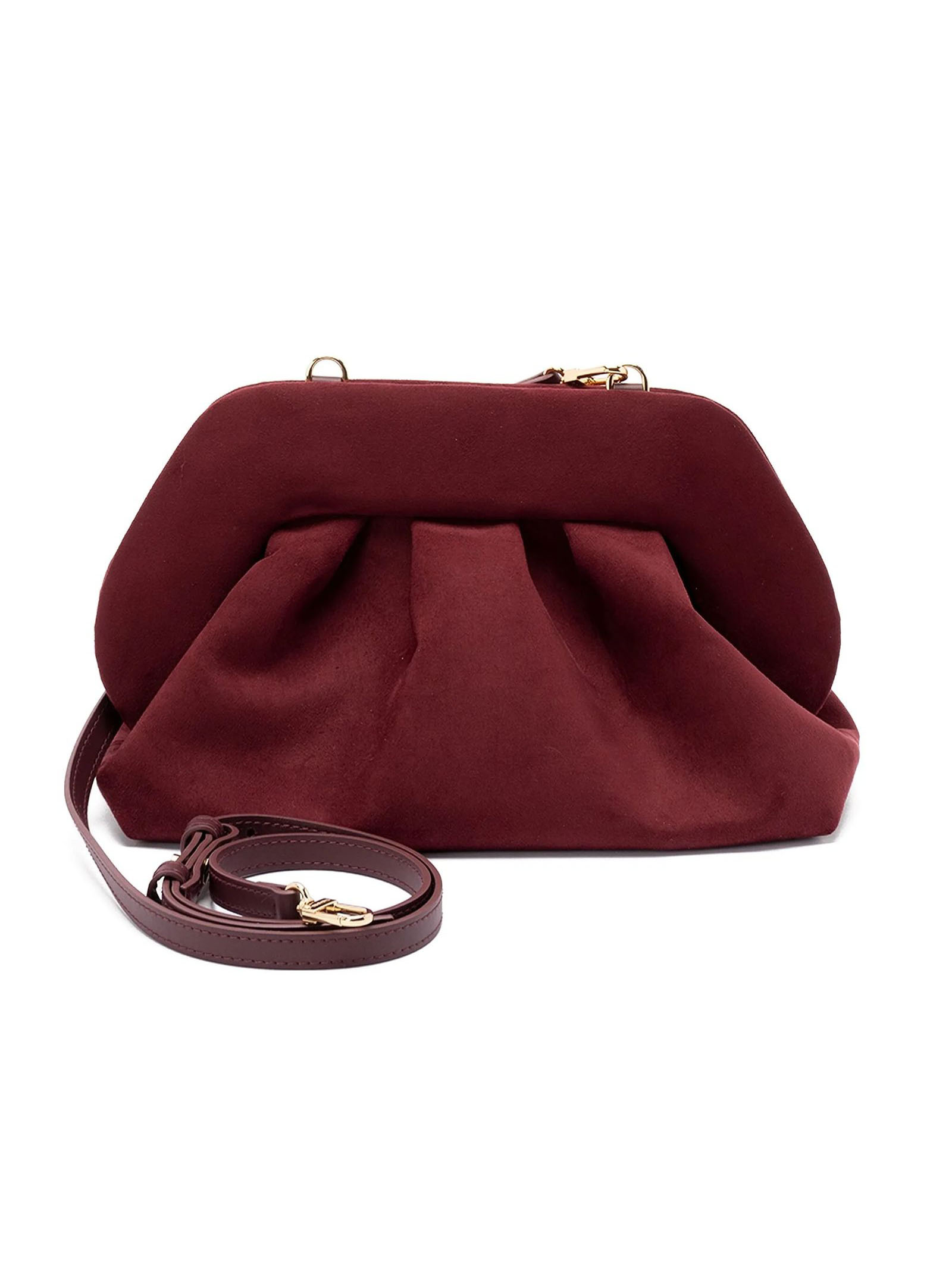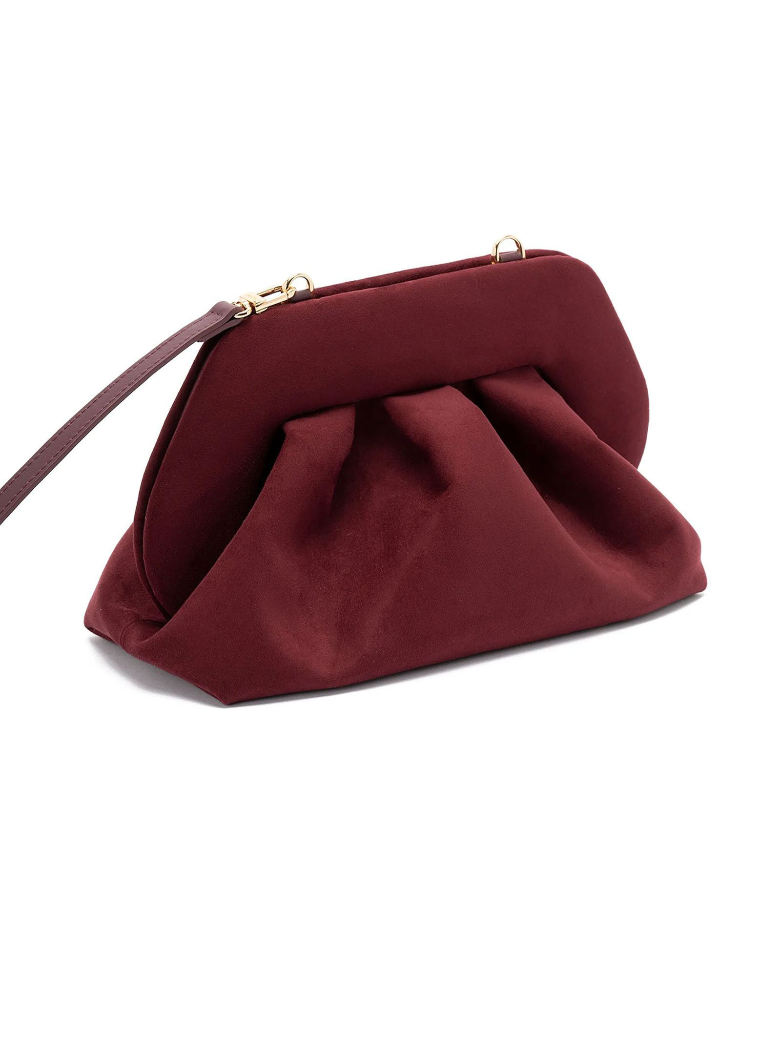Clutch Tia Vegan effetto pelle scamosciata Bordeaux, chiusura magnetica, dettaglio con arricciature, chiusura a fermaglio, tracolla removibile, Dimensioni: L30 x A16 x P15 cm