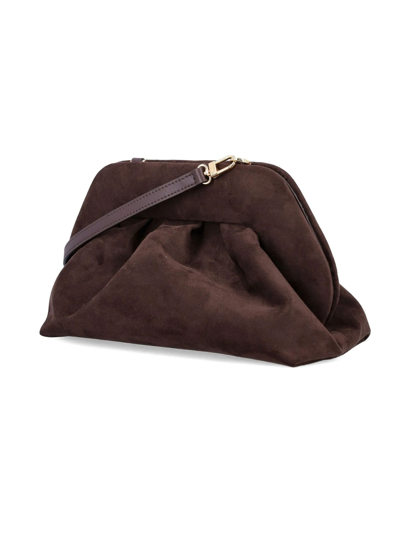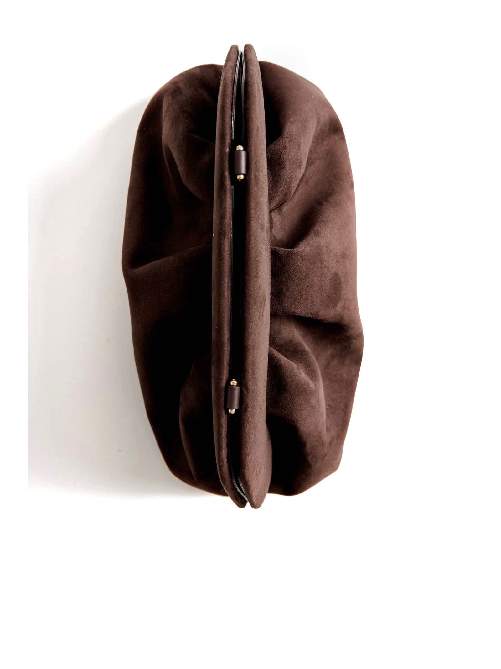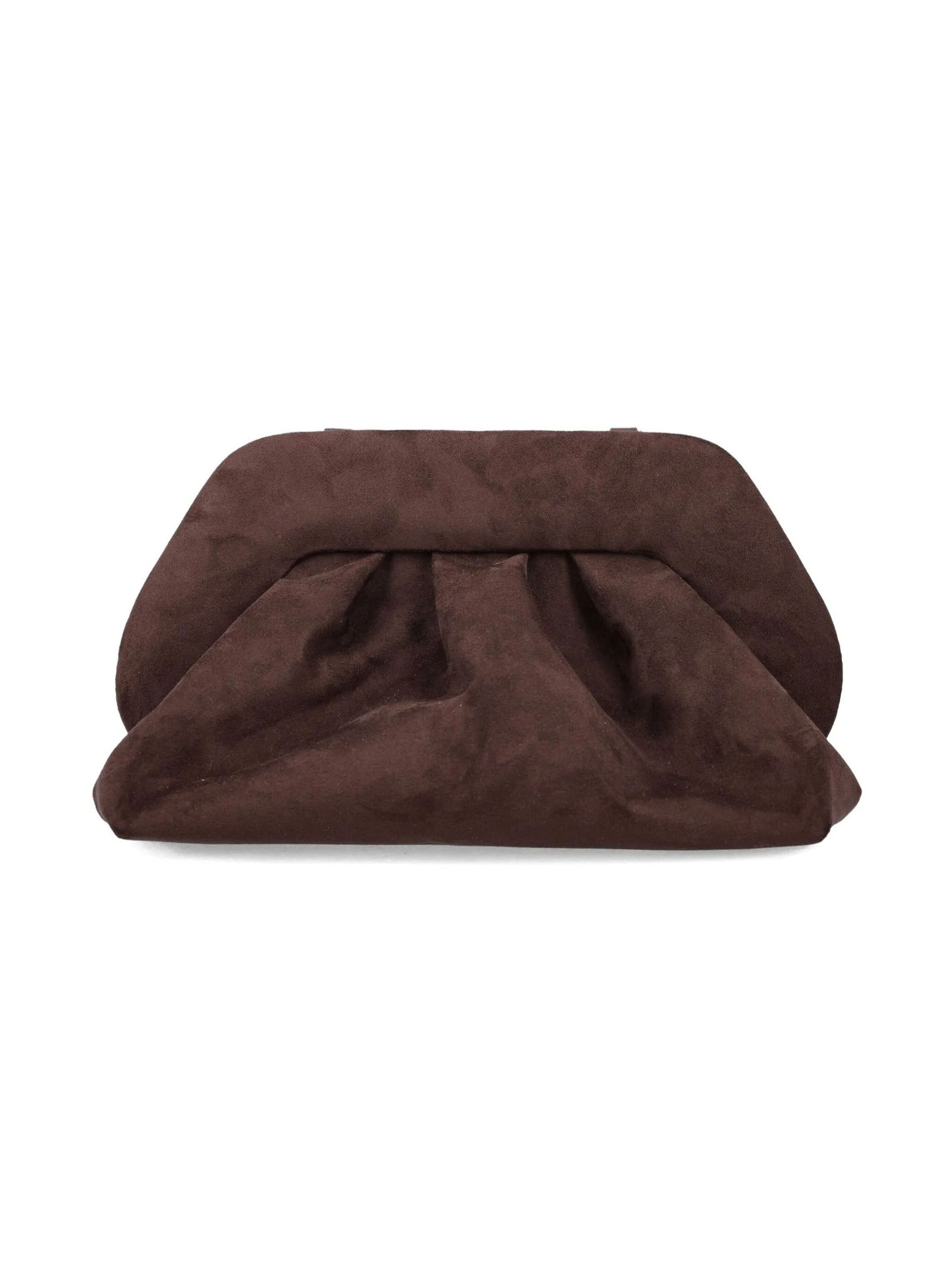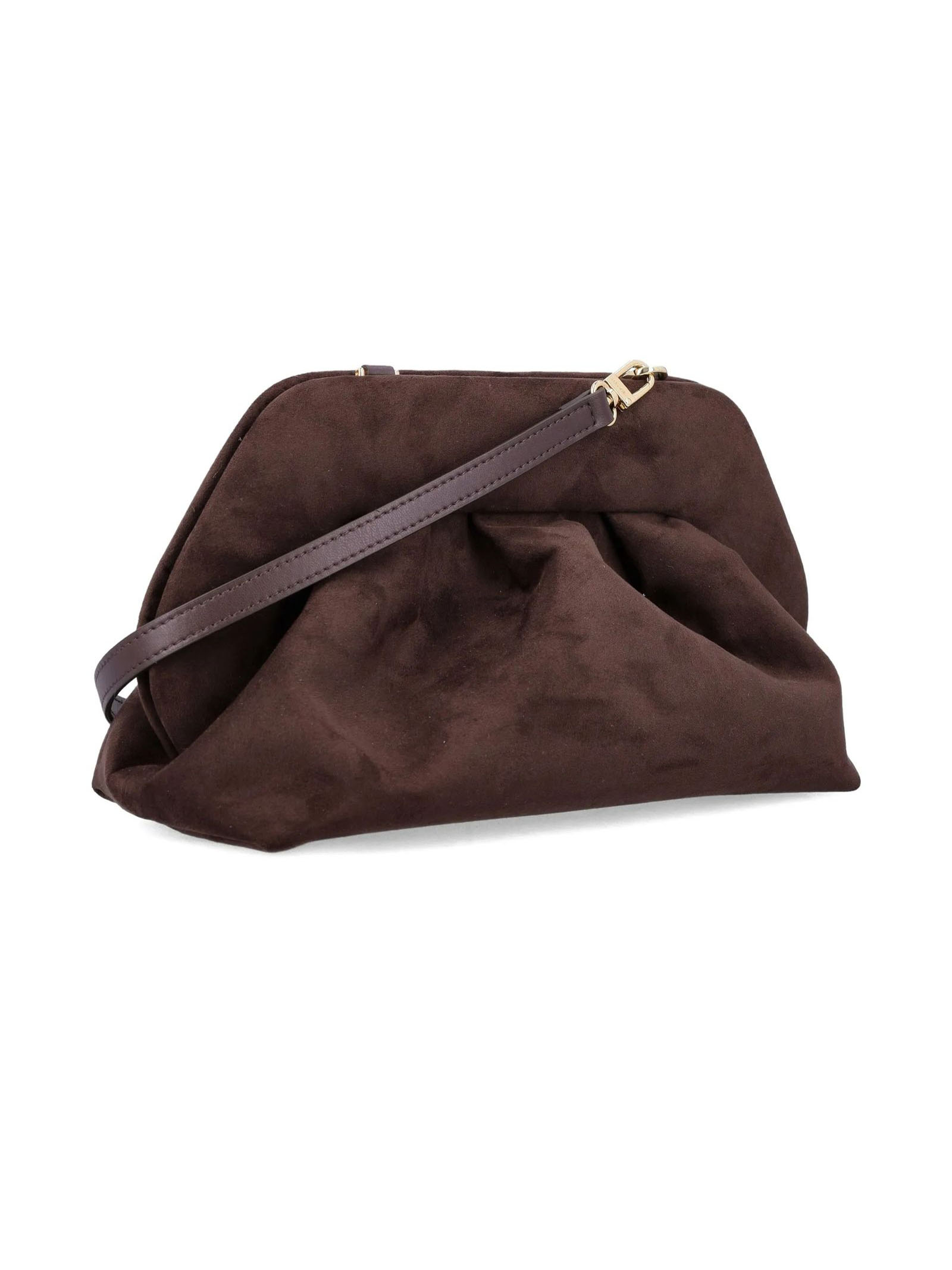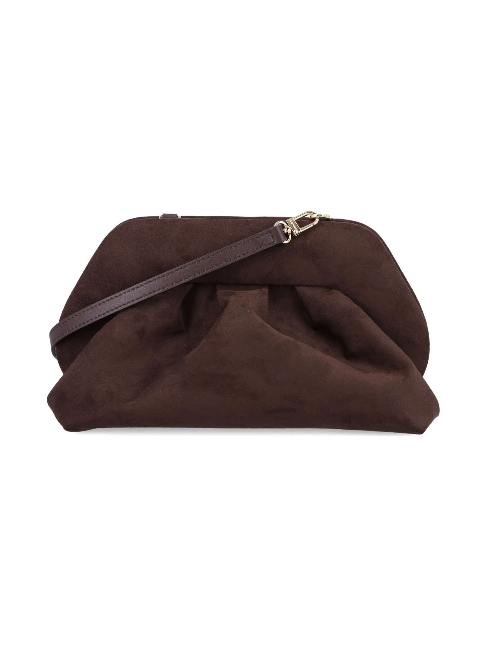 Clutch Tia Vegan effetto pelle scamosciata marrone, chiusura magnetica, dettaglio con arricciature, chiusura a fermaglio, tracolla removibile, Dimensioni: L30 x A16 x P15 cm