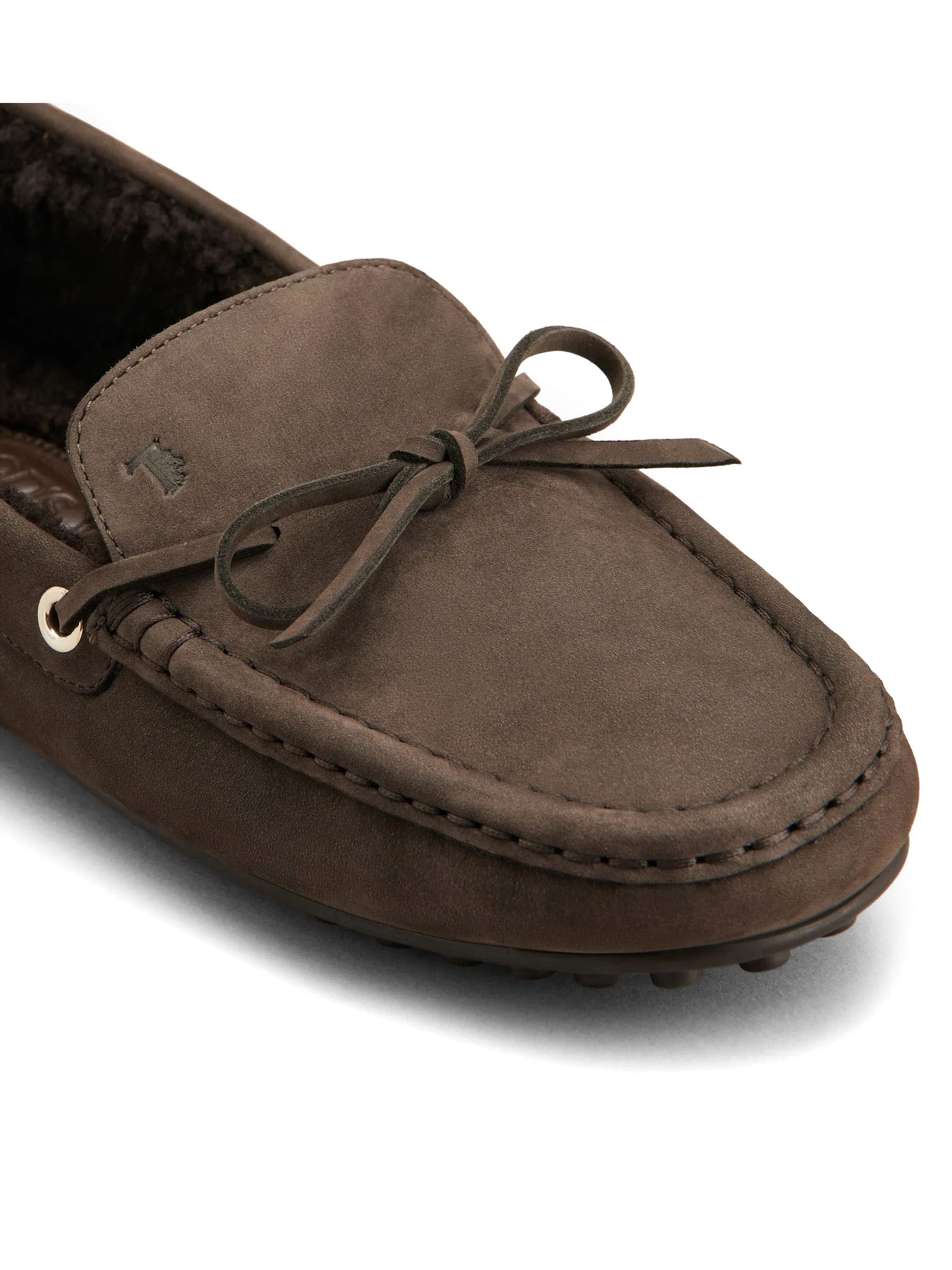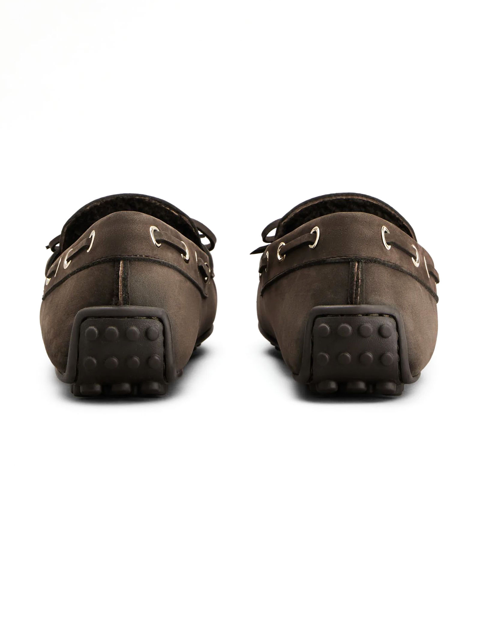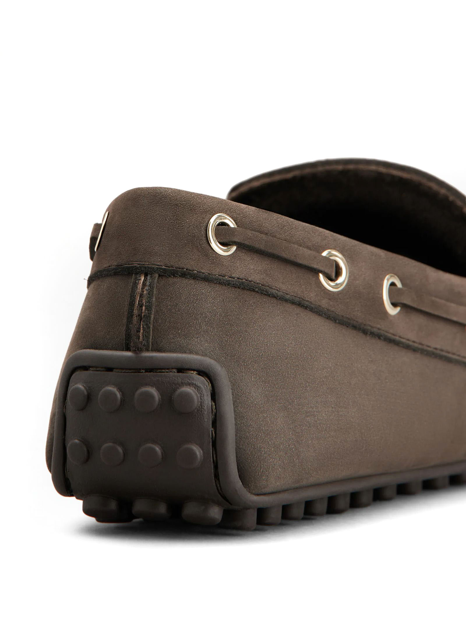 City Gommino Mocassino in Nabuk marrone, laccetto passante, impunture realizzate a mano, fodera e sottopiede in montone, dettaglio con gommini sul tallone, suola in gomma con gommini