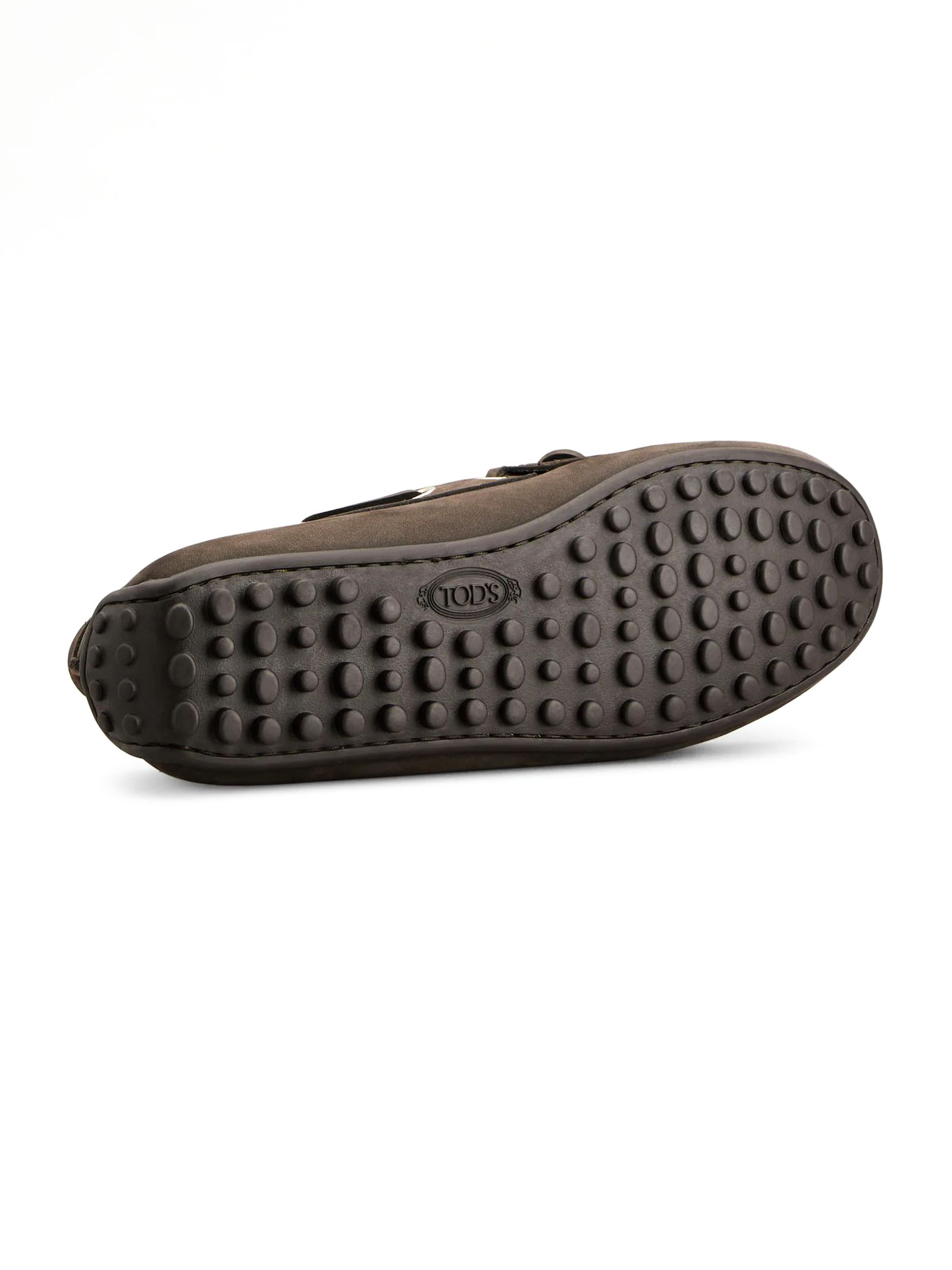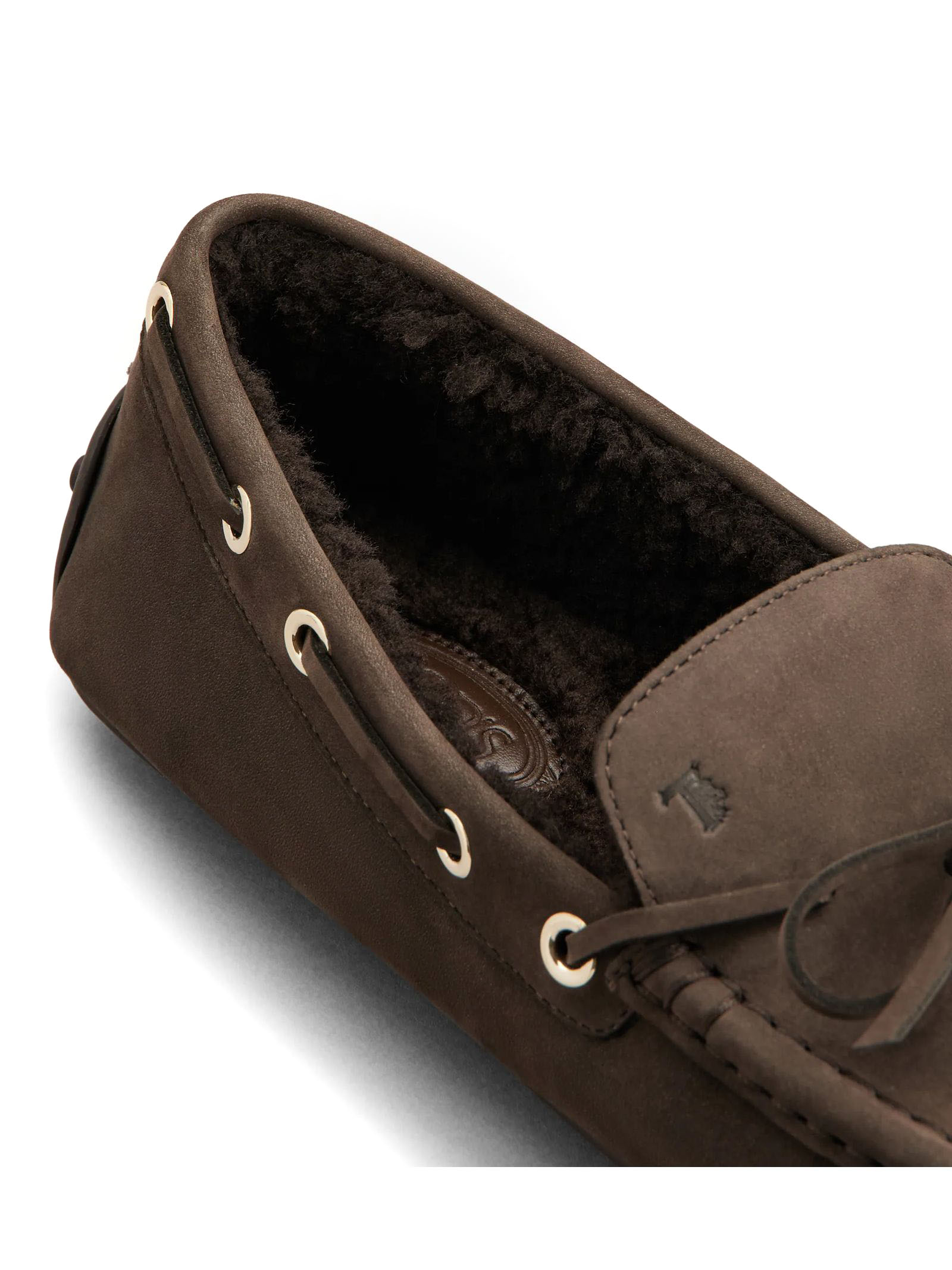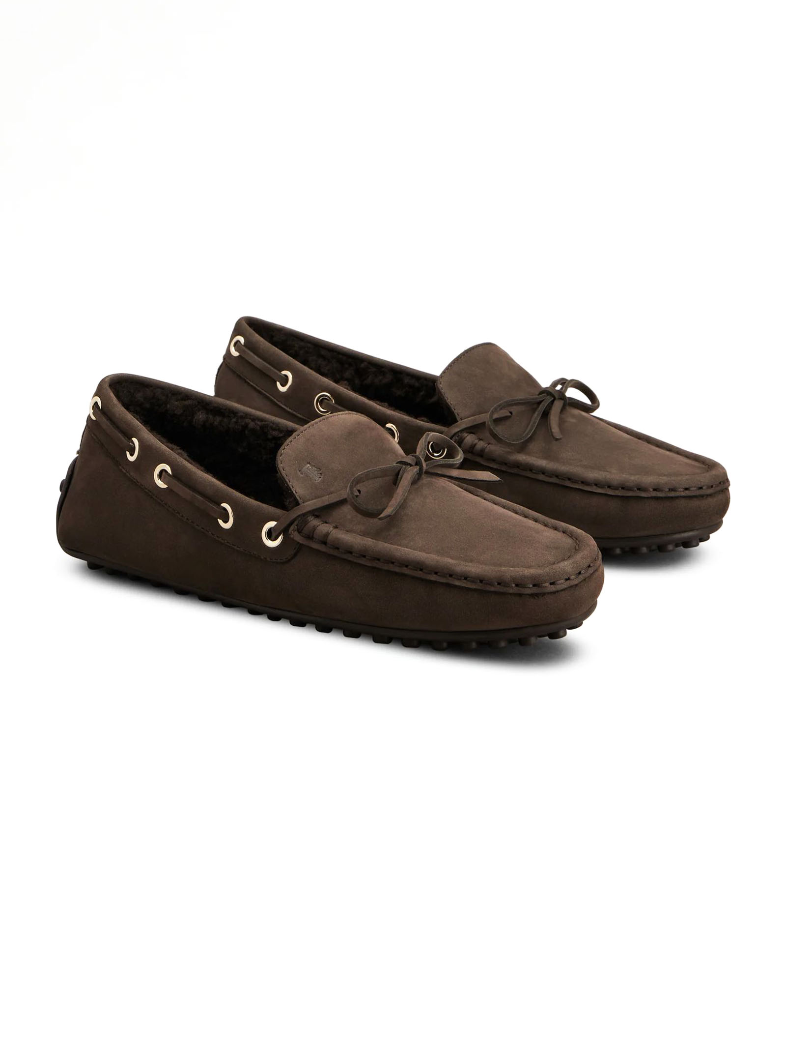 City Gommino Mocassino in Nabuk marrone, laccetto passante, impunture realizzate a mano, fodera e sottopiede in montone, dettaglio con gommini sul tallone, suola in gomma con gommini