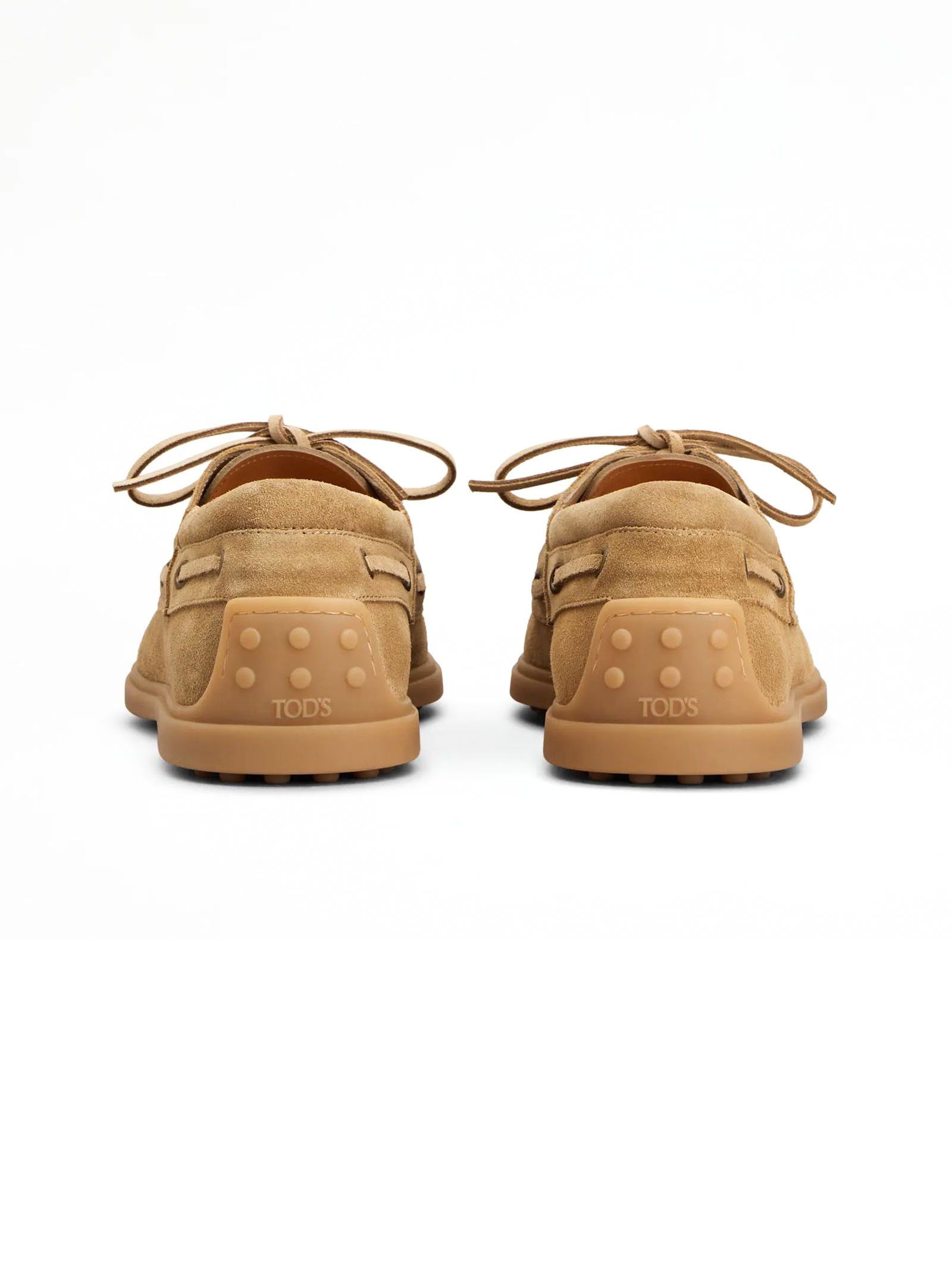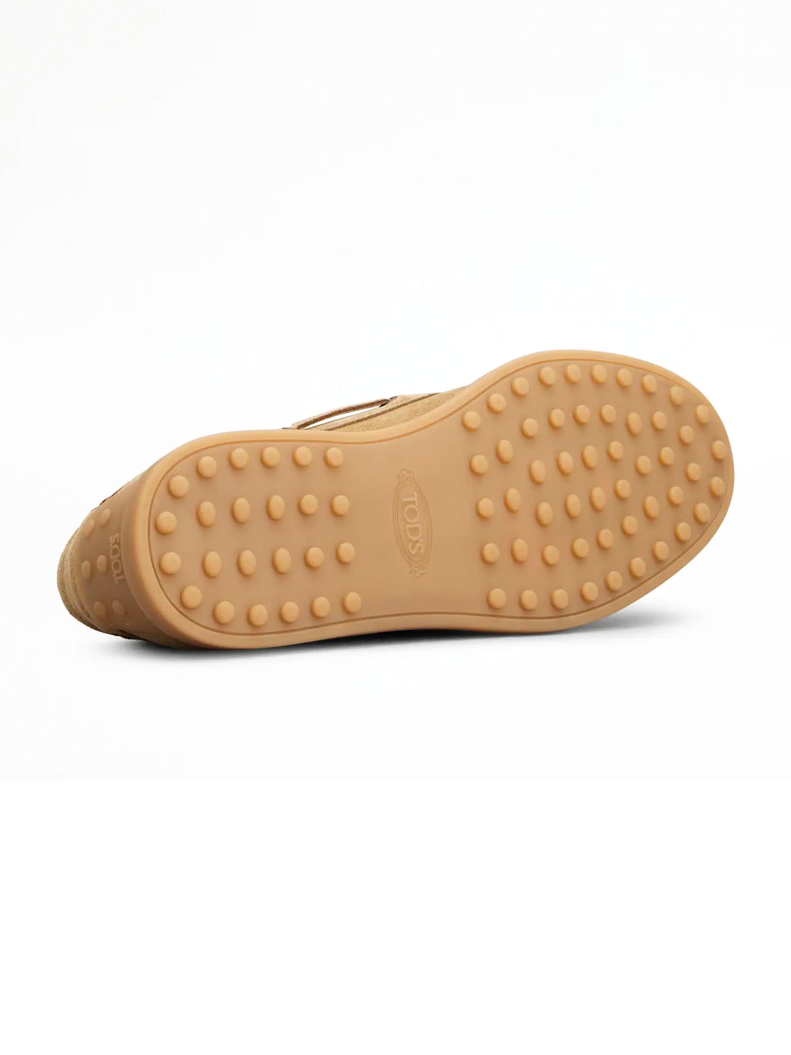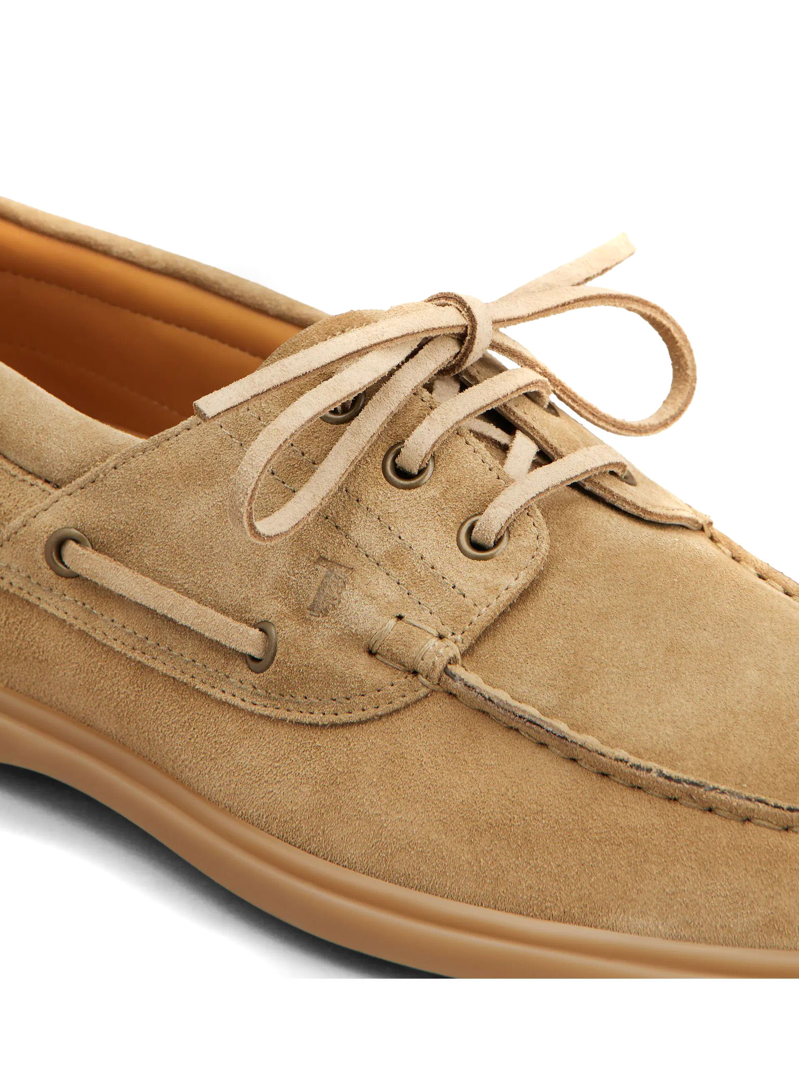 Scarpa da Barca in Pelle Scamosciata beige, Monogramma Tod's impresso, Laccetto passante, Impunture a vista realizzate a mano, Fodera e sottopiede in pelle, Suola in gomma con dettagli a rilievo