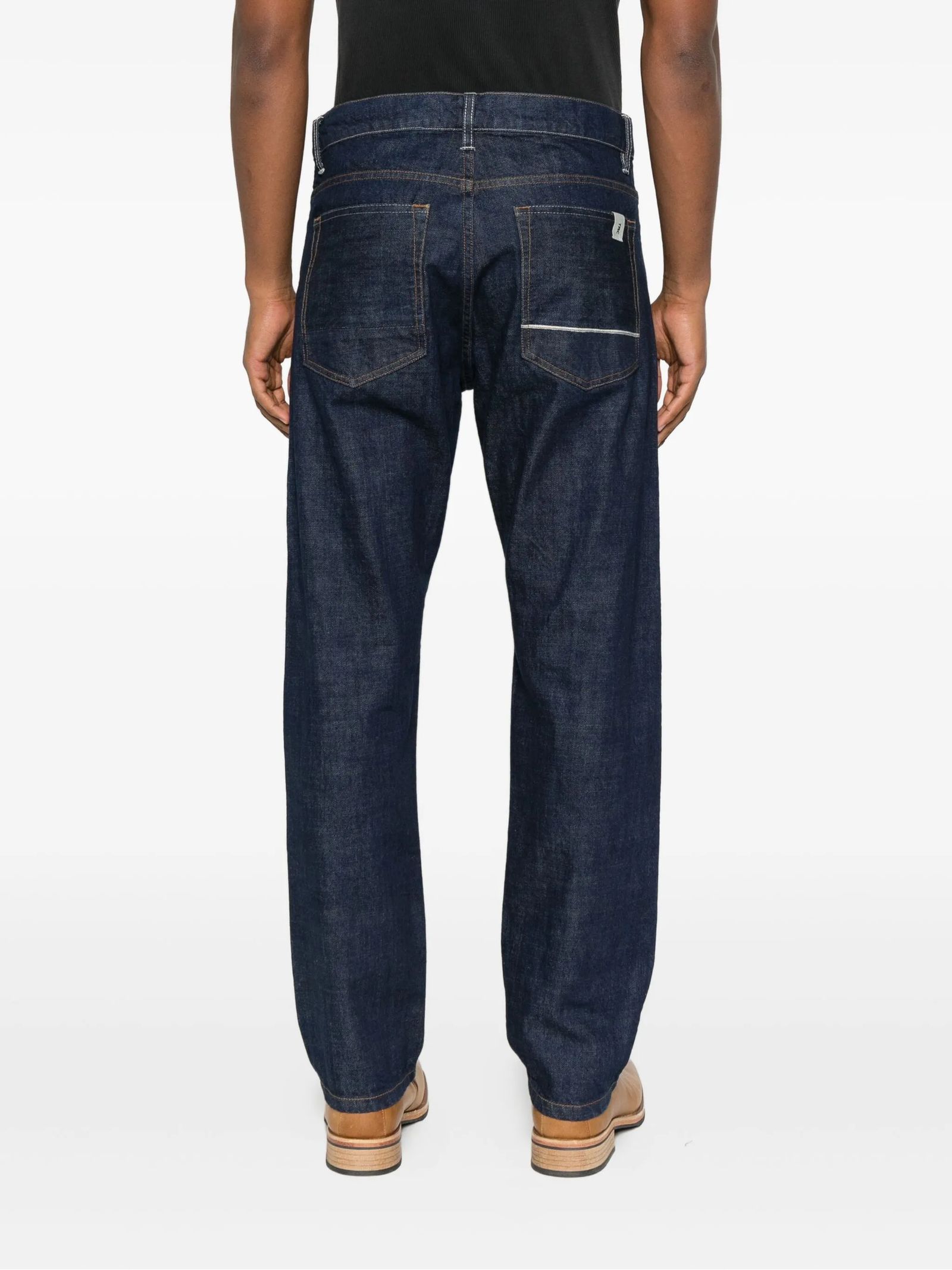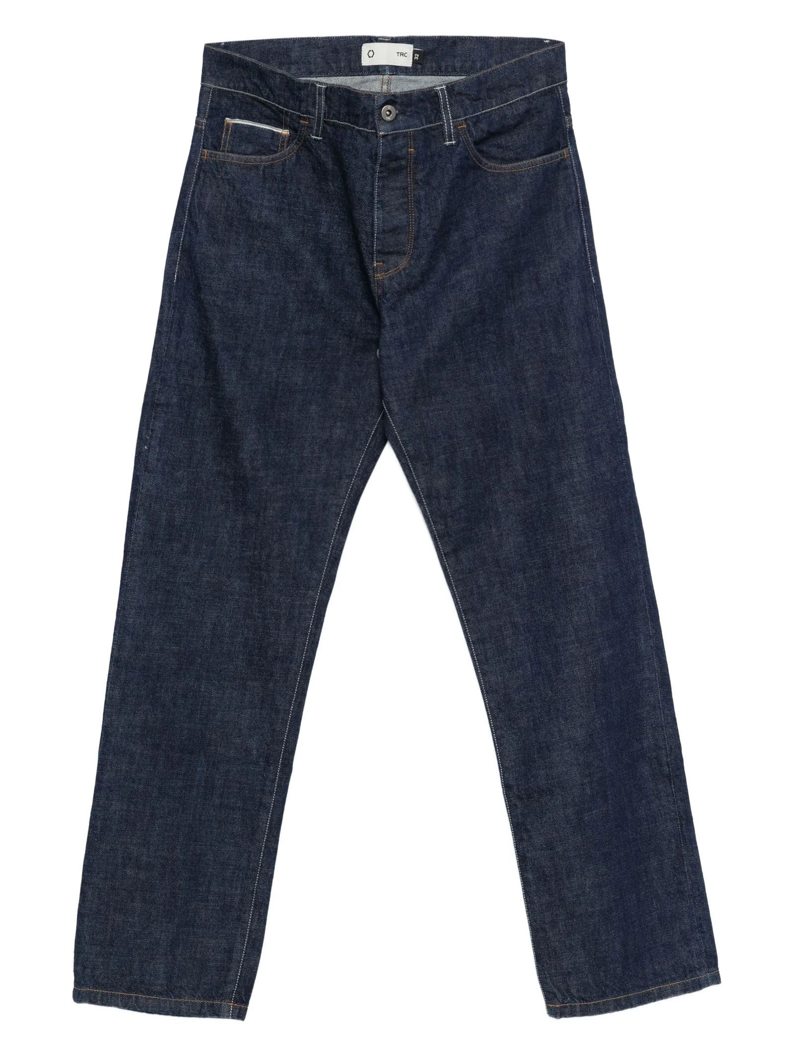 Jeans in denim blu scuro, chiusura con bottoni, cinque tasche, gamba dritta, cuciture a contrasto