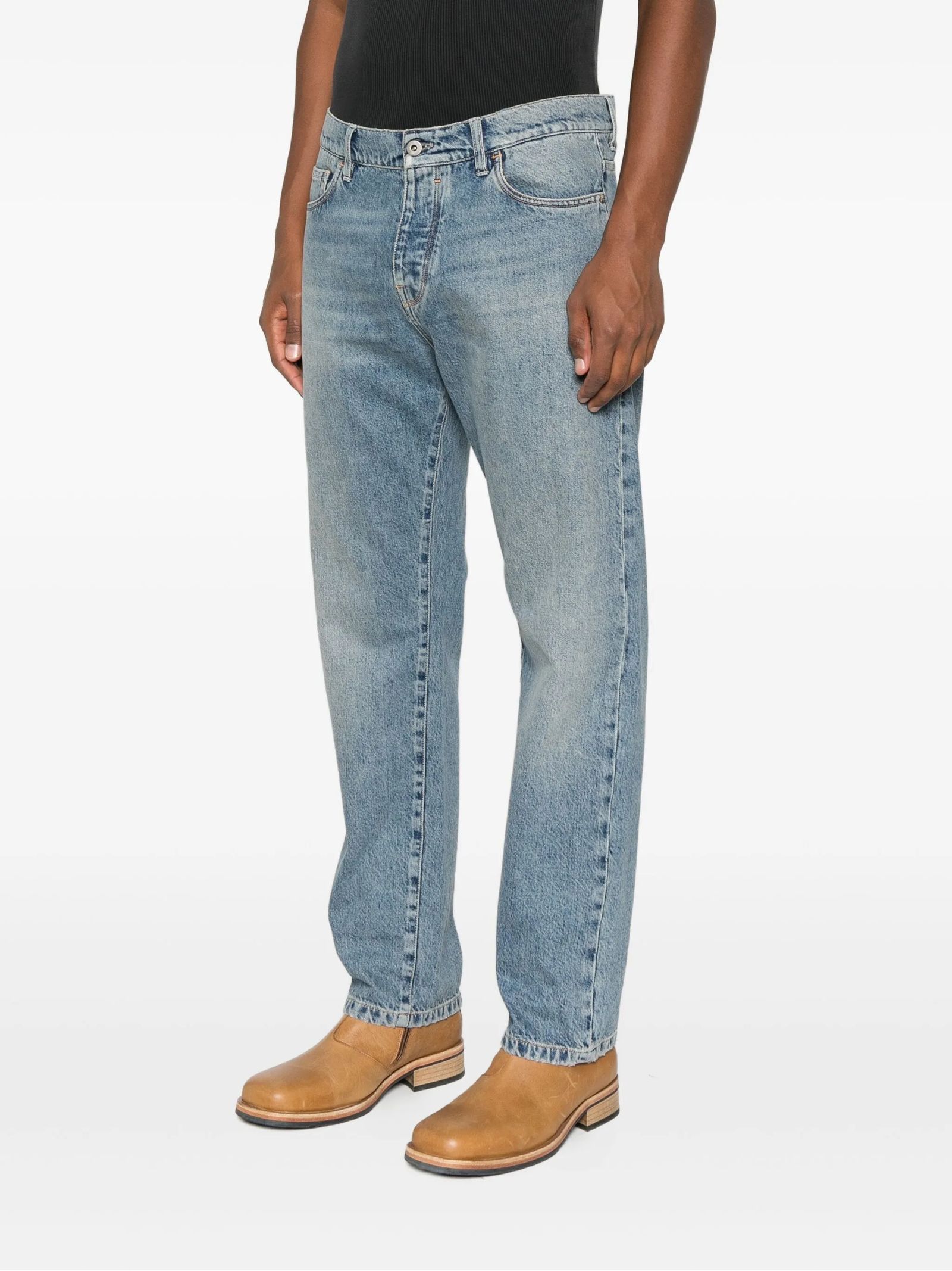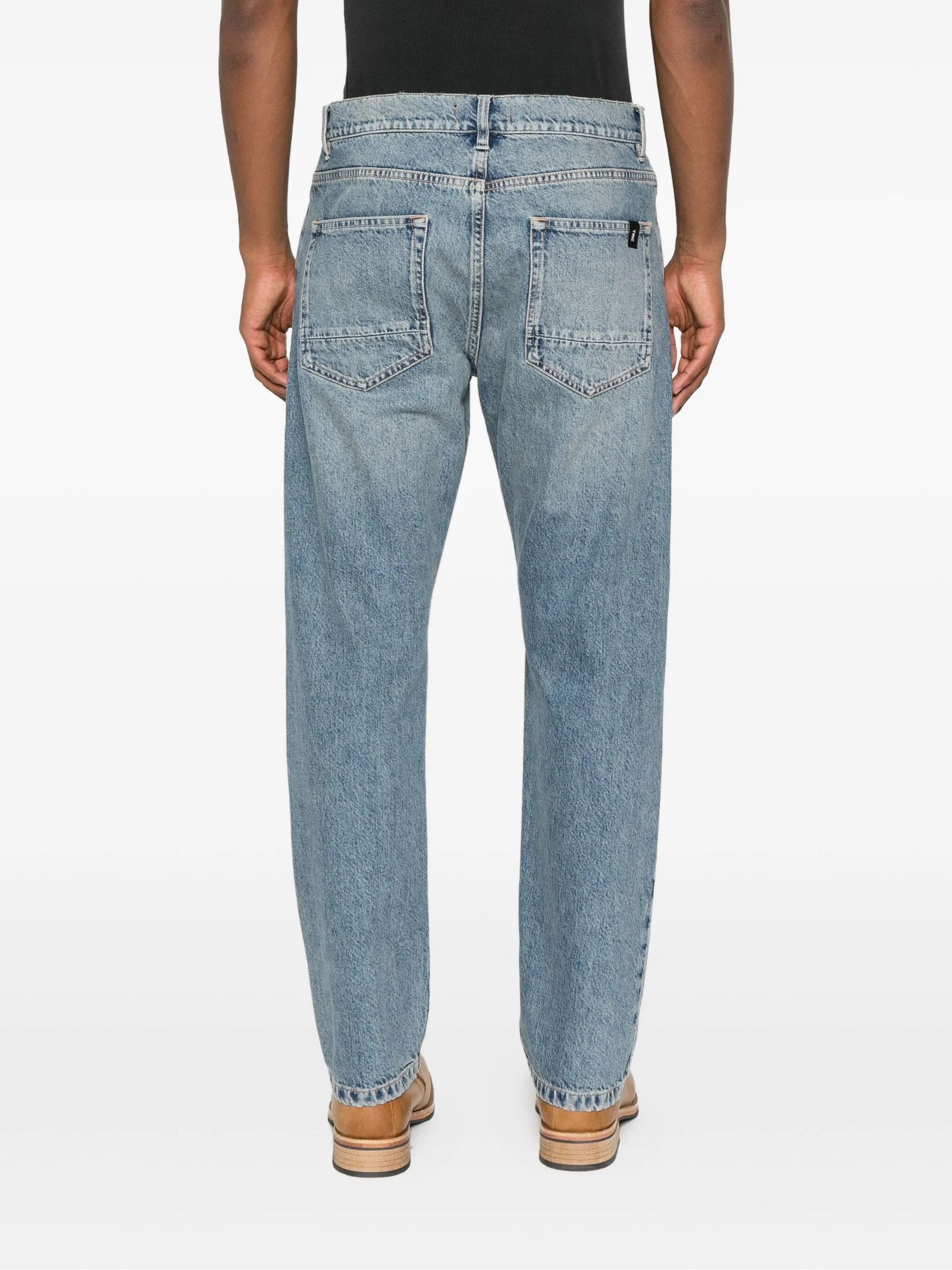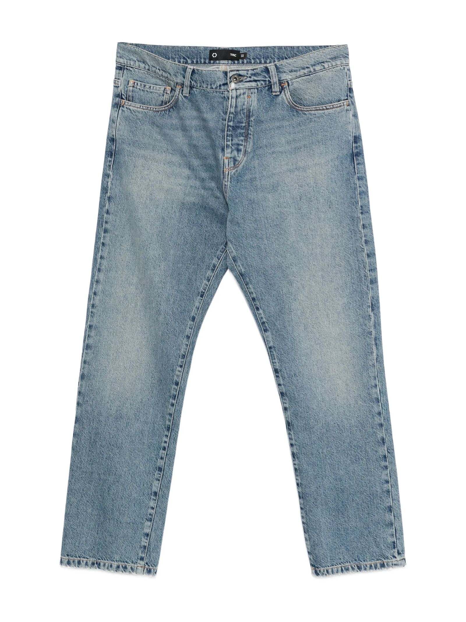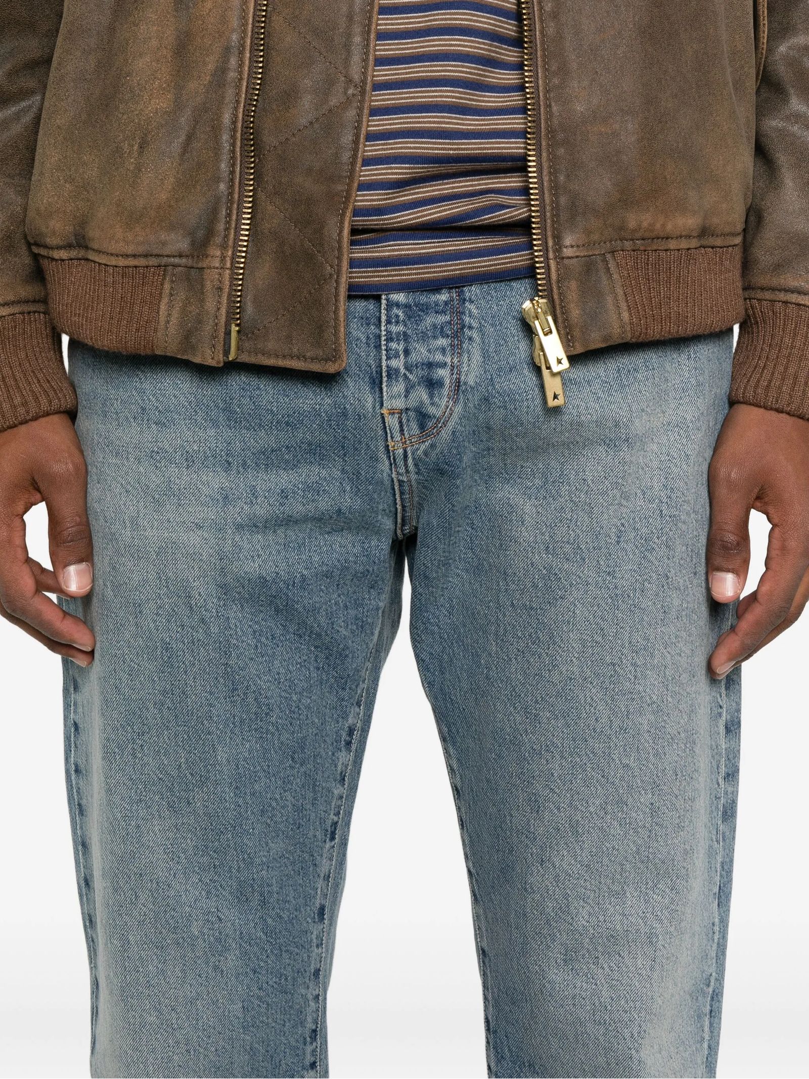 Jeans in denim di cotone blu chiaro, chiusura con bottoni, design a cinque tasche, passanti