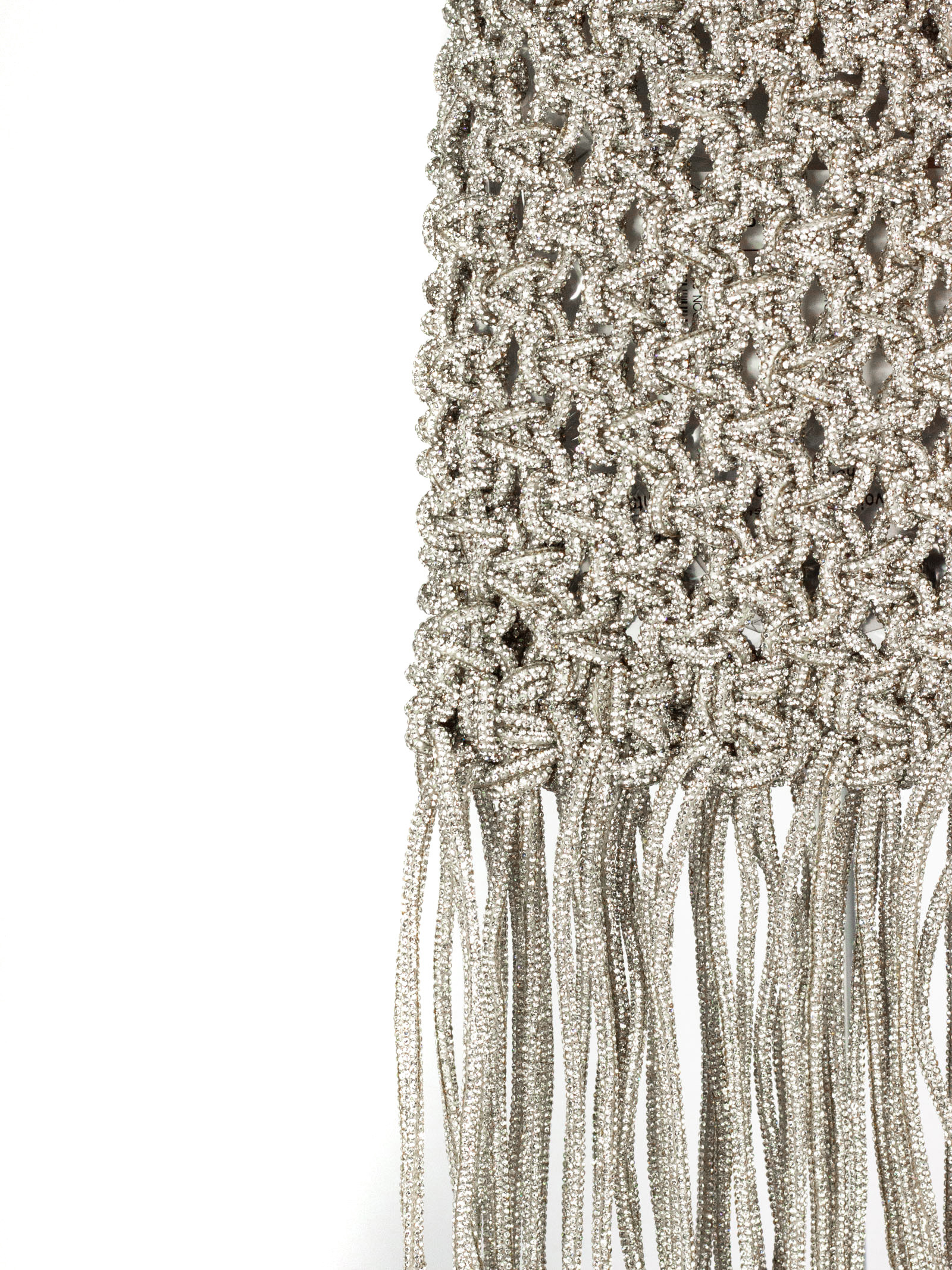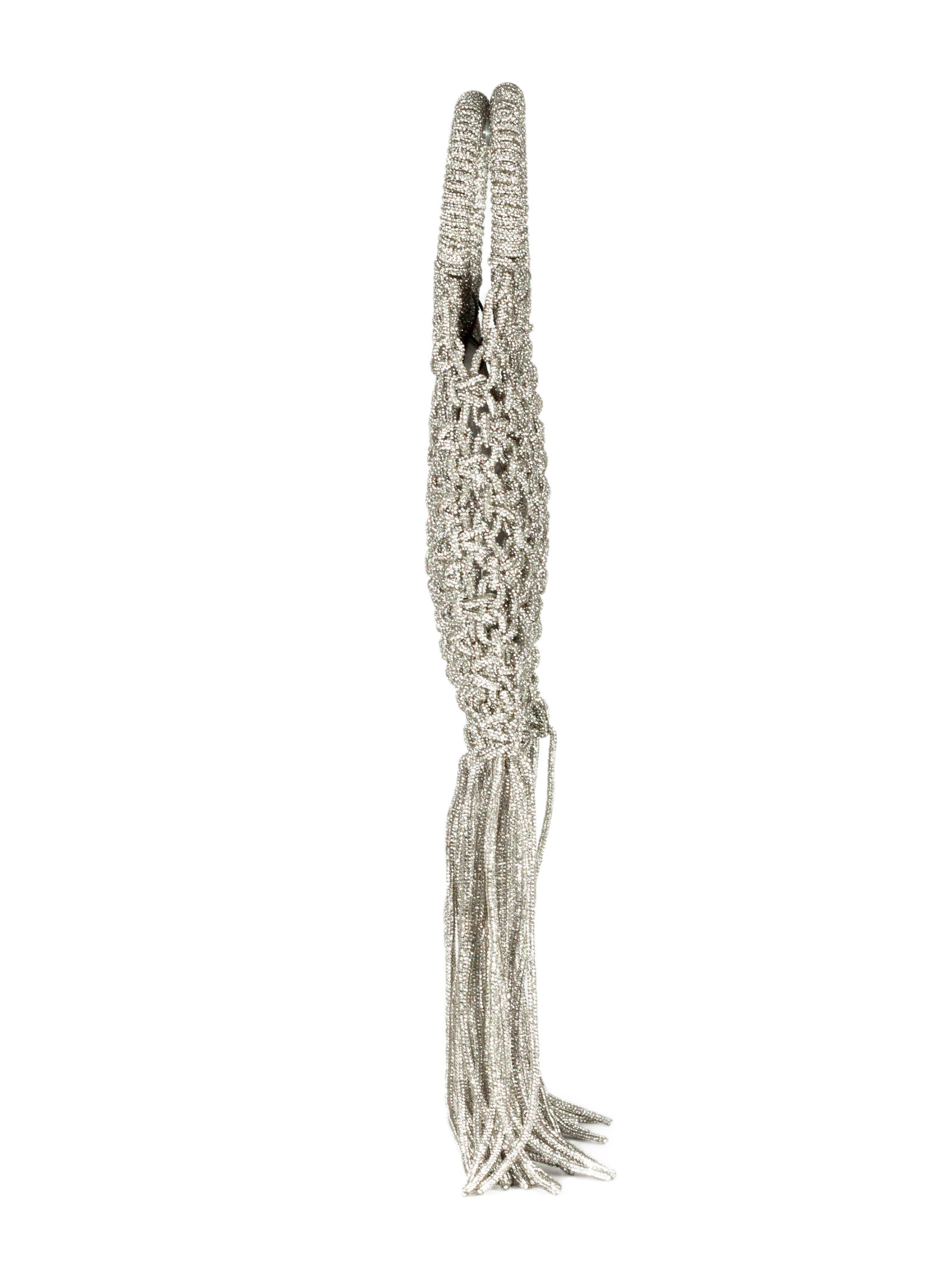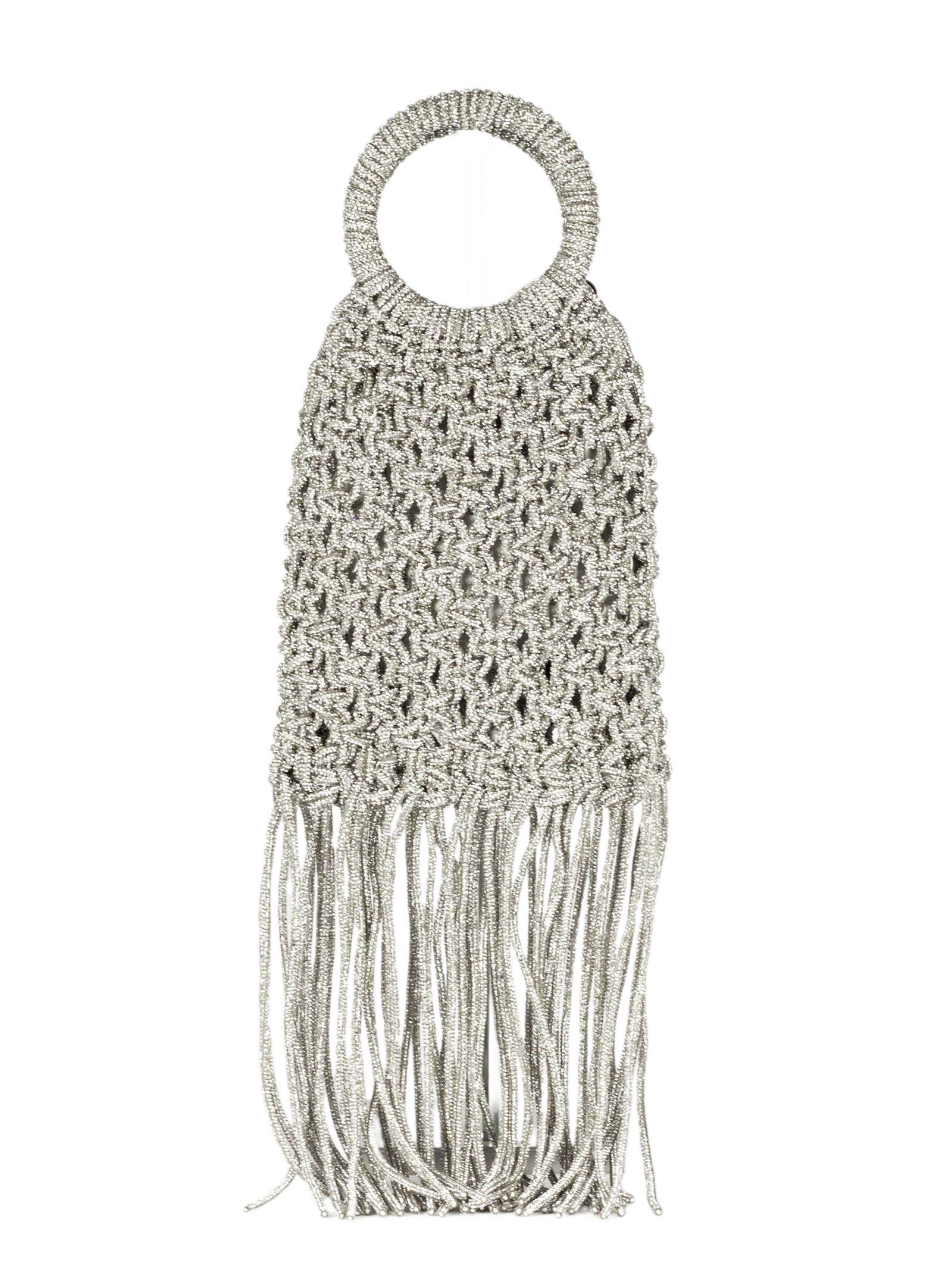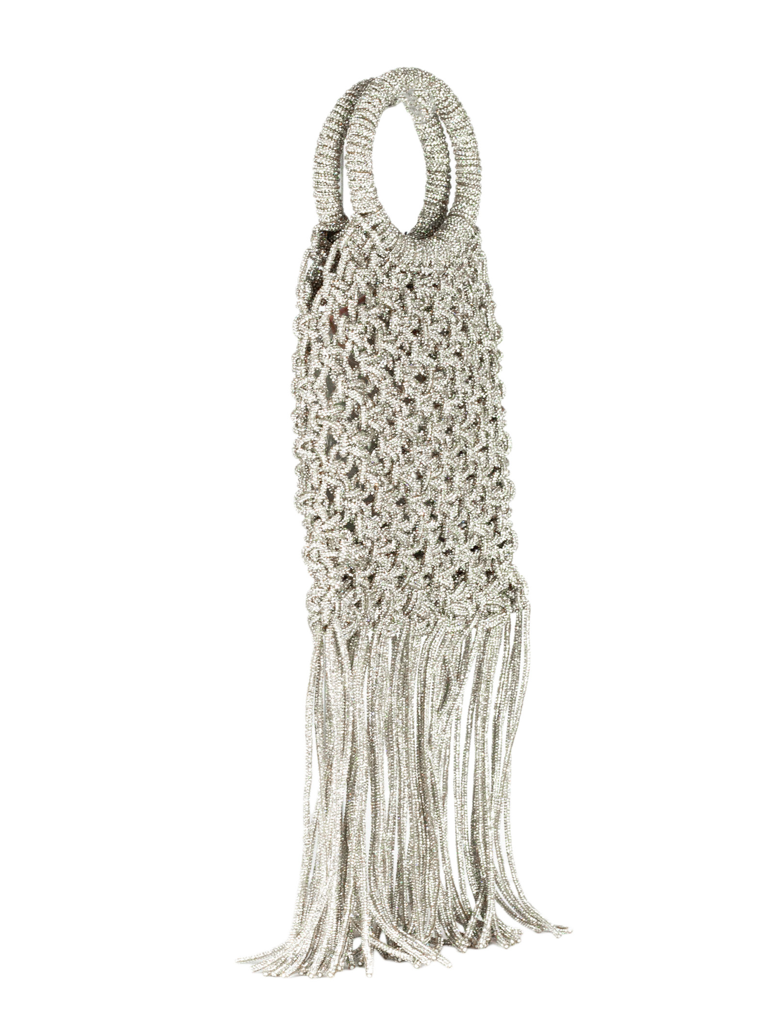 Borsa Maronti in maglia strass argento con dettaglio frange, doppio manico tondo, chiusura calamita, L22 x A30 x P4 cm