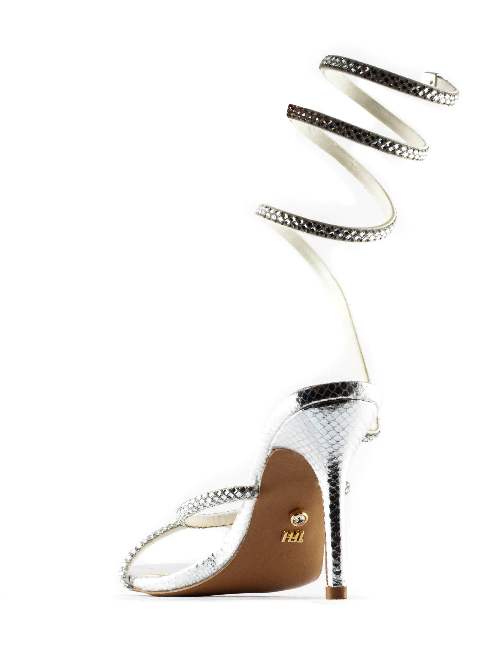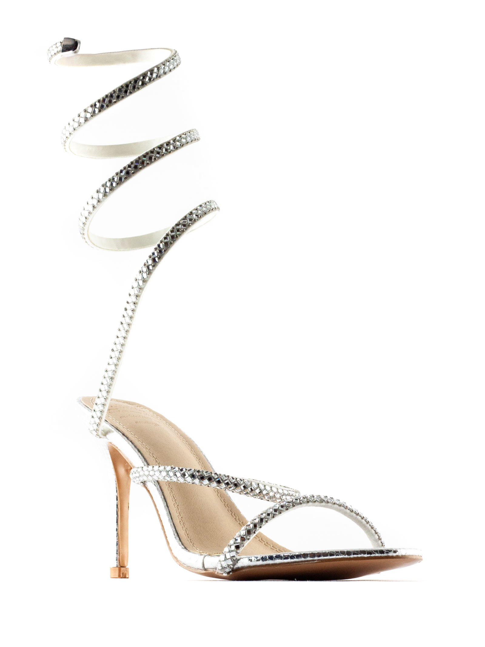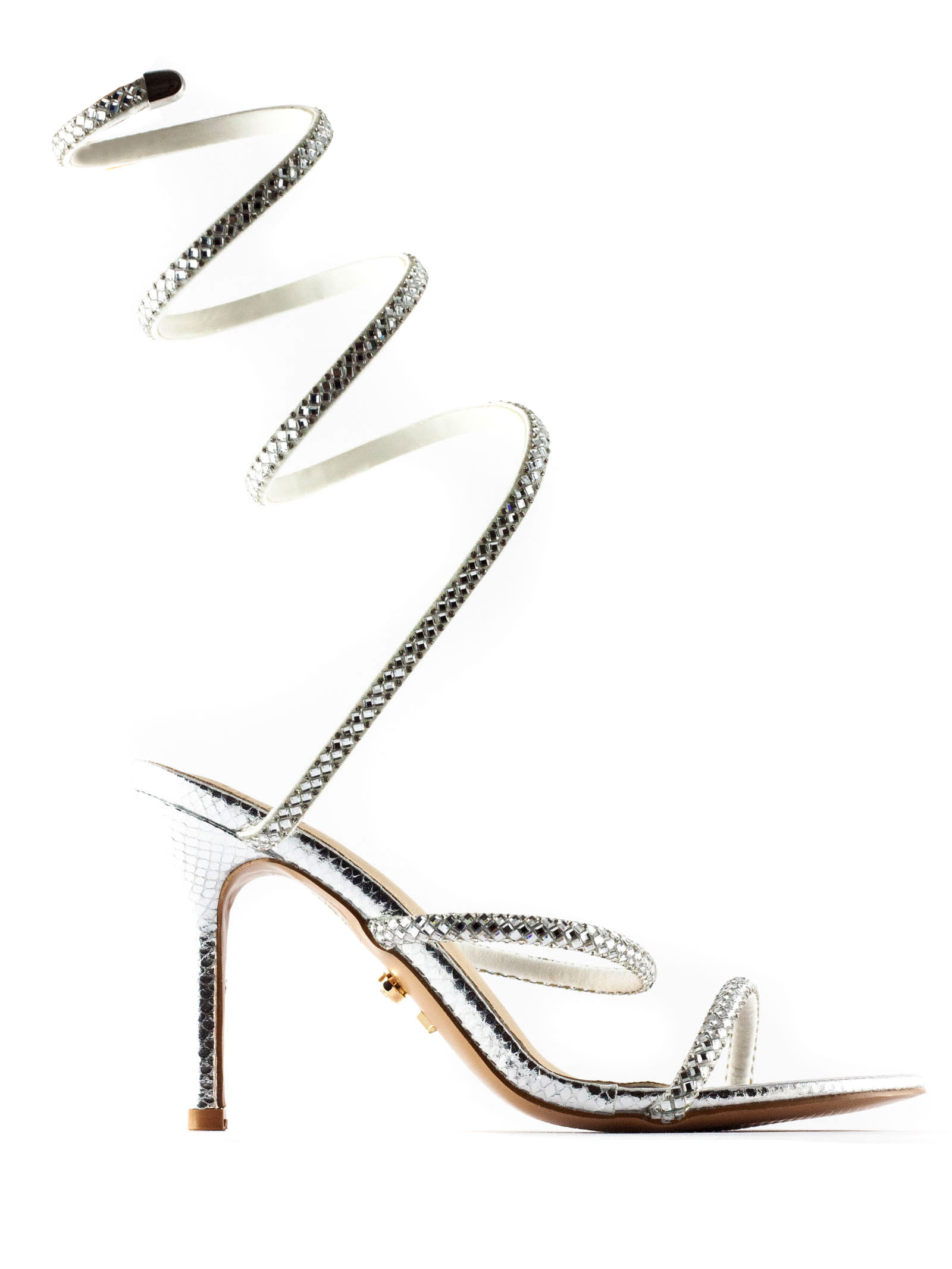 Sandalo Zeja argento, tacco alto a spillo, laccio a spirale avvolgente alla caviglia e alla gamba, punta aperta, altezza tacco 9cm