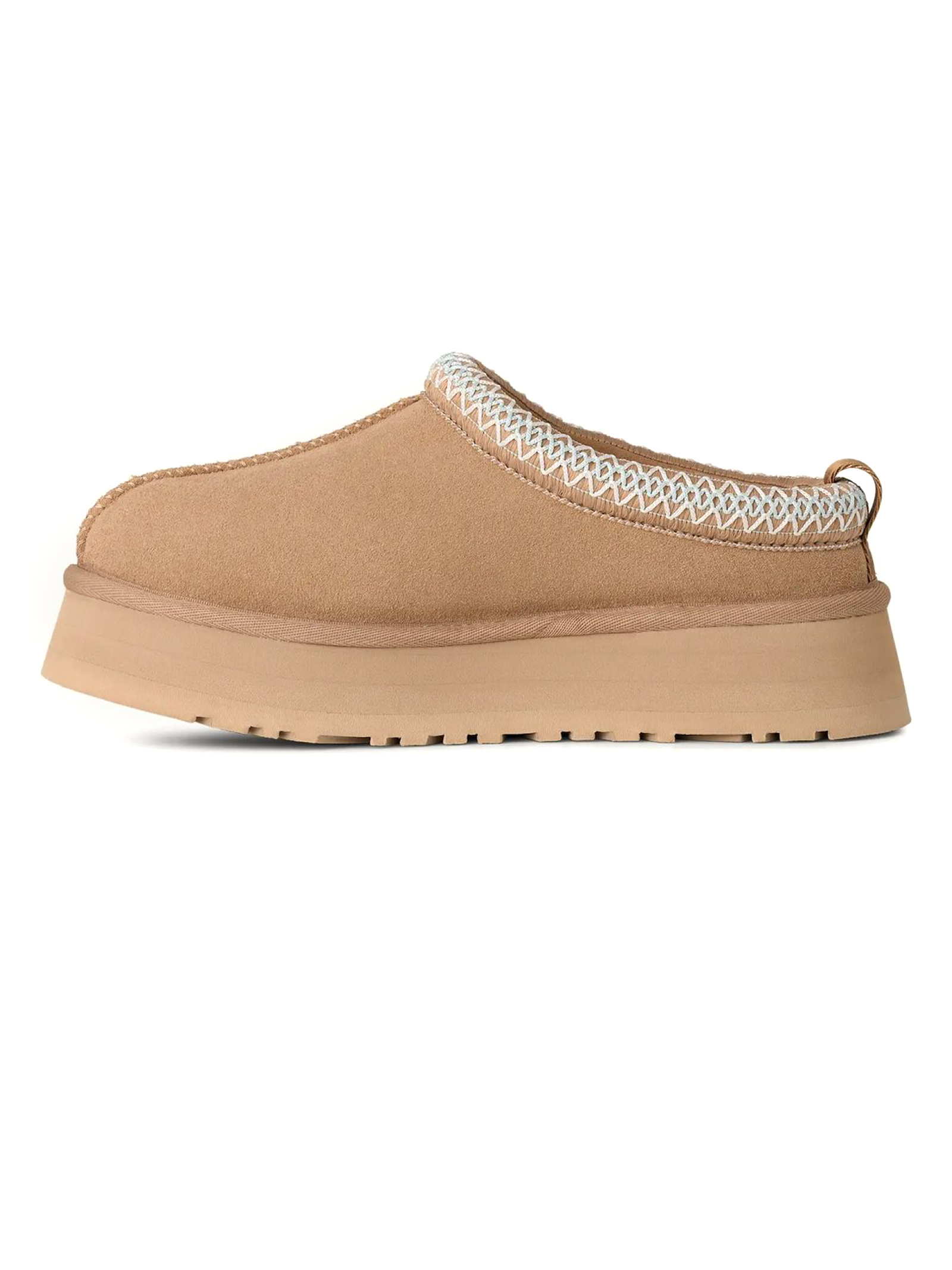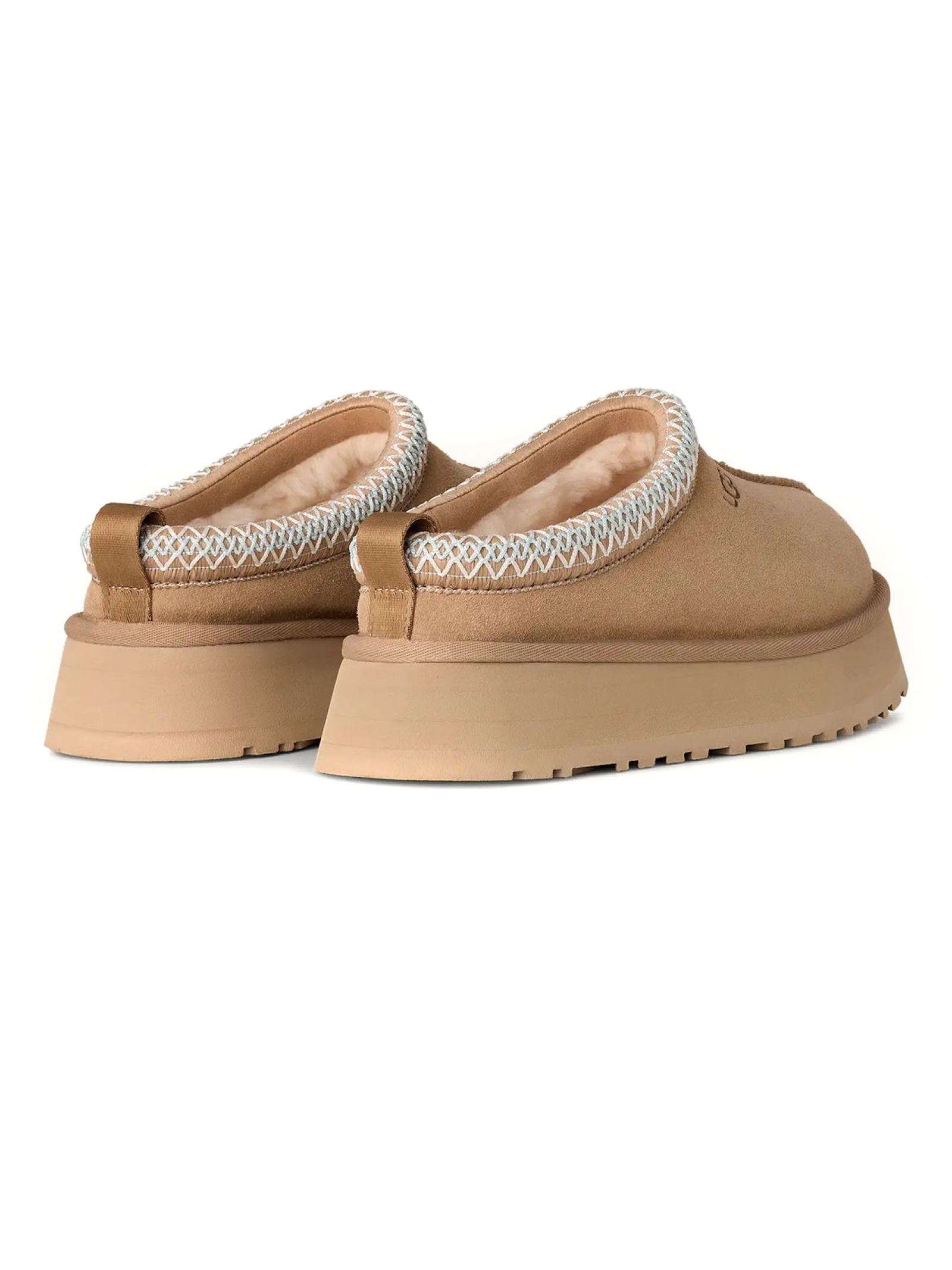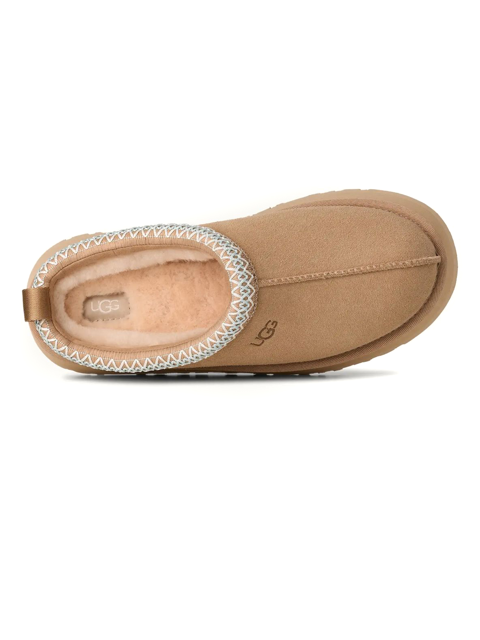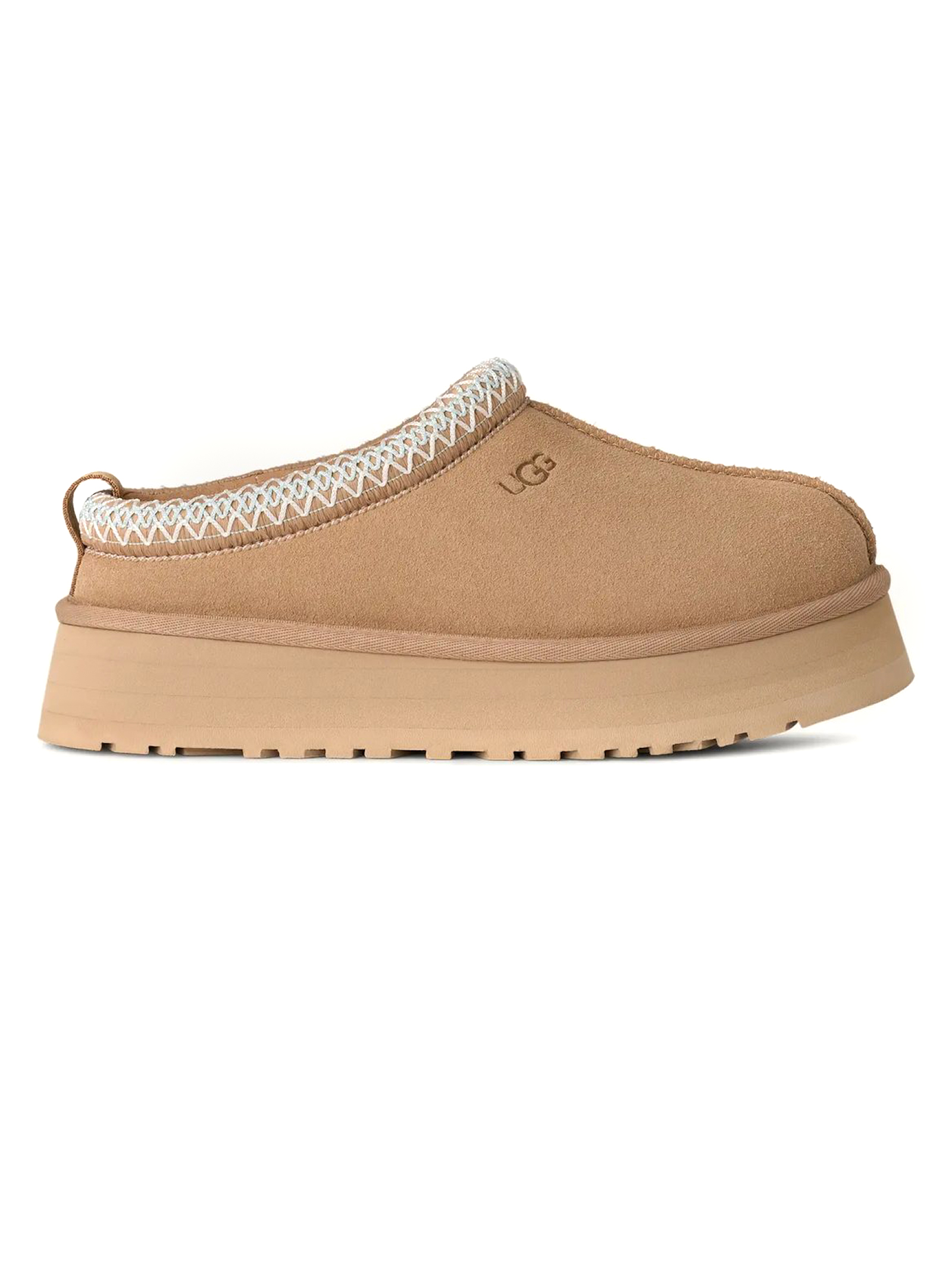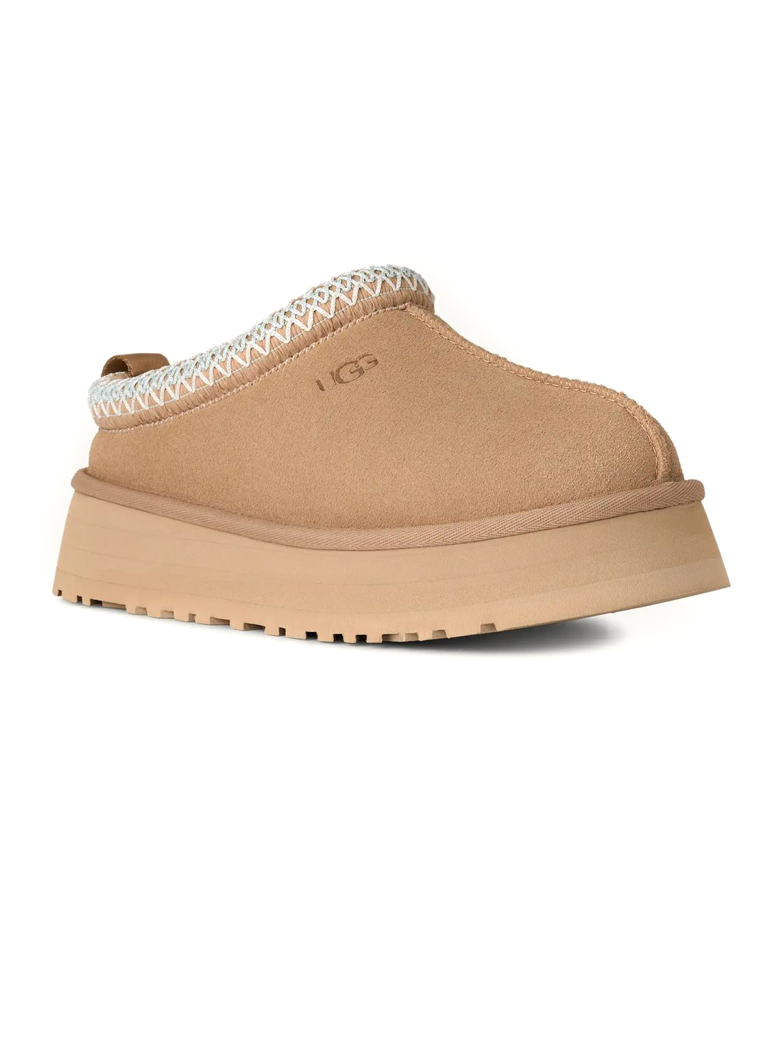 Slippers in camoscio sabbia, UGGbraid realizzato con fibre di poliestere riciclato (100%), tirante posteriore, Fodera in montone (10 mm), Soletta in montone (10 mm), Intersuola in EVA, Suola in EVA da canna da zucchero, Bordo in tessuto, realizzato con il 100% di fibre di poliestere riciclato, Altezza del plateau: 4,4 cm, Logo UGG® stampato a caldo in rilievo, etichetta in tessuto con logo UGG® sulla soletta
