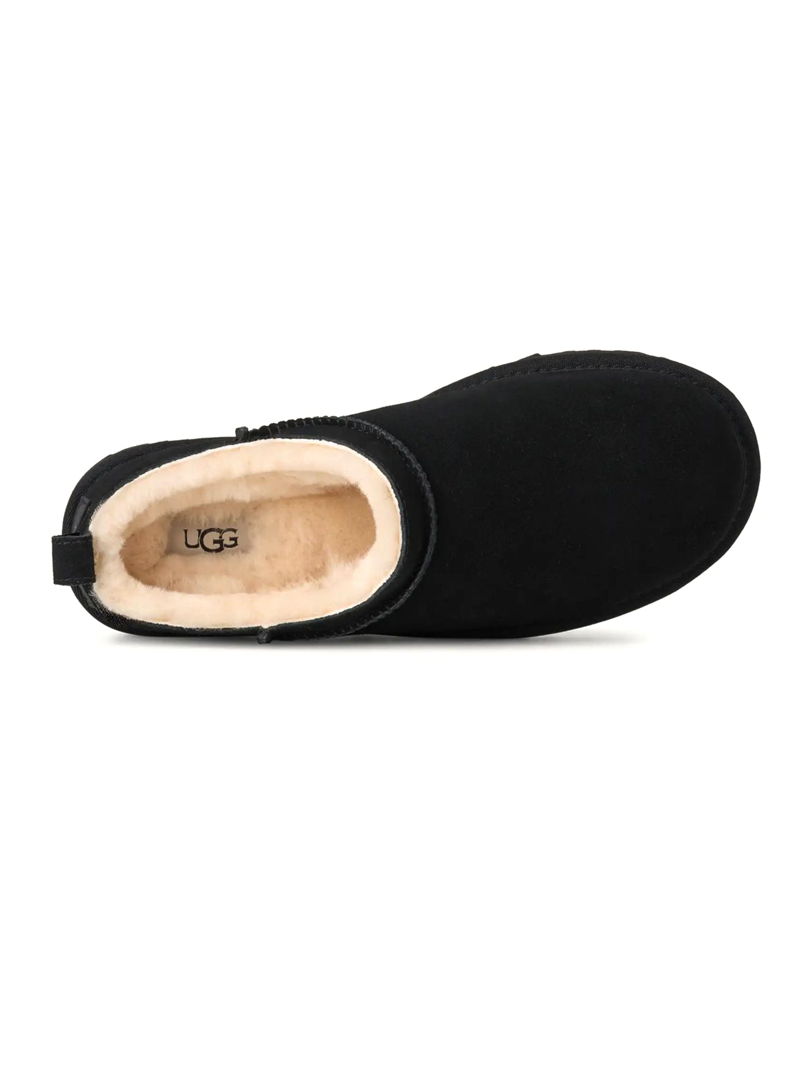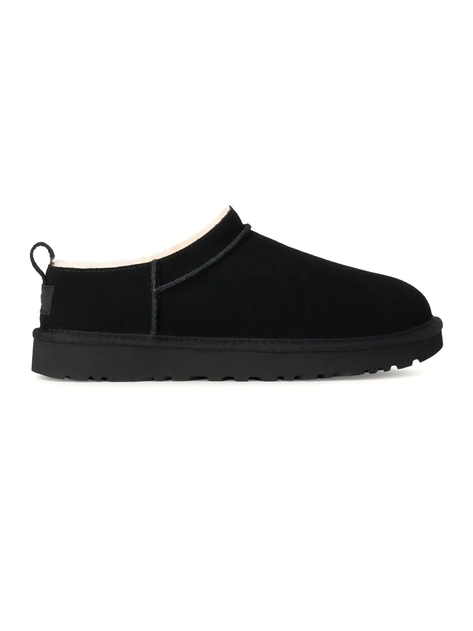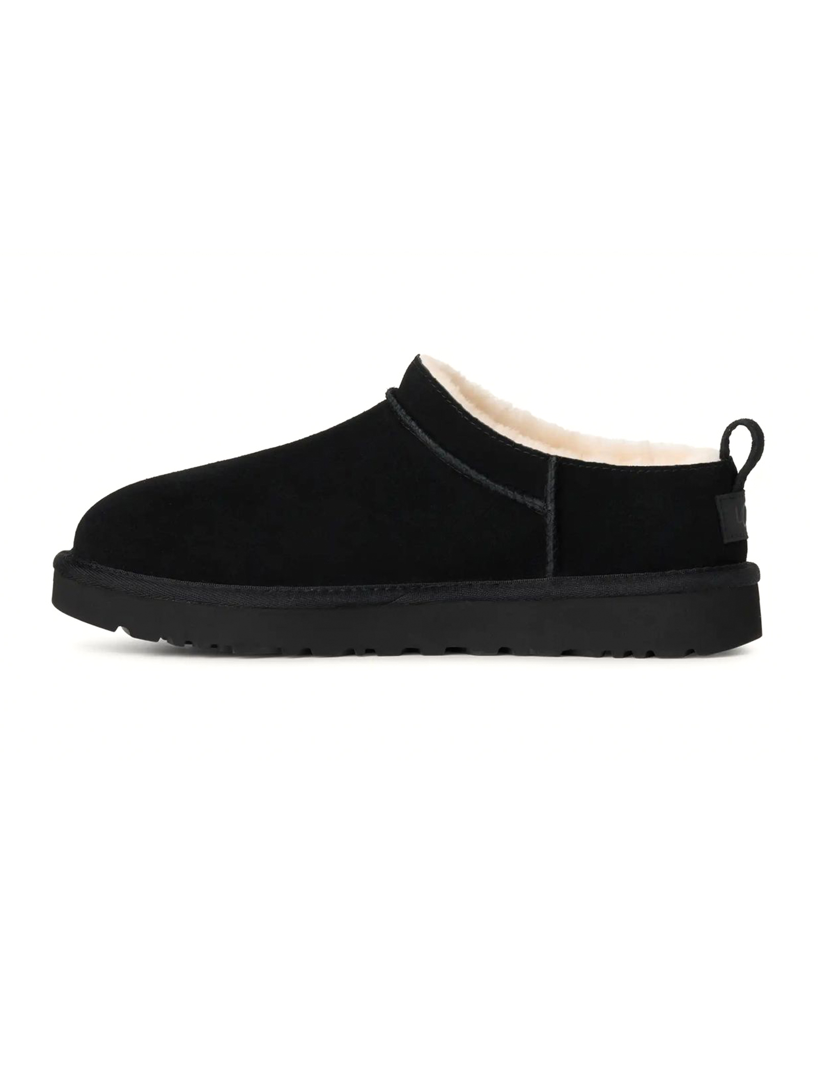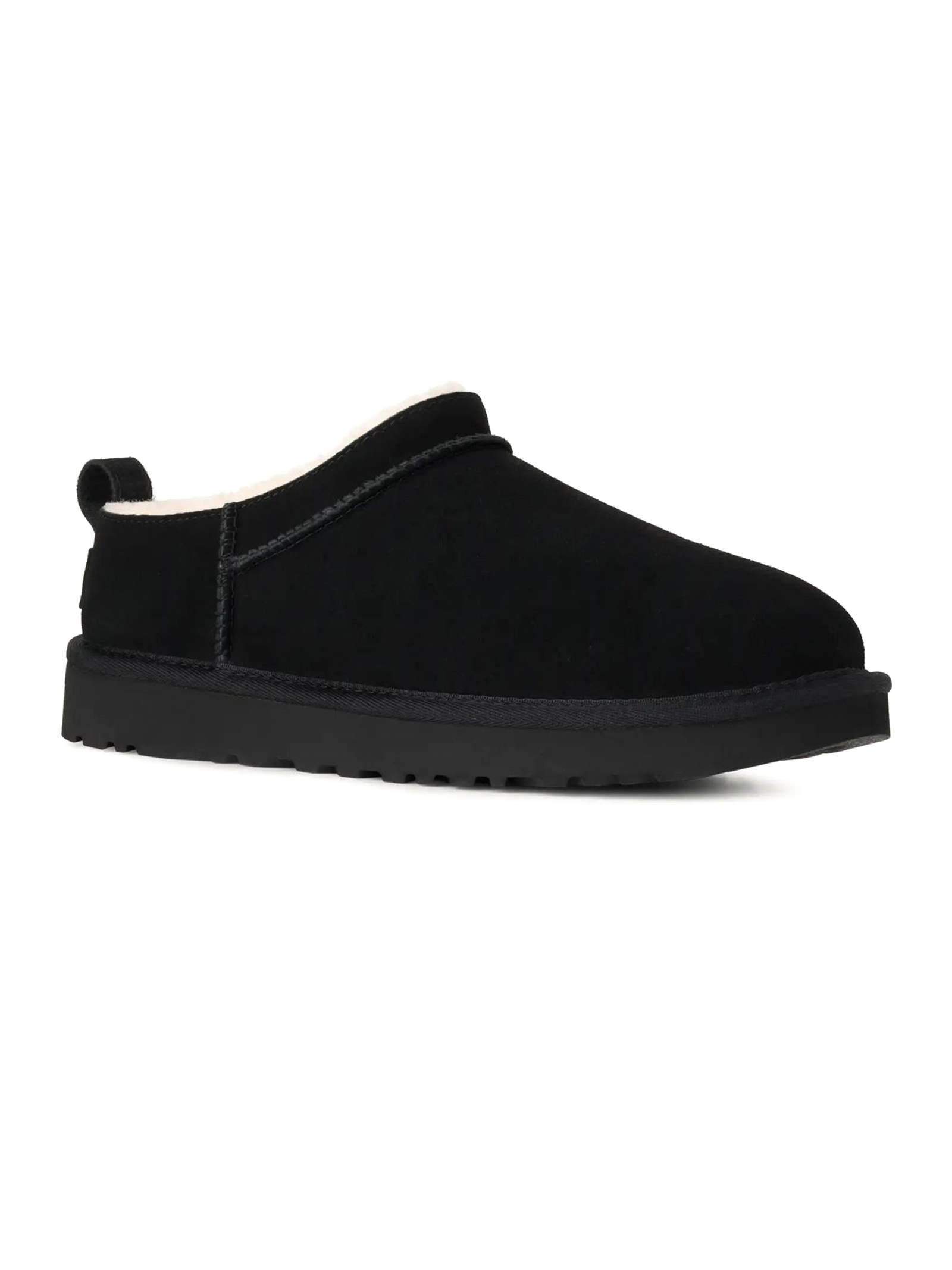 Stivali Classic Micro Nero, Tomaia in camoscio o camoscio con applicazione topica del trattamento idrorepellente o camoscio resistente allacqua, Tirante posteriore, Fodera del gambale in montone (10 mm), fodera della mascherina in montone (17 mm), Soletta in montone (17 mm), Suola in EVA da canna da zucchero, Bordo in tessuto realizzato con fibre di poliestere riciclato (100%), Etichetta in tessuto con logo UGG® sulla soletta, etichetta in pelle con logo UGG® in rilievo sul tallone