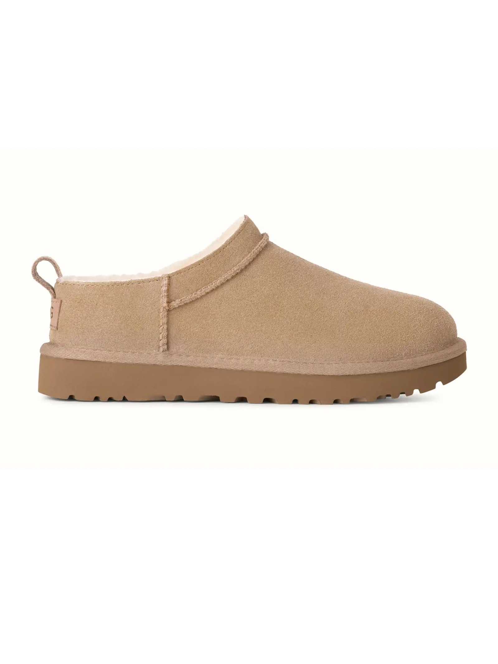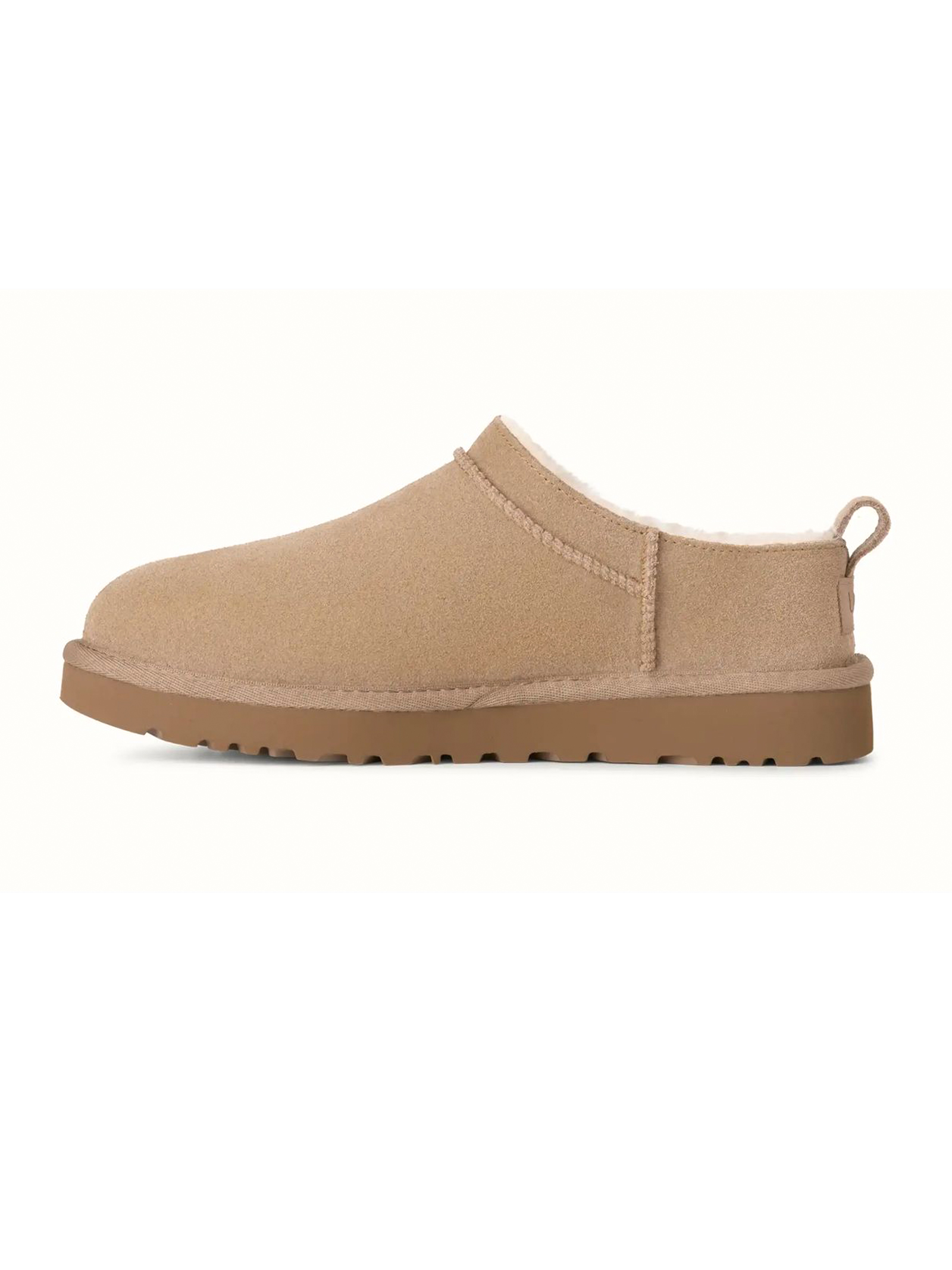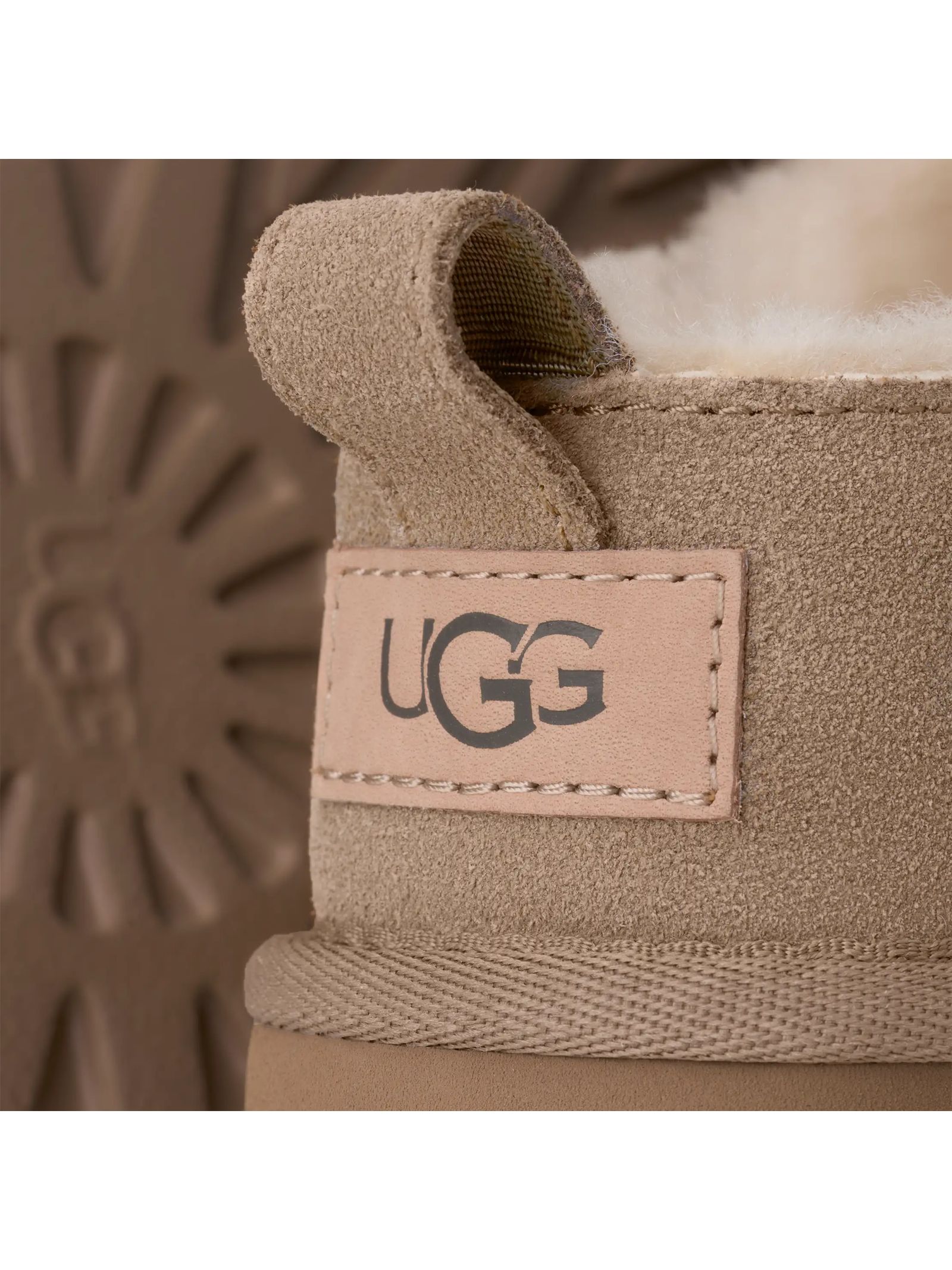 Stivali Classic Micro Sand, Tomaia in camoscio o camoscio con applicazione topica del trattamento idrorepellente o camoscio resistente allacqua, Tirante posteriore, Fodera del gambale in montone (10 mm), fodera della mascherina in montone (17 mm), Soletta in montone (17 mm), Suola in EVA da canna da zucchero, Bordo in tessuto realizzato con fibre di poliestere riciclato (100%), Etichetta in tessuto con logo UGG® sulla soletta, etichetta in pelle con logo UGG® in rilievo sul tallone