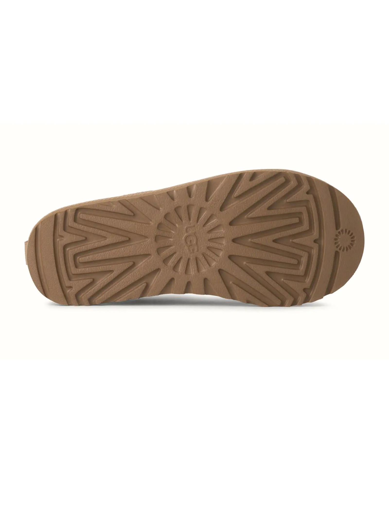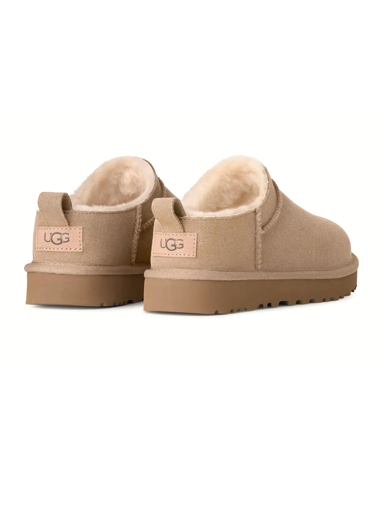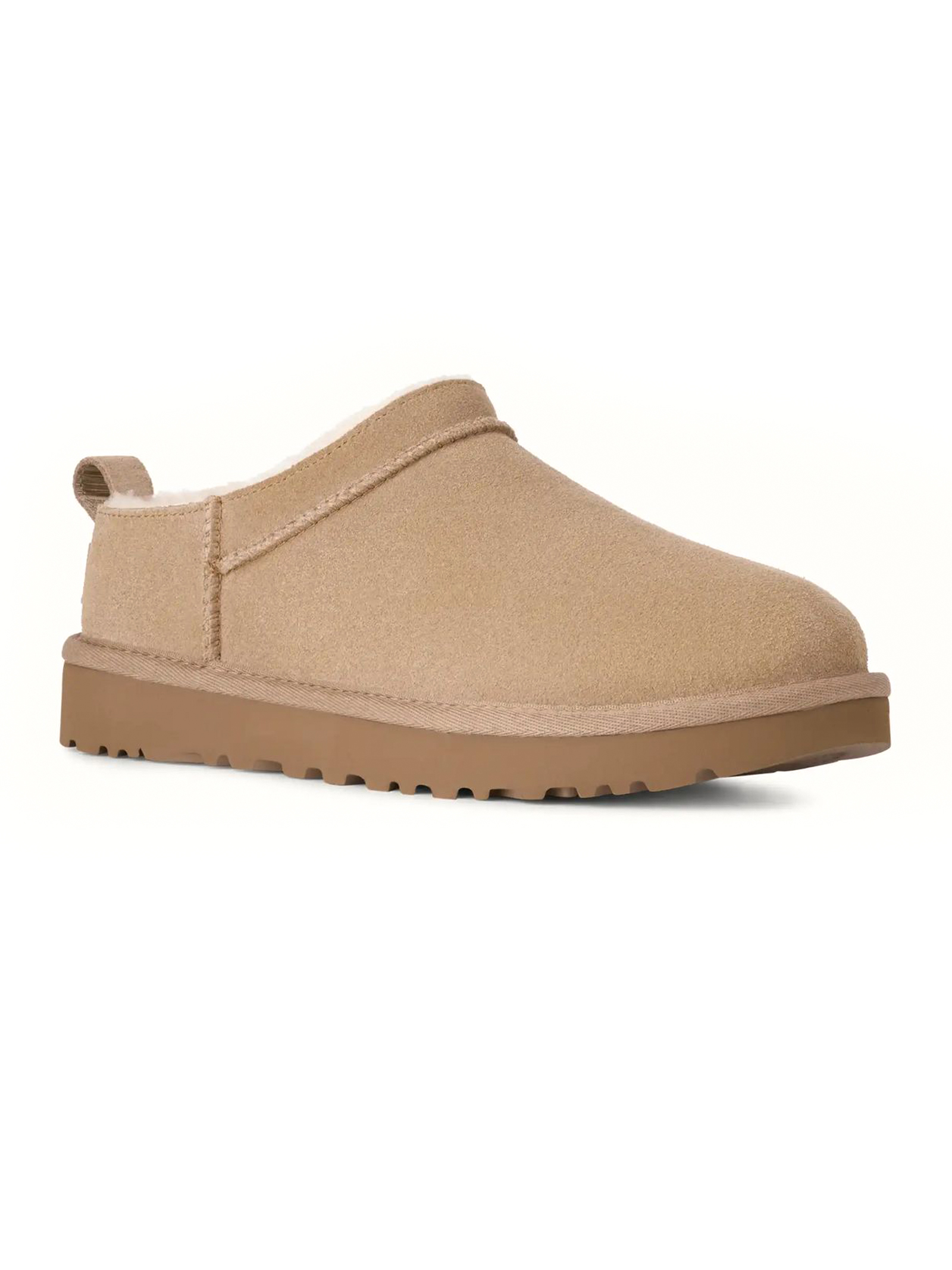 Stivali Classic Micro Sand, Tomaia in camoscio o camoscio con applicazione topica del trattamento idrorepellente o camoscio resistente allacqua, Tirante posteriore, Fodera del gambale in montone (10 mm), fodera della mascherina in montone (17 mm), Soletta in montone (17 mm), Suola in EVA da canna da zucchero, Bordo in tessuto realizzato con fibre di poliestere riciclato (100%), Etichetta in tessuto con logo UGG® sulla soletta, etichetta in pelle con logo UGG® in rilievo sul tallone