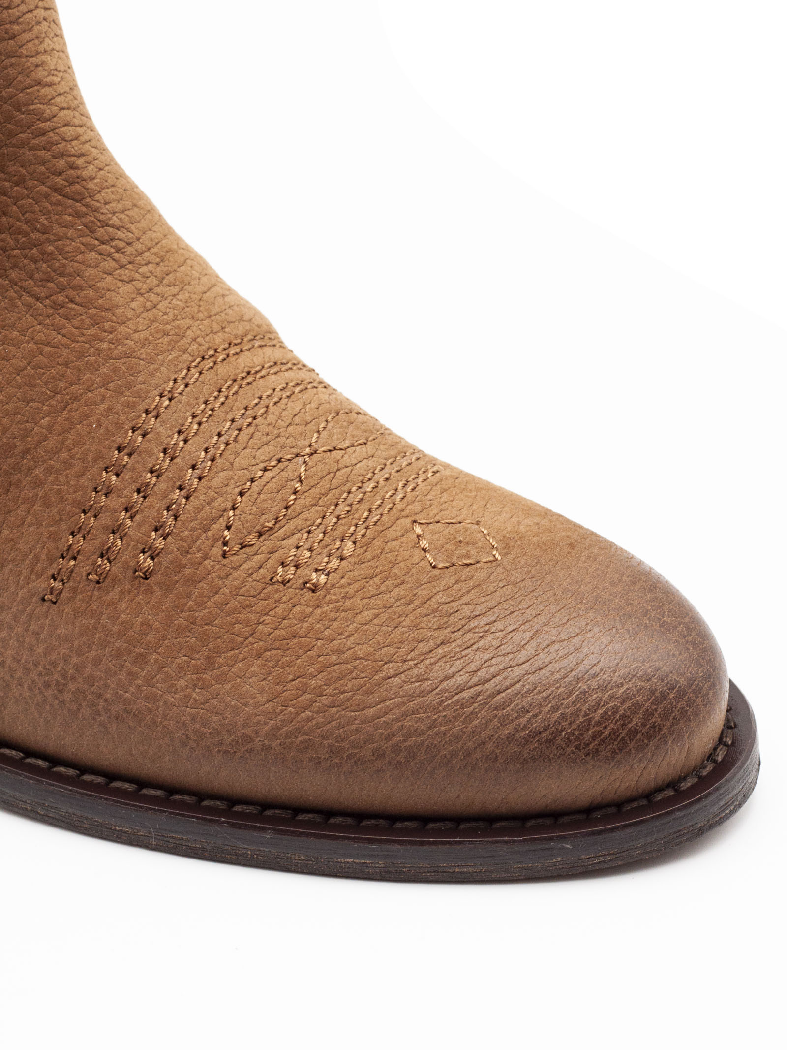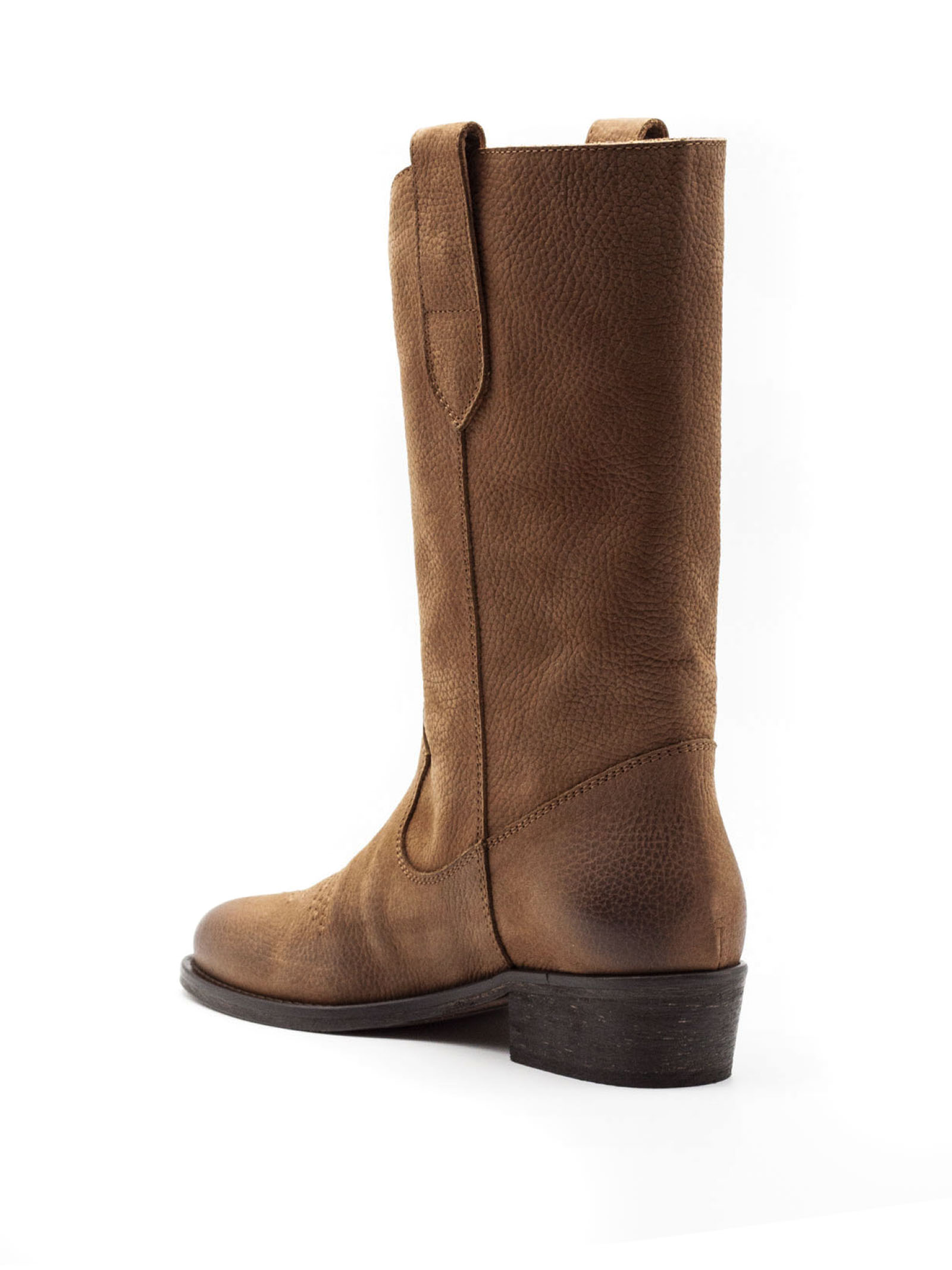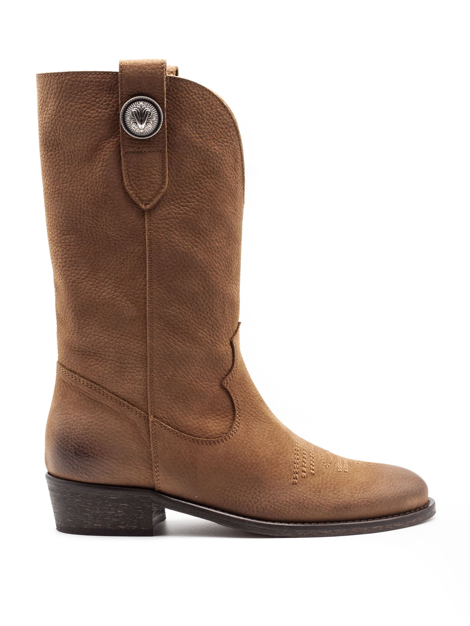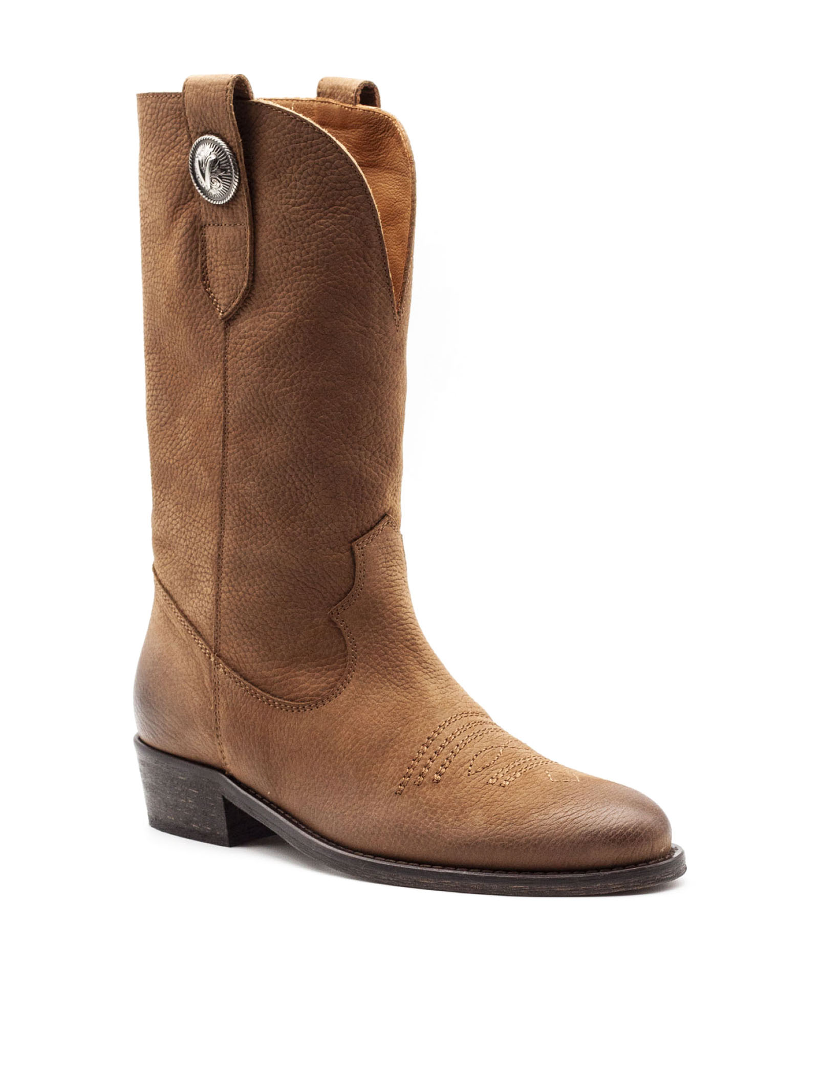 Stivale midi in pelle martellata marrone con sfumature effetto vintage, punta leggermente arrotondata con impunture decorative stile western, gambale con cuciture sagomate, cinturino con bottone metallico decorativo, tacco medio in legno, suola in cuoio, calzata pull on, altezza tacco 3 cm