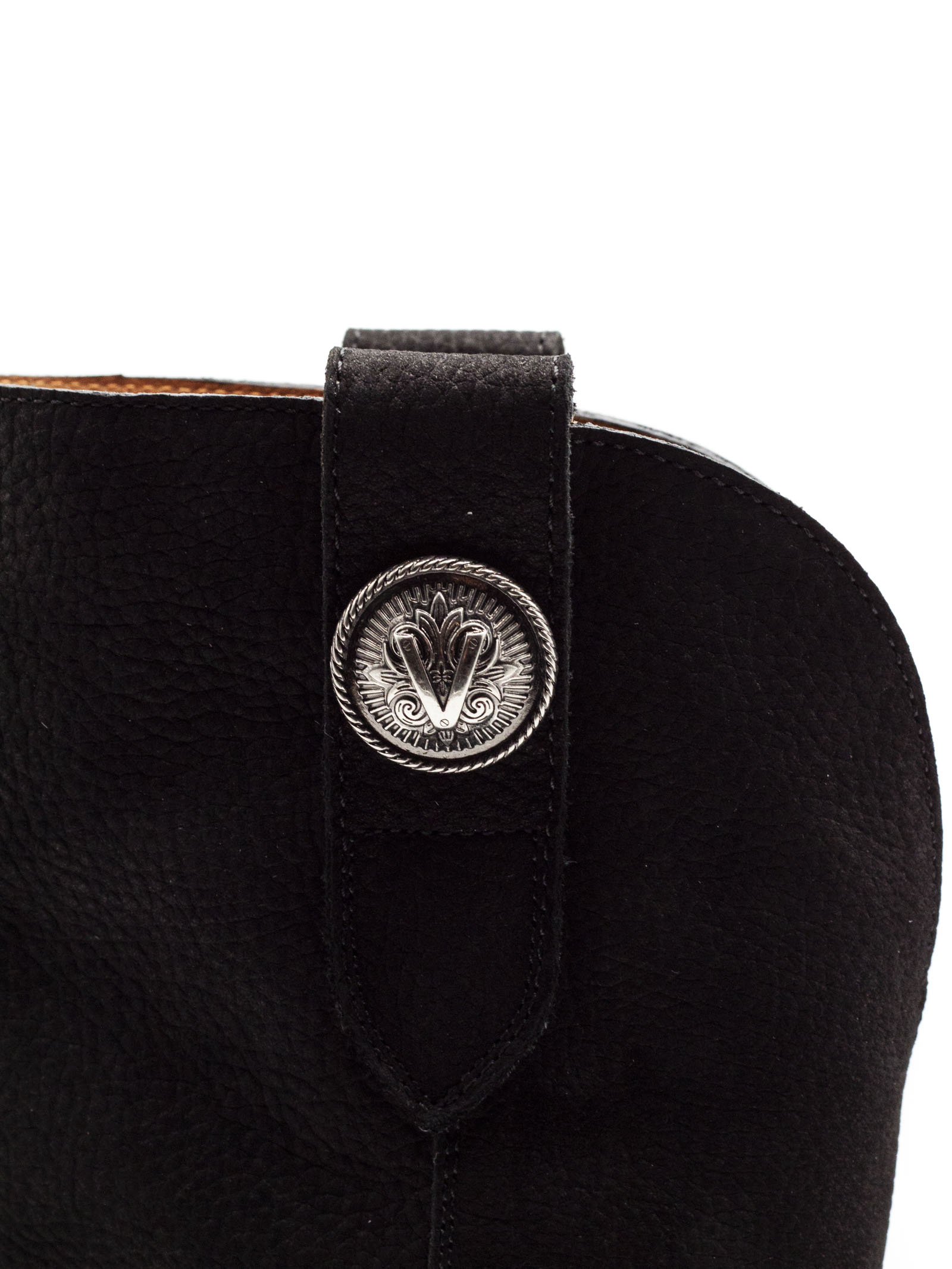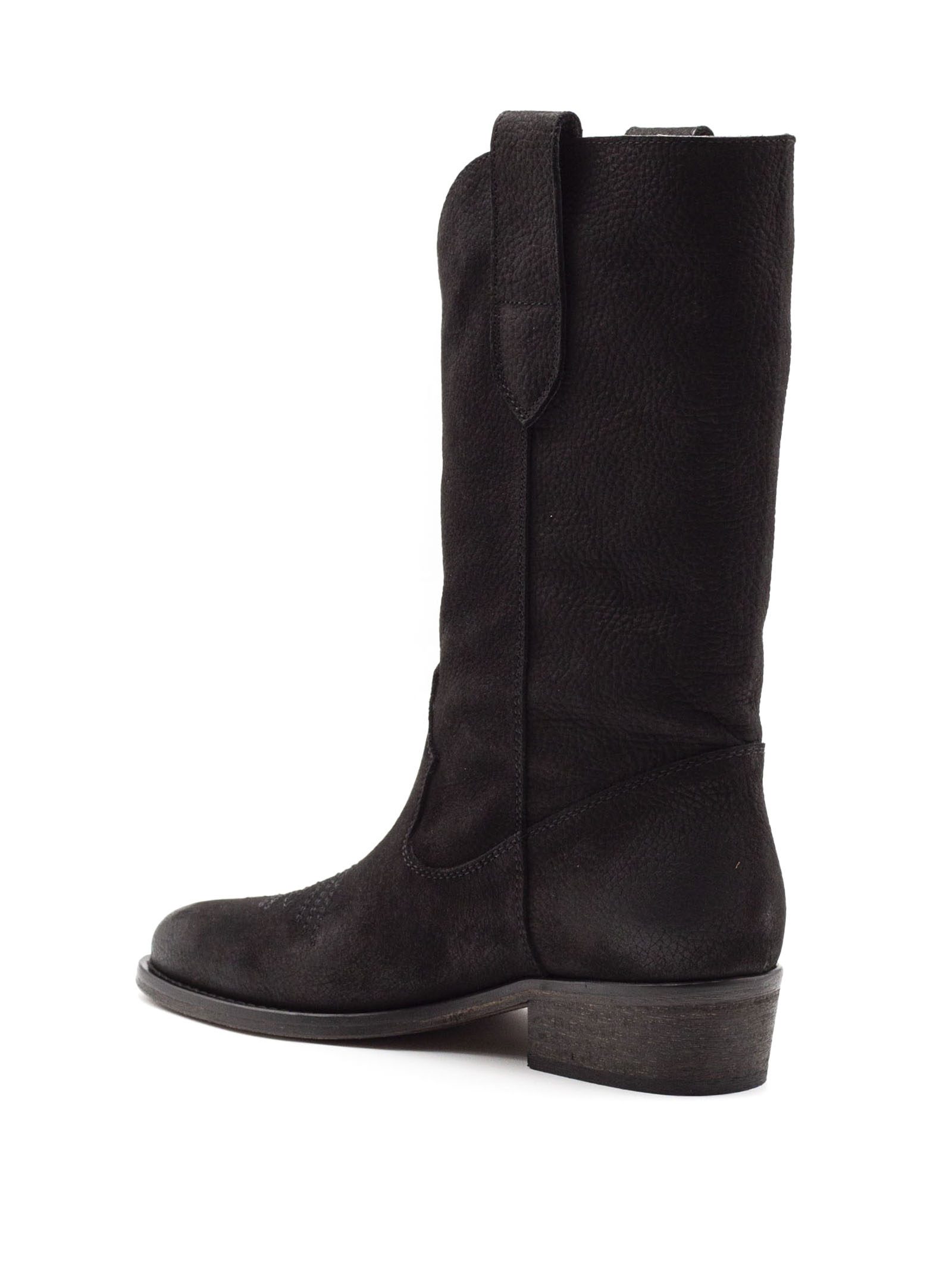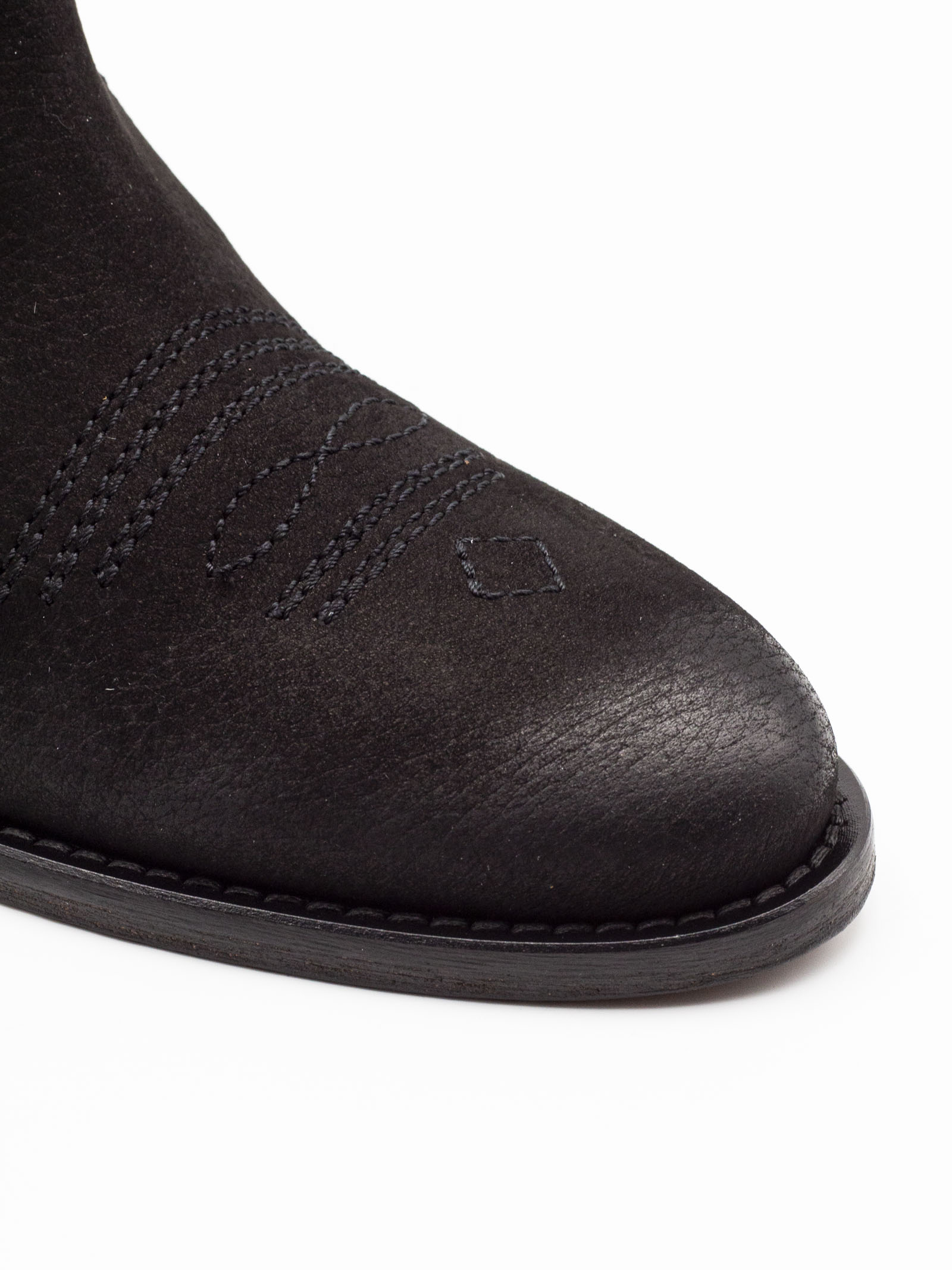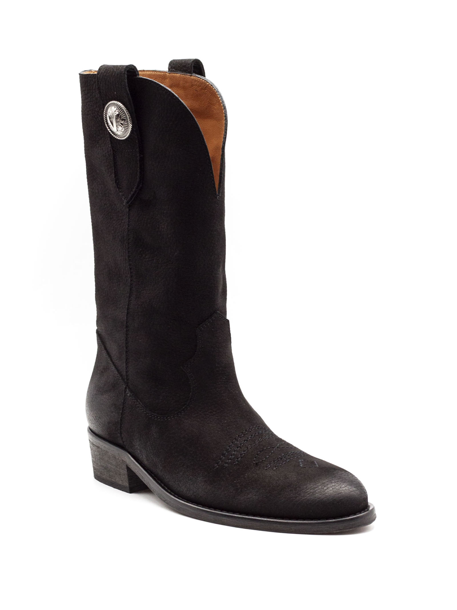 Stivale texano in nubuck nera, effetto vissuto, gambale al polpaccio con tirante laterale e bottone metallico decorativo, punta arrotondata con cuciture tono su tono, tacco basso inclinato effetto legno, suola in gomma, infilatura senza zip, altezza tacco 3 cm