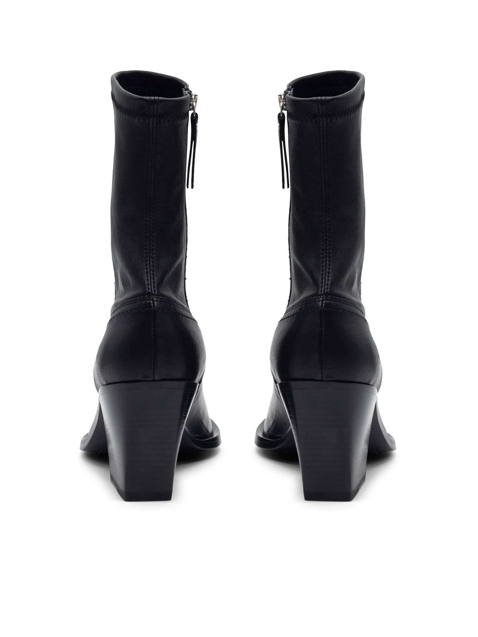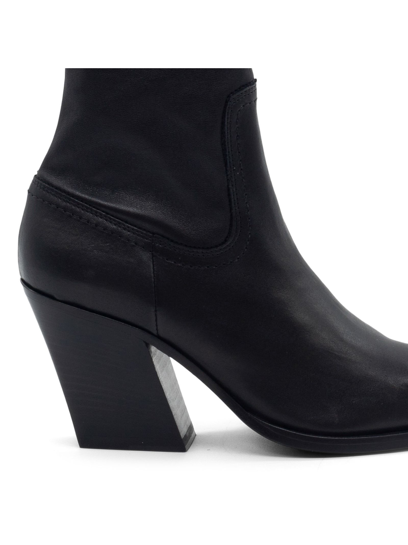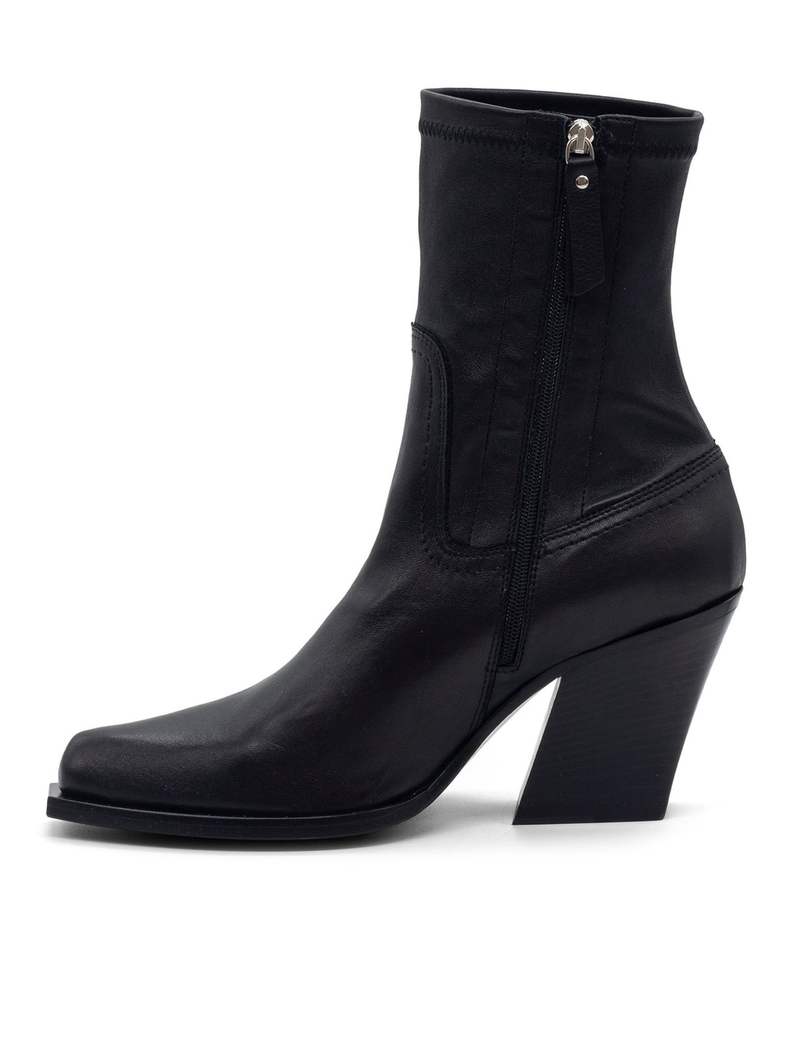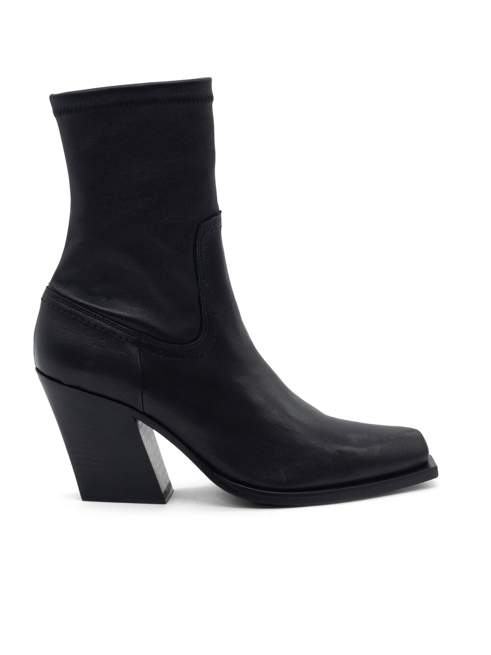 H10 Jolene-Tronchetto stretch nero realizzato in morbida nappa stretch, slanciato ed aderente, suola e tacco in cuoio spazzolato con isola di gomma antiscivolo, altezza tacco 88 mm