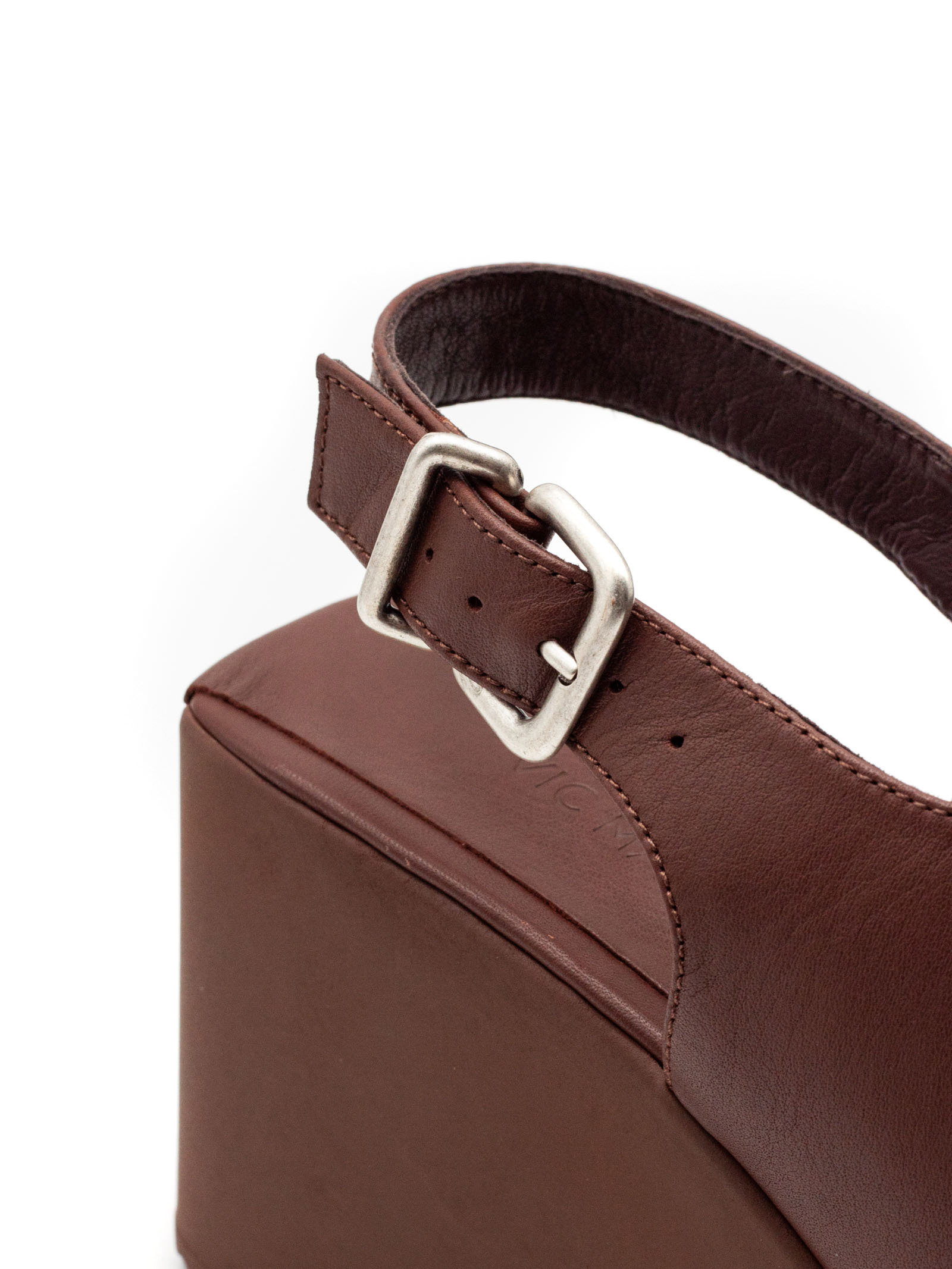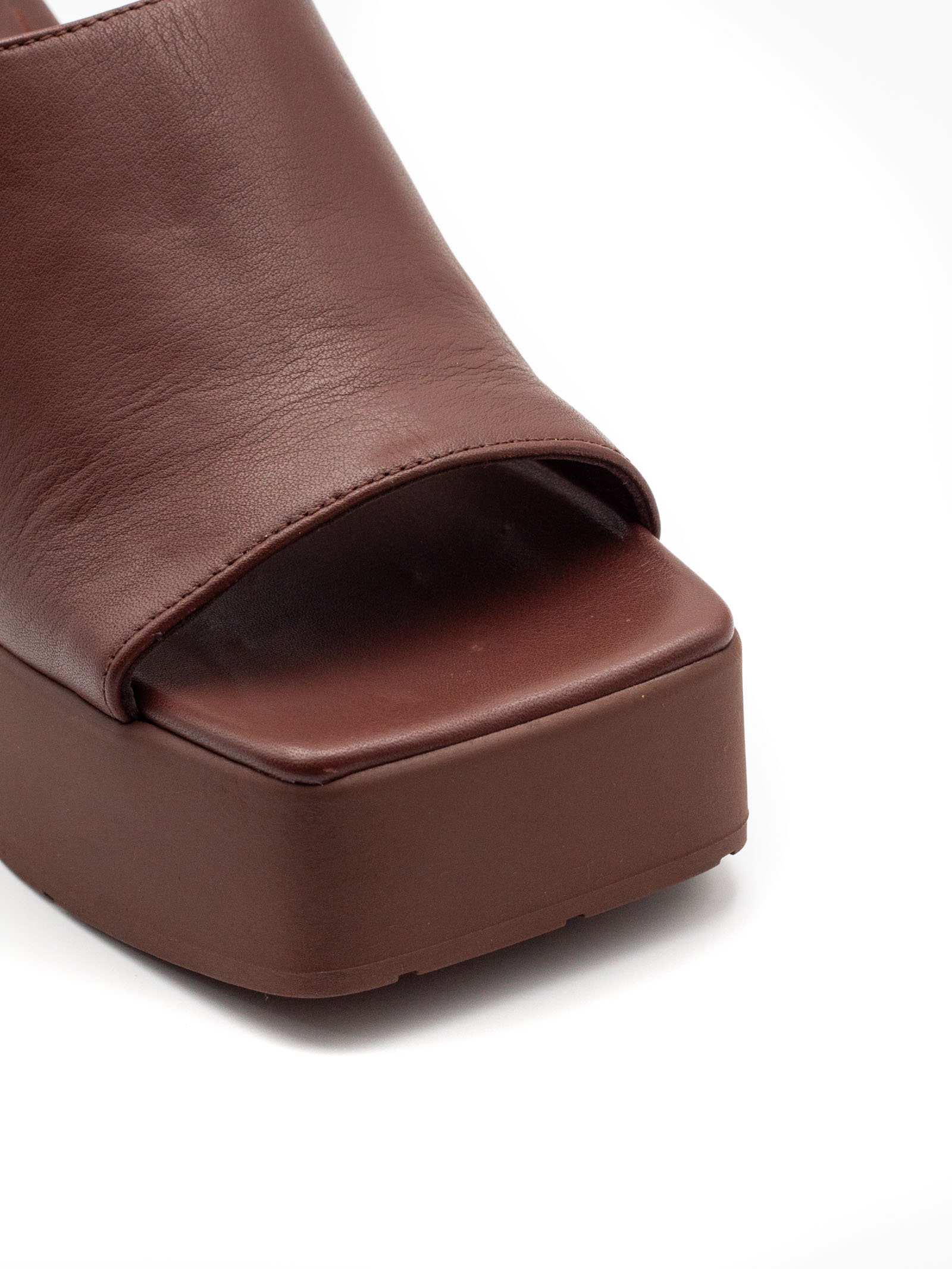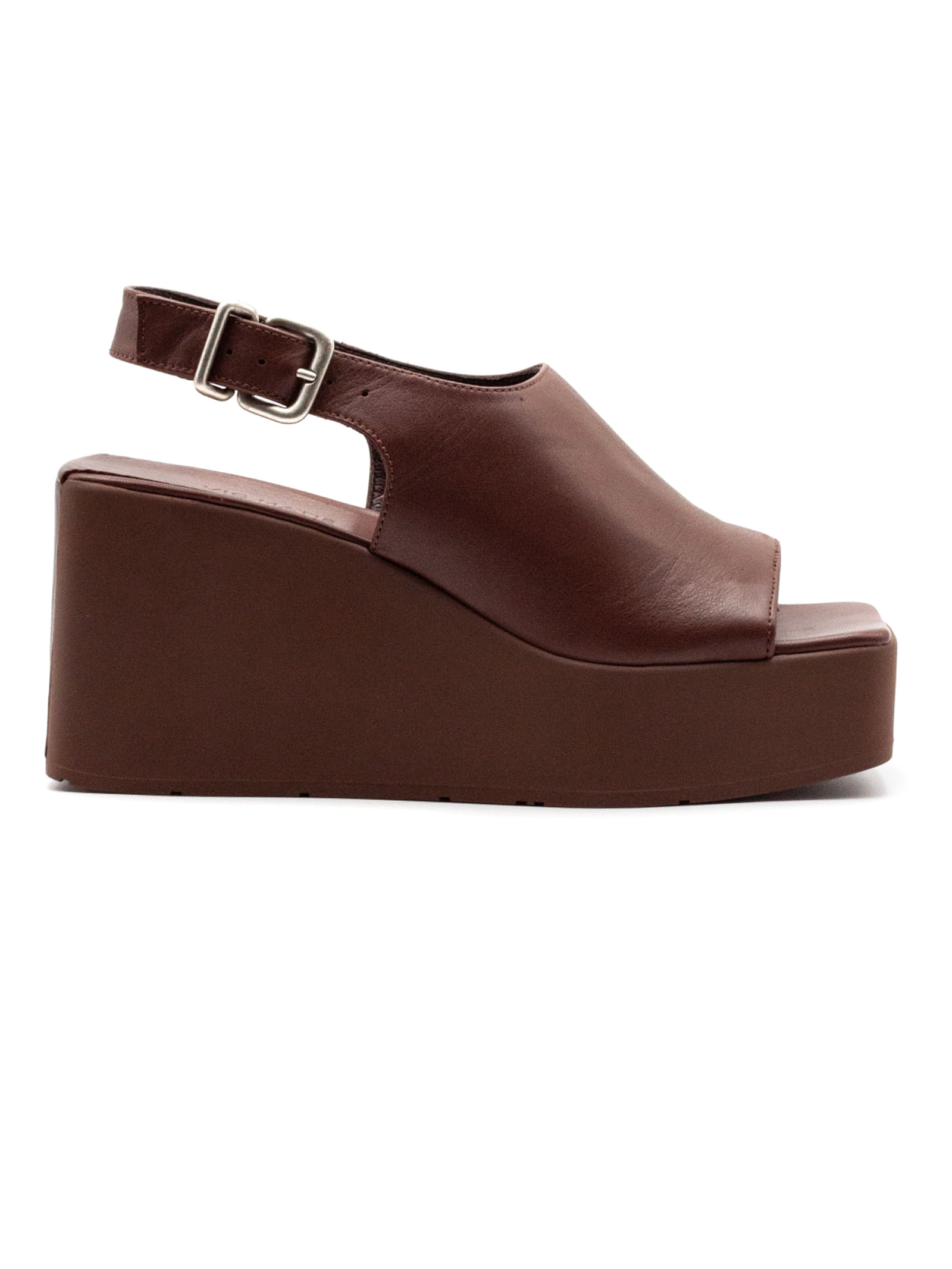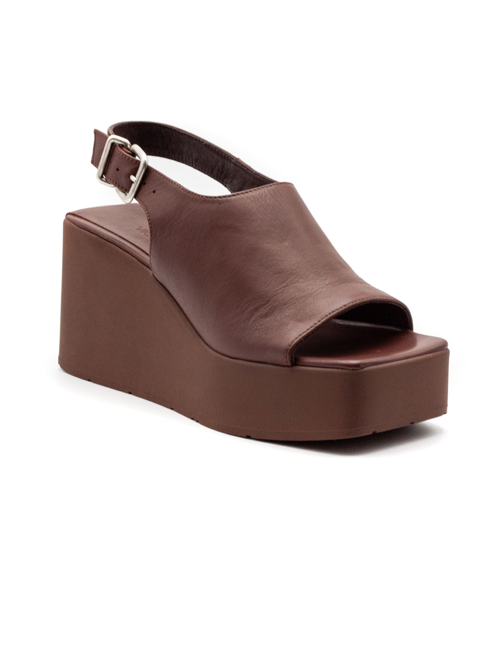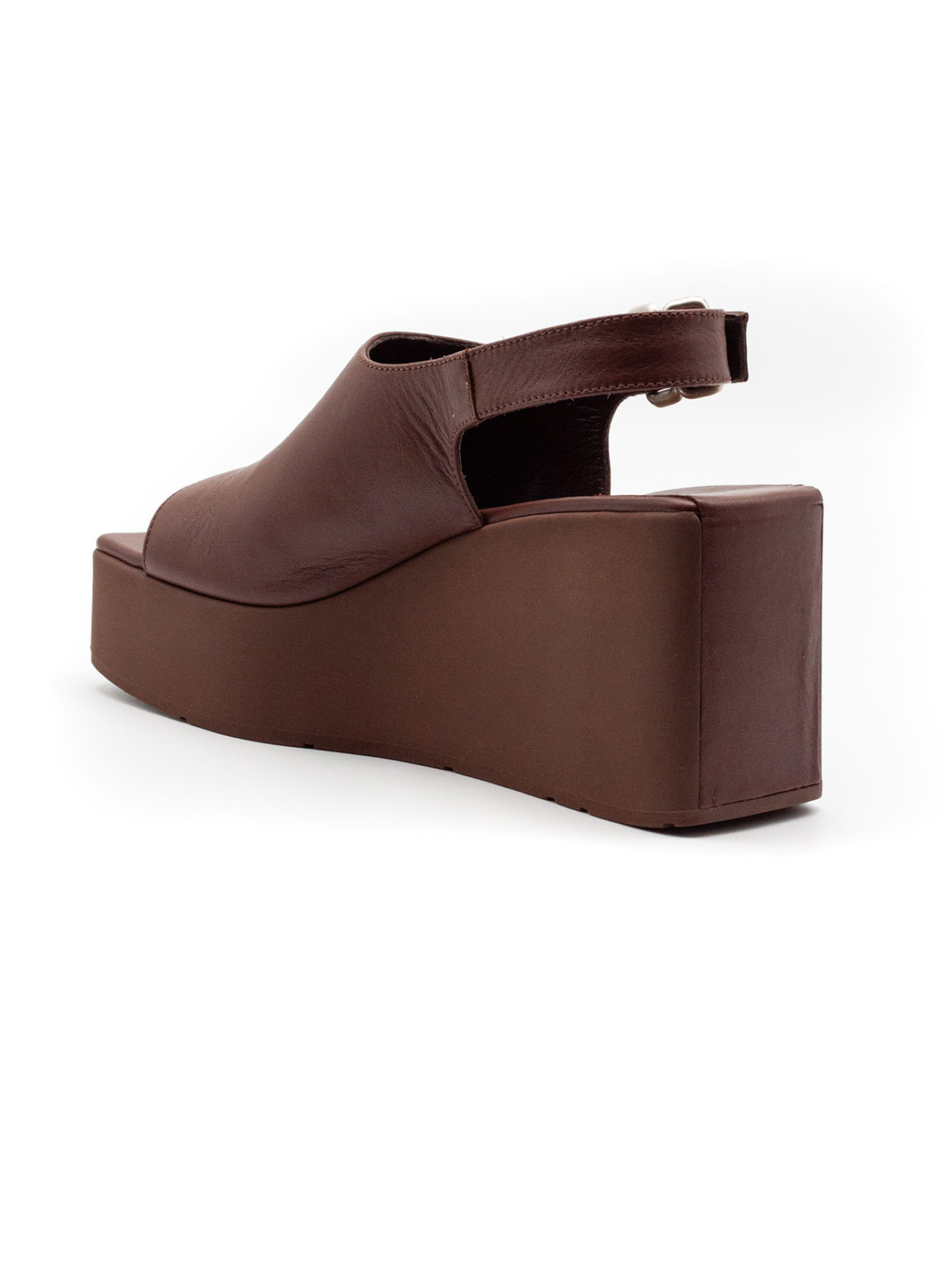 Sandalo Zeppa in pelle liscia color ebano, cinturino regolabile a fibbia per una calzata stabile e confortevole. Sottopiede anatomico rivestito in pelle e zeppa in gomma leggera, altezza tacco 85mm